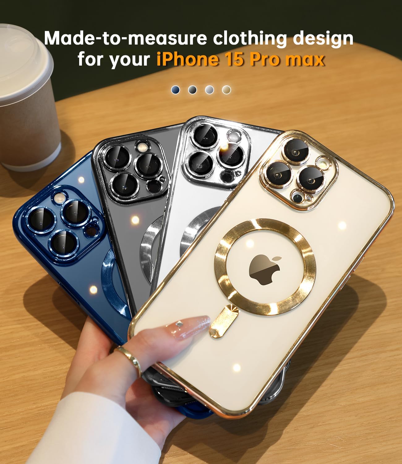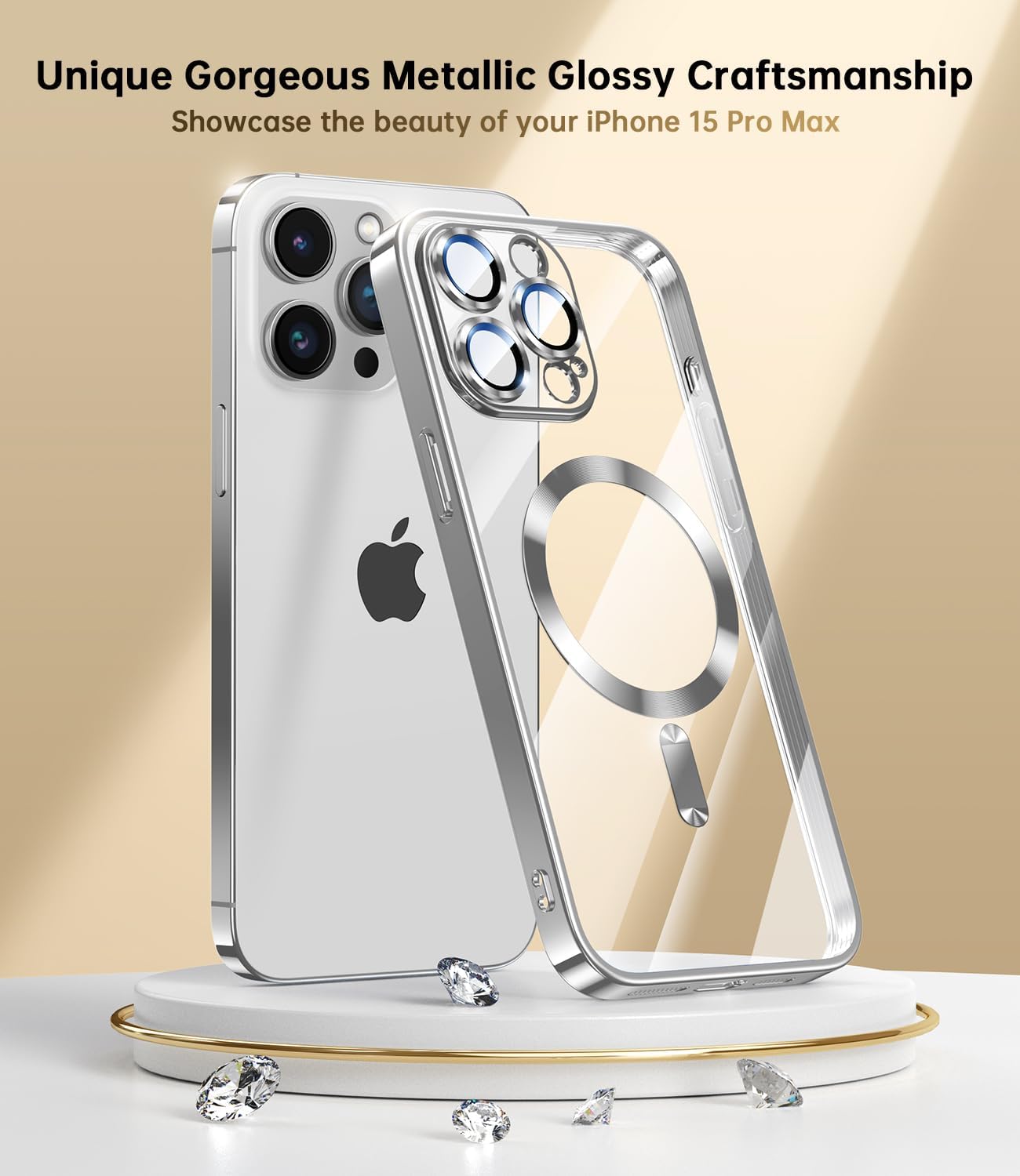 Waldeng for iPhone 15 Pro Max Case with Integrated Camera Lens Protection, [Seamless Work with Magsafe] [Metallic Glossy Soft Bumper], Diamond Clear Stylish Case for iPhone 15 Pro Max, Blue Titanium
