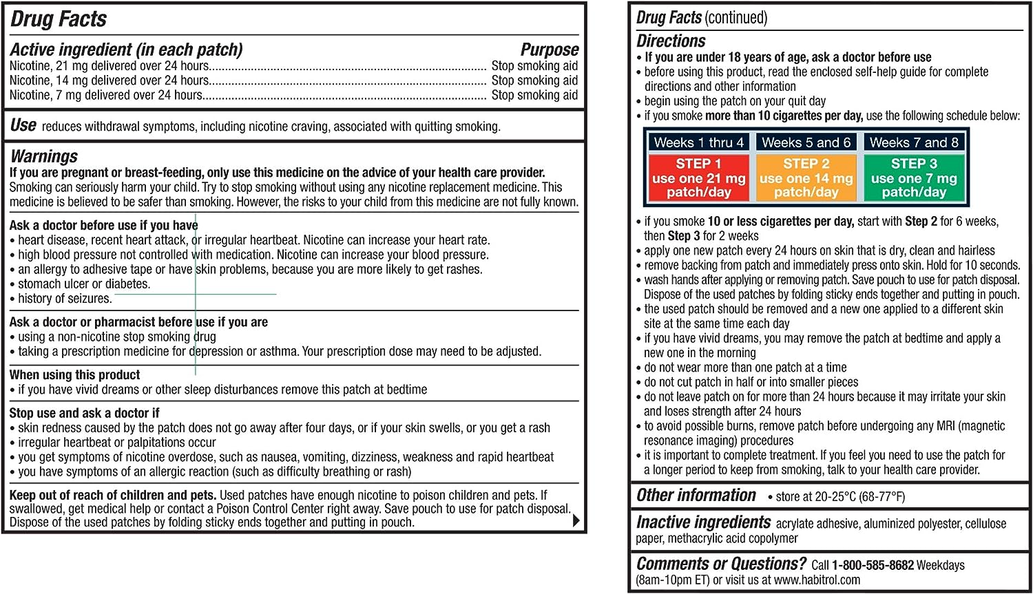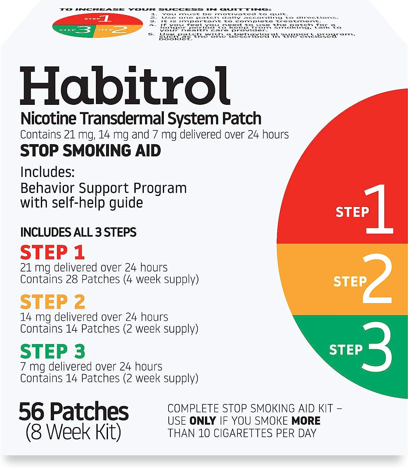 • Habitrol Nicotine Patches come in three decreasing nicotine levels. During our 8-week step-down program, you’ll work your way through these steps, gradually reducing your nicotine dependency and improving your chances of quitting.