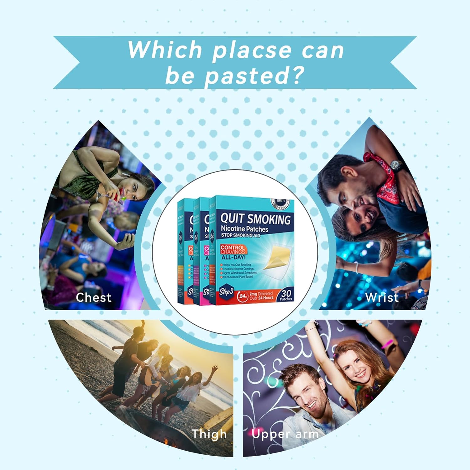 • Application place: Our patches provide a easy and gentle way to stop by applying on the wrist, upper arm, chest and thigh. After completing 3 steps of quit smoking patch application, it makes you quit smoking easily.