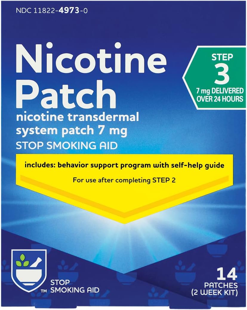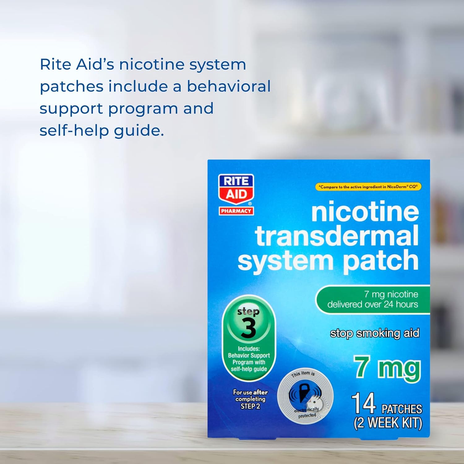 • 7 MG NICOTINE REDUCES CRAVINGS: Rite Aid Nicotine Transdermal System Patches, Step 3, have 7 mg Nicotine to help reduce your cigarette cravings. Compare Rite Aid to the active ingredient in top national brands and quit smoking at a fraction of the cost.