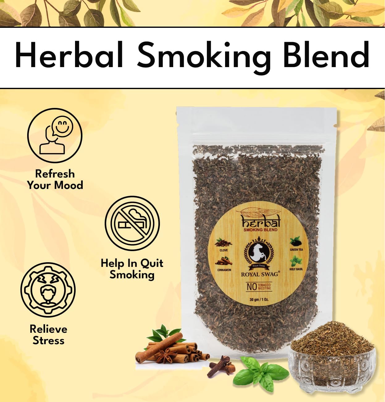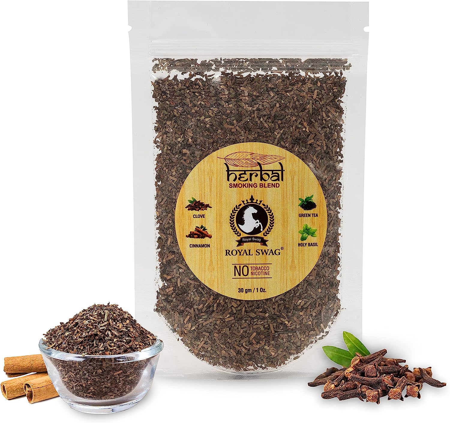 Royal Swag Herbal Mixture Blend is 100 percent Natural and ayurvedic Herbs and made in India which is know for it ayurvedic herbs quality. Herbal Smoking Blend Consist of the following major Ingredients and herbs Green Tea, Clove, Holy Basil, Cinnamon, Liquorice etc. This herbal Smoking Blend Used with Herbal Cigarette roll your own, Pipe. Tobacco Free - Nicotine Free herbal mixture. The herbal mixture is a blend of the natural and finest ayurvedic herb with zero harm effect as the ingredient used it is suitable and consider good health. Best for rolling your own herbal smokes or enjoying out of a pipe, this herbal loose leaf blend is a perfect choice. The 1oz bag is re-sealable ziplock for the freshness of the herbal mixture.