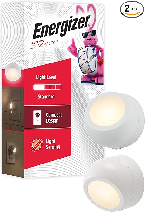 Energizer Rotating LED Night Light, 2 Pack, Plug-in, 360ë� Rotation, Dusk-to-Dawn Sensor, Home Decor, Ideal for Bedroom, Bathroom, Nursery, Hallway, Kitchen, Staircase, 40293