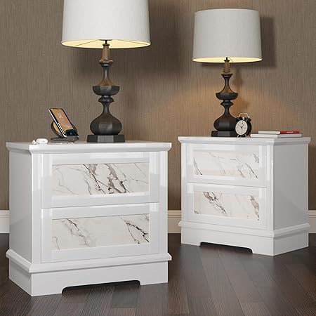 AMERLIFE Luxury Natural Marble Nightstand Set of 2 with Drawers, High Gloss Side Tables in Living Room, Storage End Table for Bedroom with Hidden Door, White