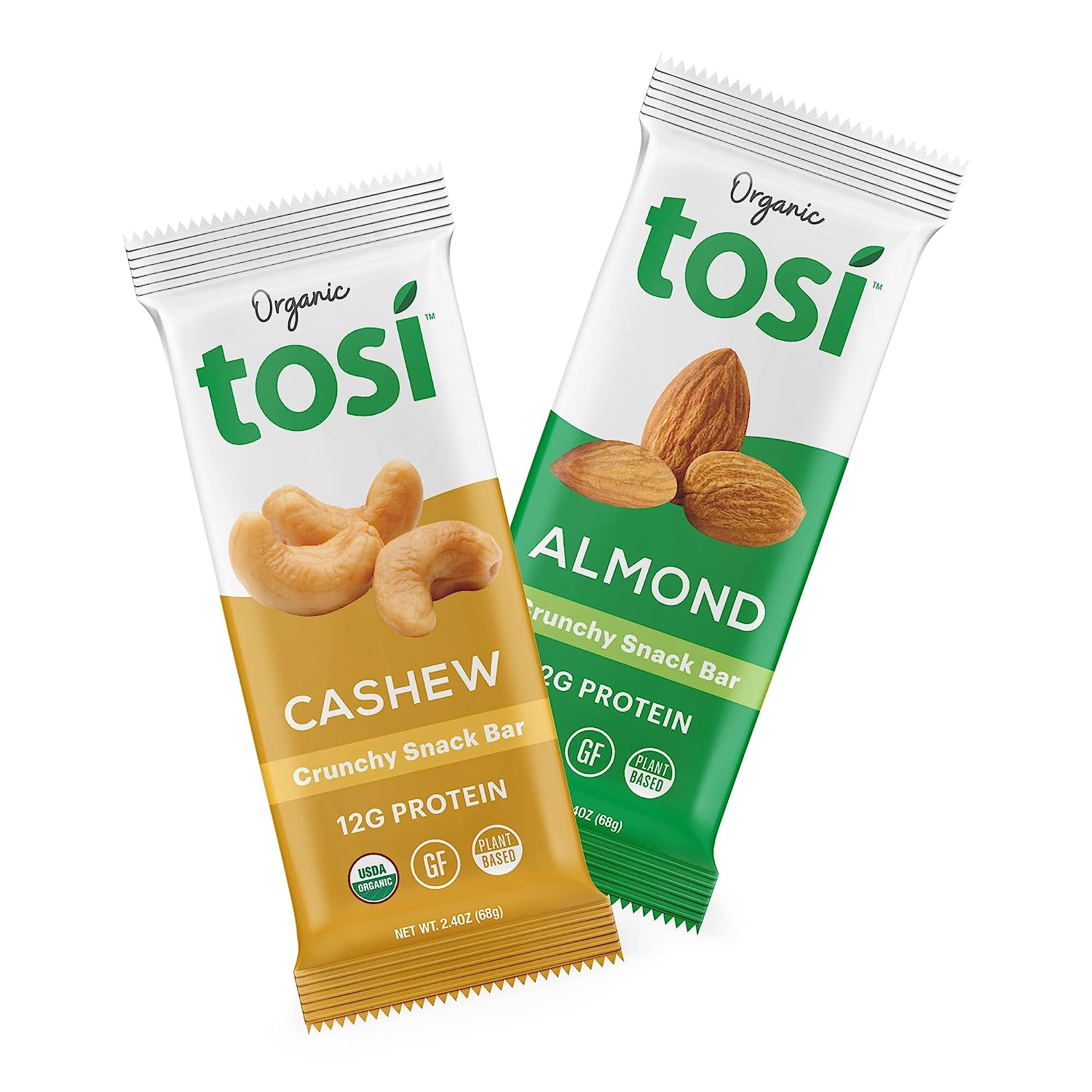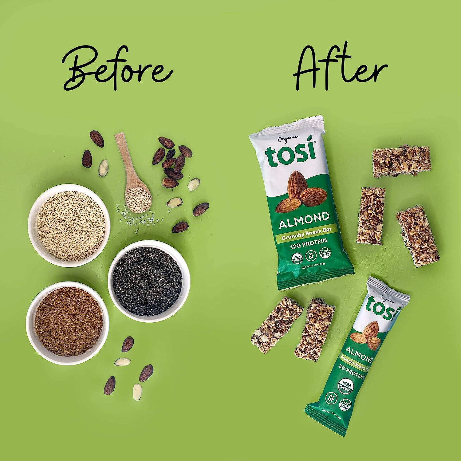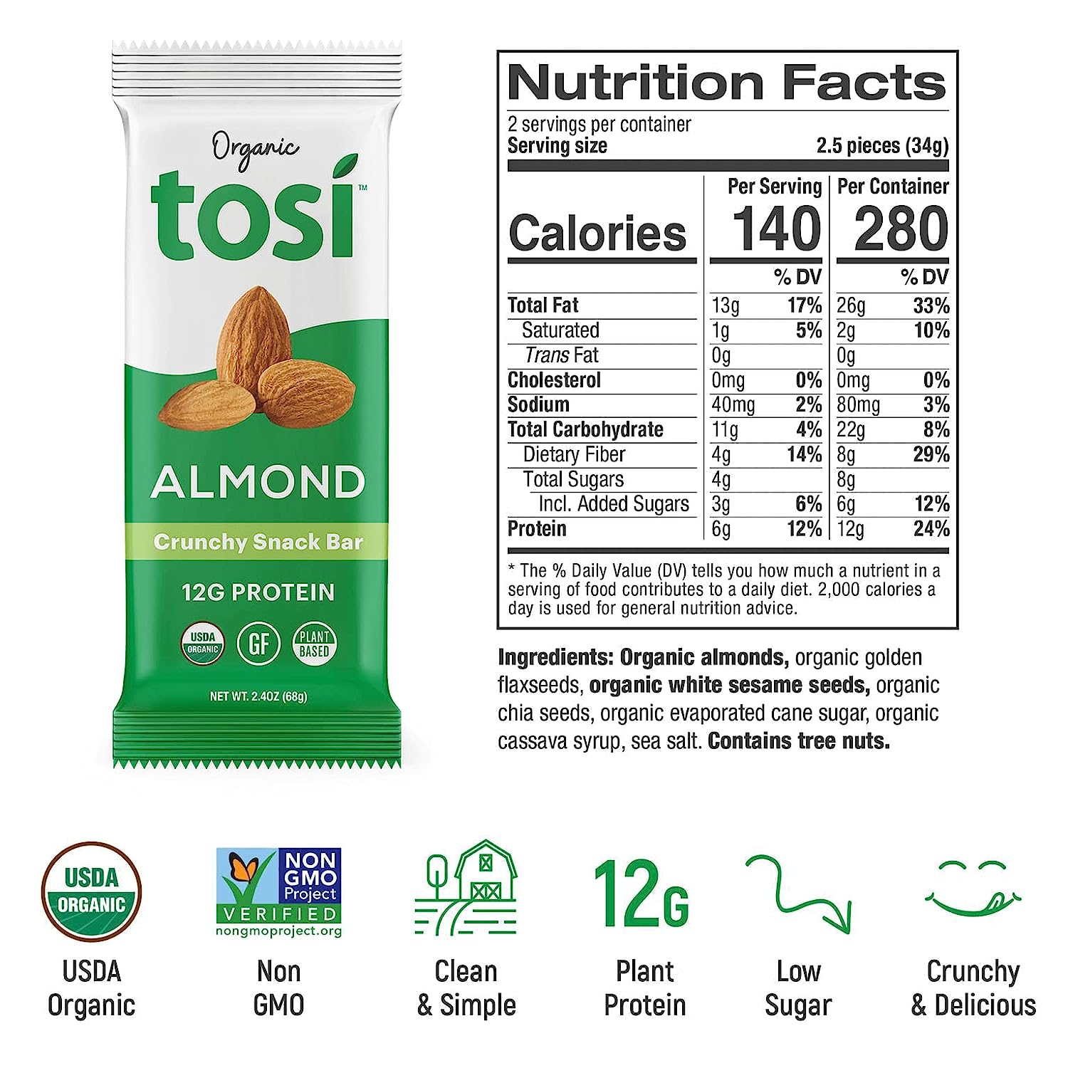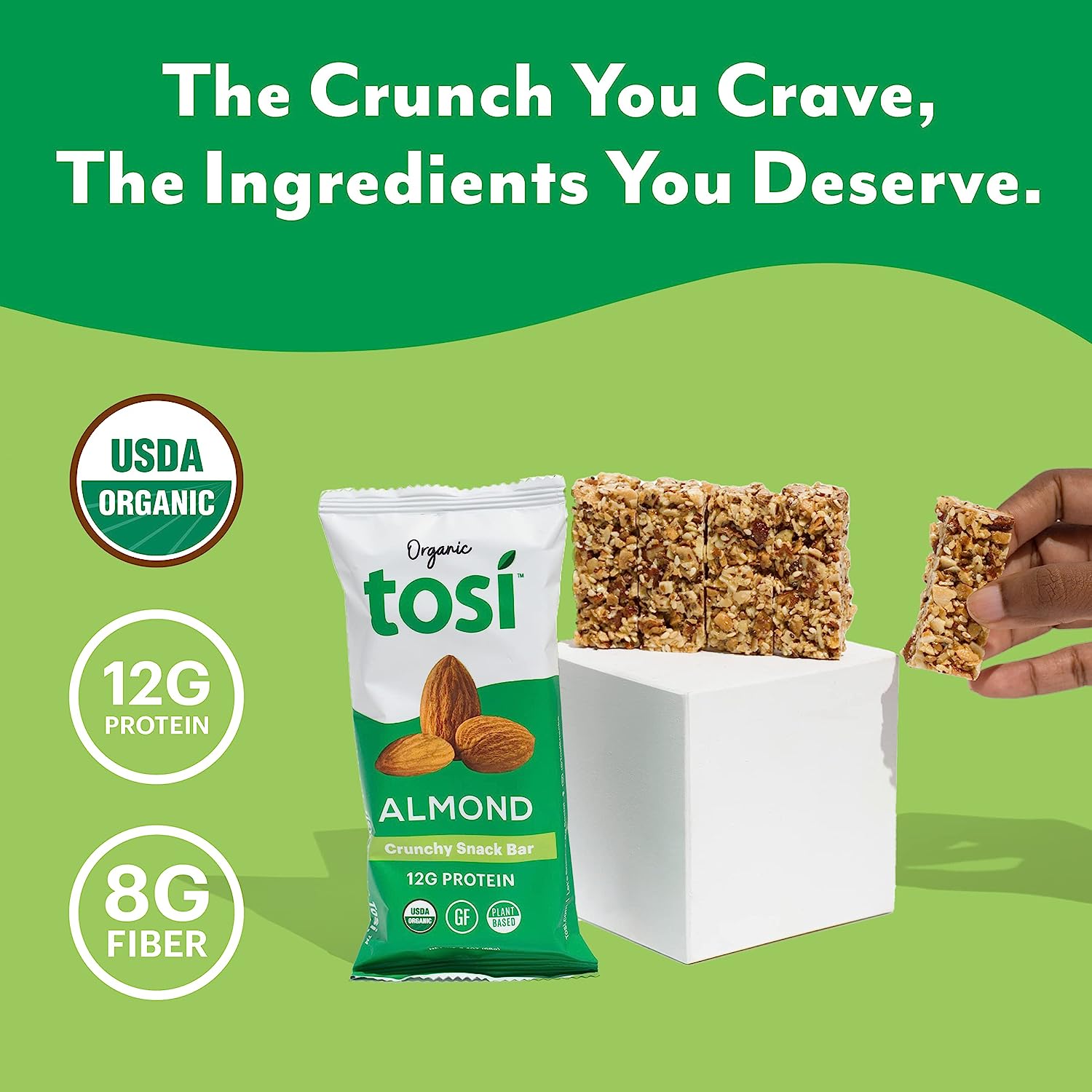 Tosi Plant Based Protein Bars, 12G Protein (Pack of 12, 2.4oz Bars), Vegan Bars, Crunchy Snacks, Almond Bars with Flax & Chia Seeds, Gluten Free, Omega 3s