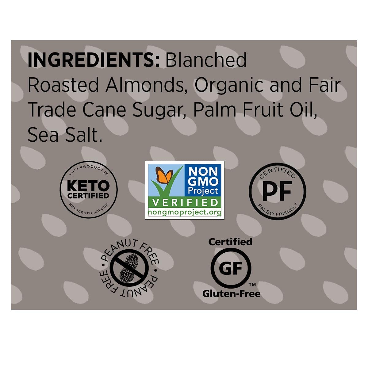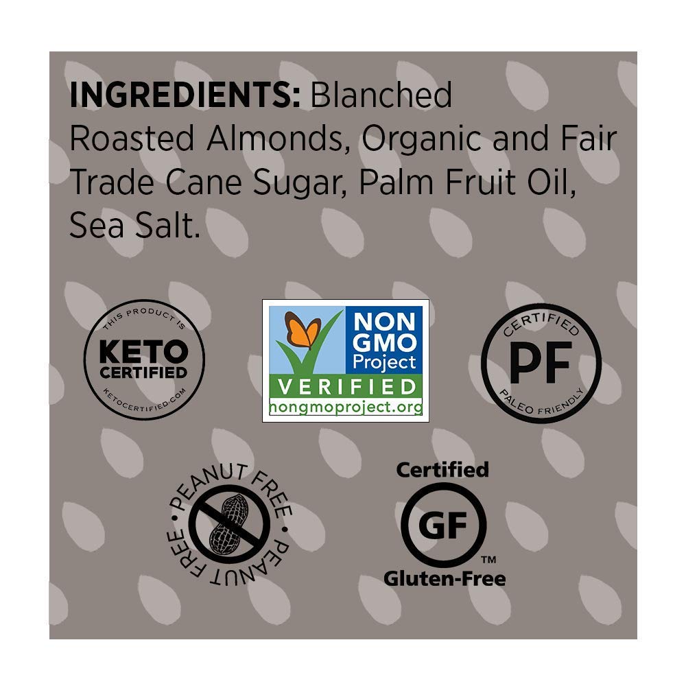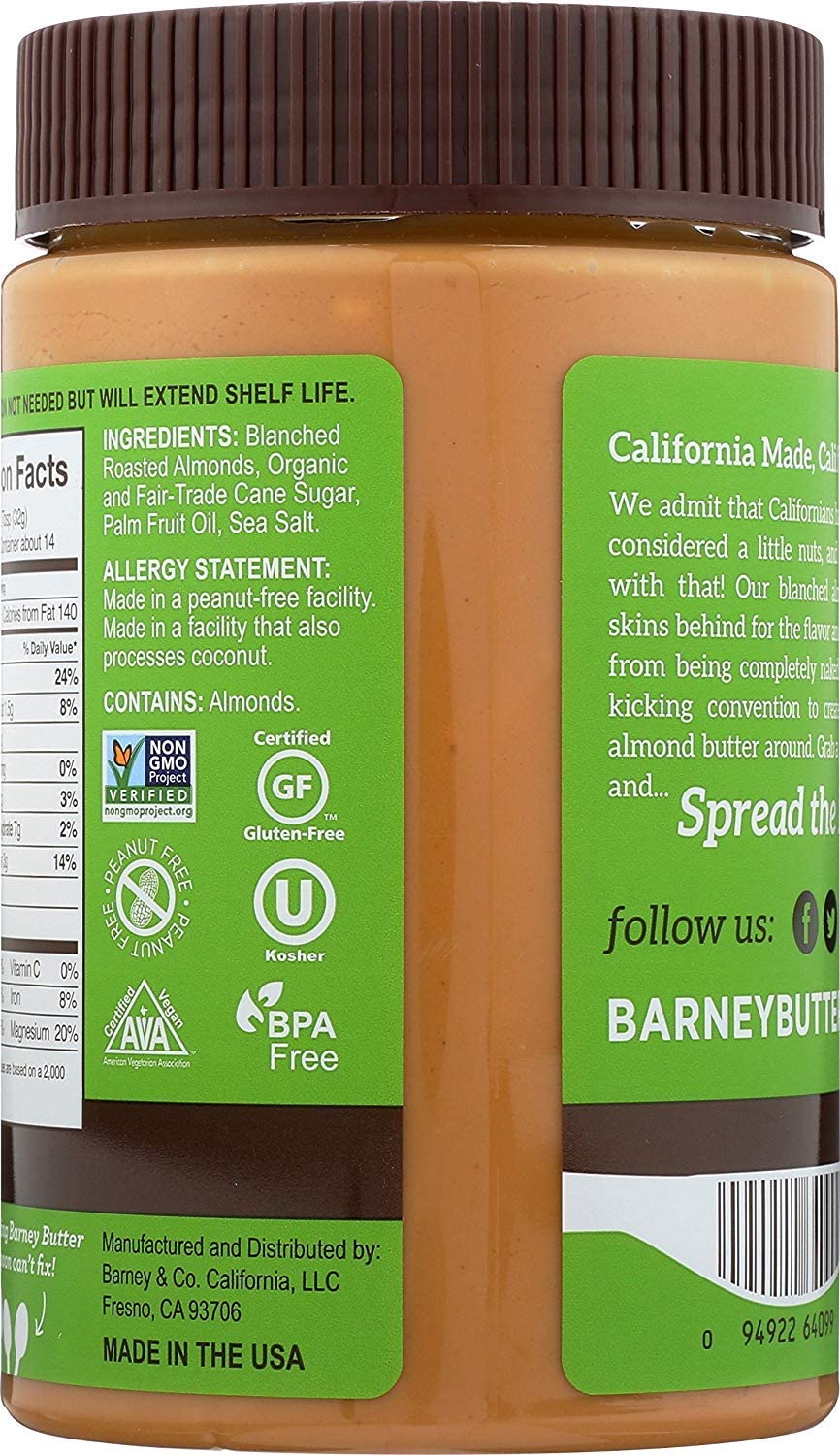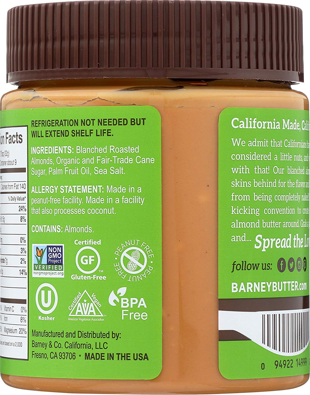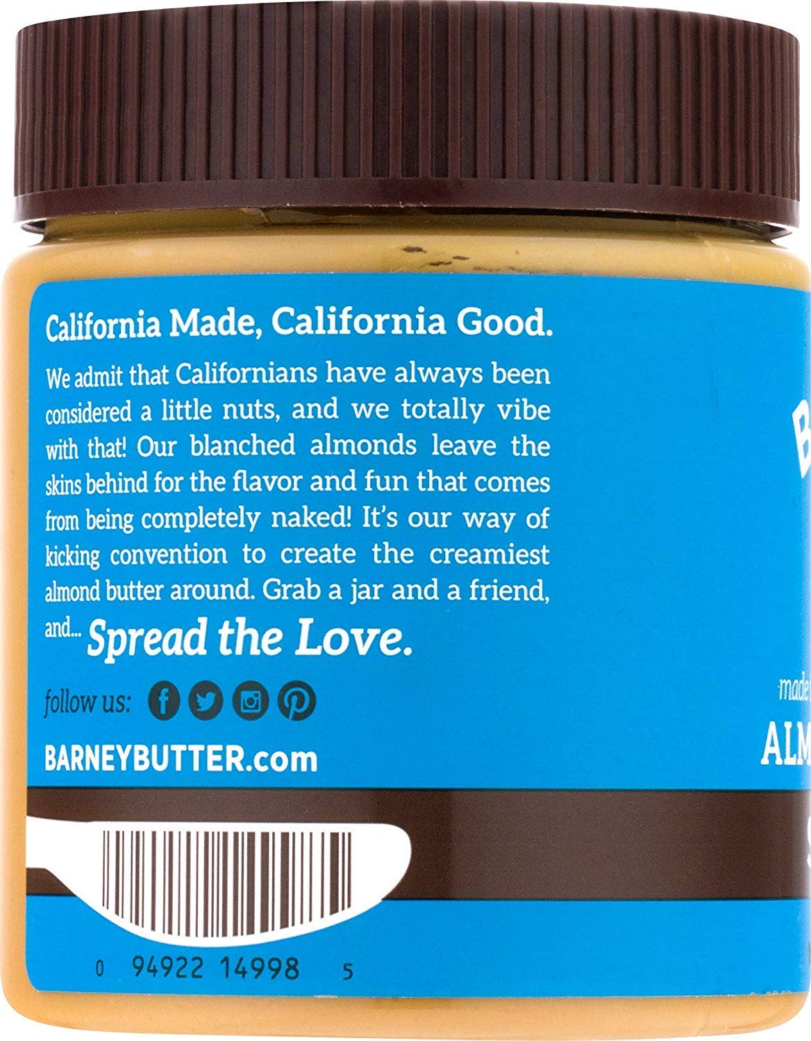 MADE IN AMERICA WITH CALIFORNIA ALMONDS Our “original, classic”, super-smooth, and spreadable Barney Almond Butter. Made with skin-free roasted almonds, which makes for a grit-free texture and mild almond taste. Best taste and texture of any almond butter around! Slightly sweetened and salted.