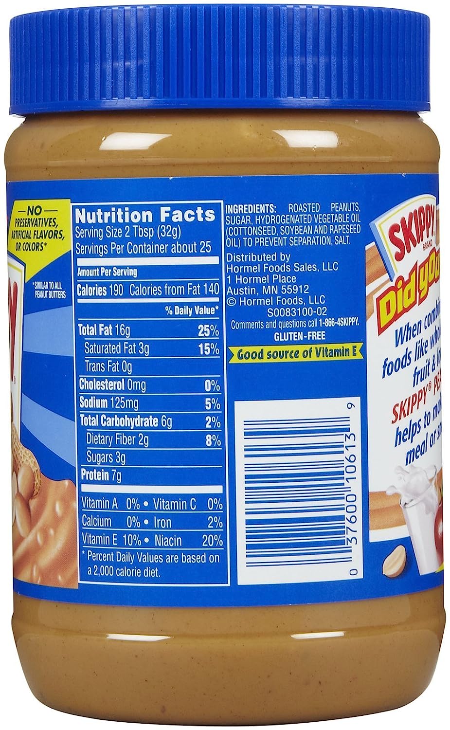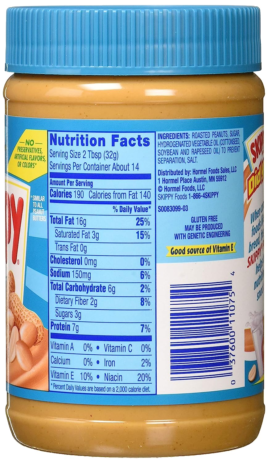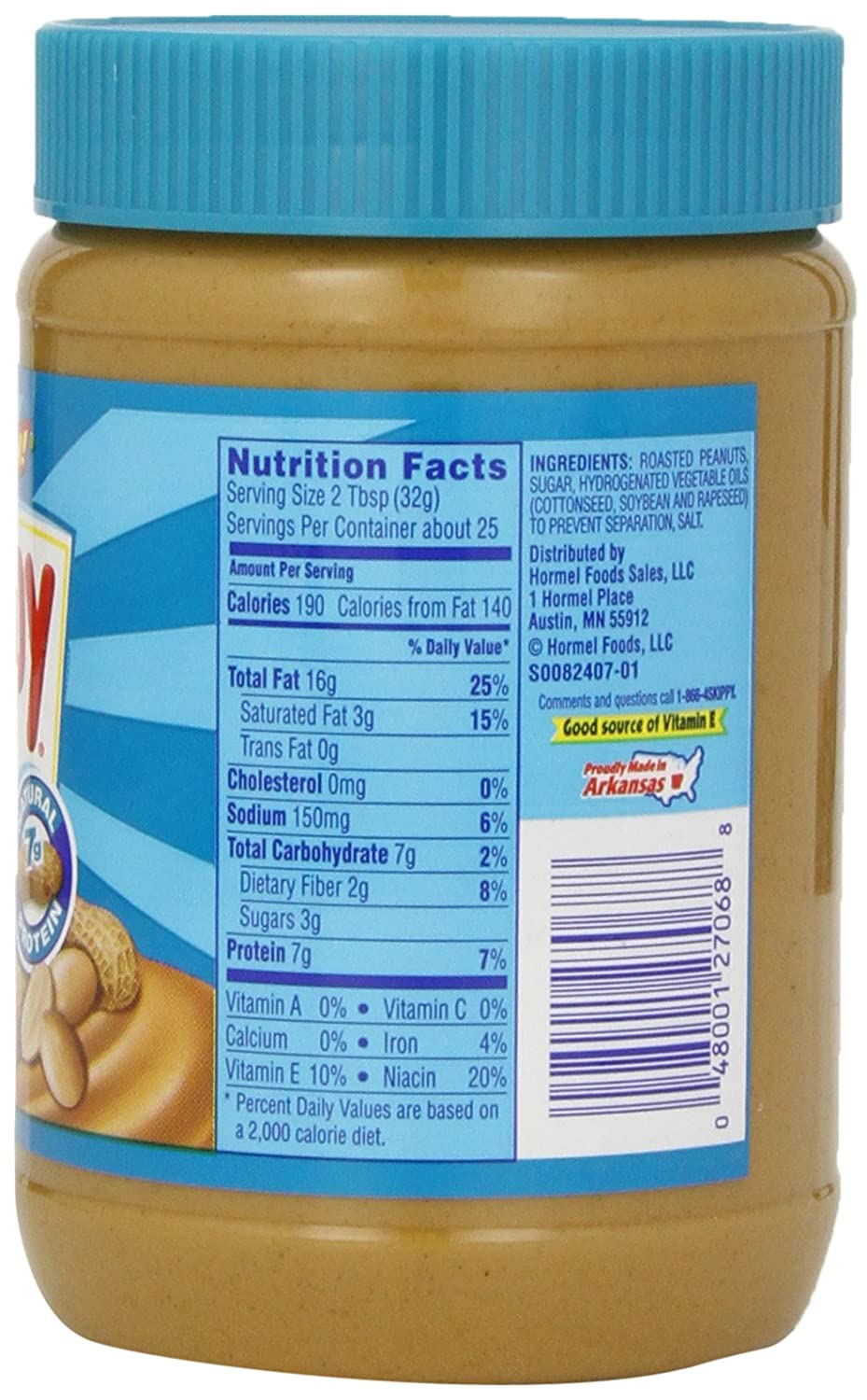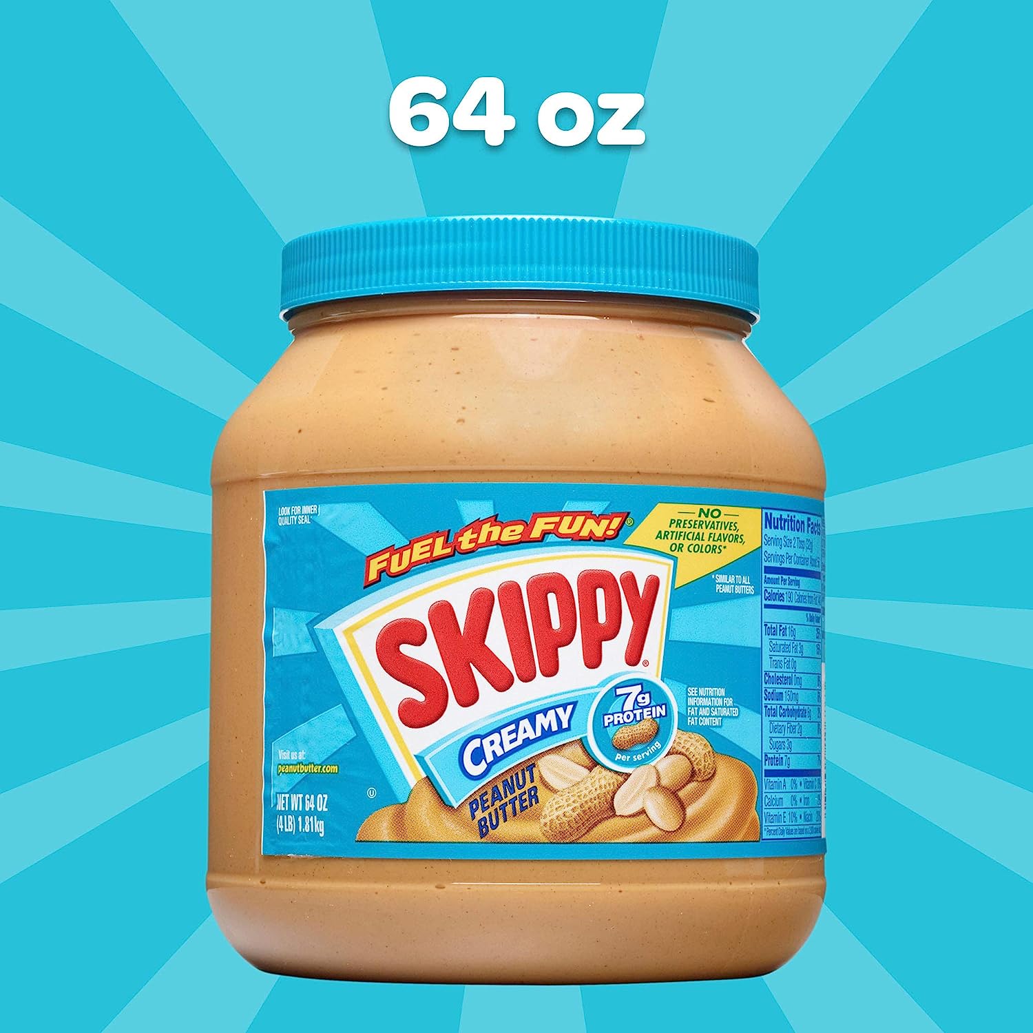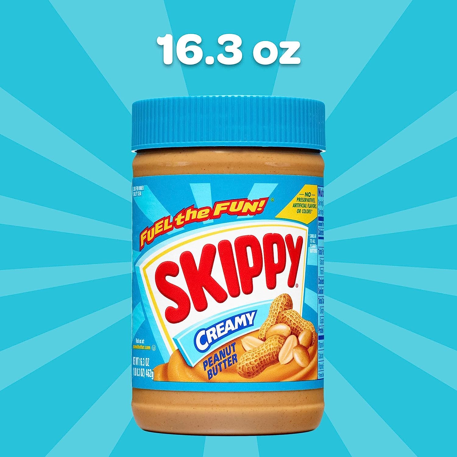 Skippy, the provider for all your peanut butter needs, produces quality peanut butter in the way that you love. Perfect for sandwiches, snacks, or a much-needed dessert; Skippy Creamy Peanut Butter will be a family favorite. This tasty and creamy treat is just what you need when you need a quick bite to go.