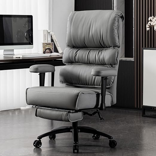 Big and Tall Office Chair 400LBS, High Back Executive Office Chair Wide Seat, Ergonomic Office Chair with Foot Rest, Leather Office Chair Lumbar Support for Back Pain Relief, Light Grey