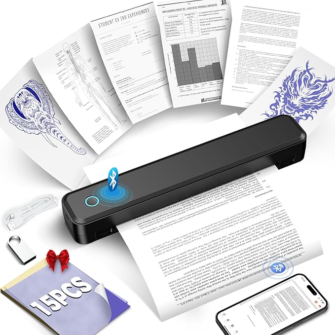Aixiqee Portable Thermal Printer, Multifunction Bluetooth Wireless Printer, High Definition, Compatible with iOS, Android, Windows and macOS, USB, Inkless for Home, Office, Travel (Black)
