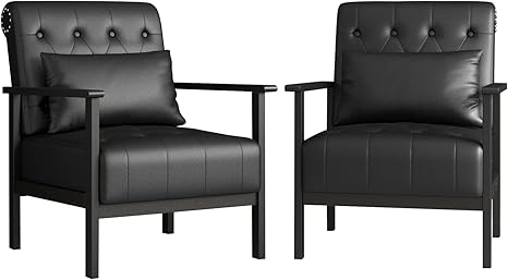 AODAILIHB Black Leather Accent Chairs Set of 2 with Pillow, Mid Century Modern Accent Chair with Arms, Button Tufted Comfy Single Sofa Chair Side Chair for Living Room, Bedroom, Office (2, Black)