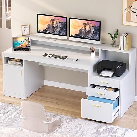 Computer Desk with 3 Drawer & Storage Shelves, Home Office Desk with File Drawer & Cabinet, Writing Study Table with Long Monitor Stand & Printer Shelf, Executive Desk, White