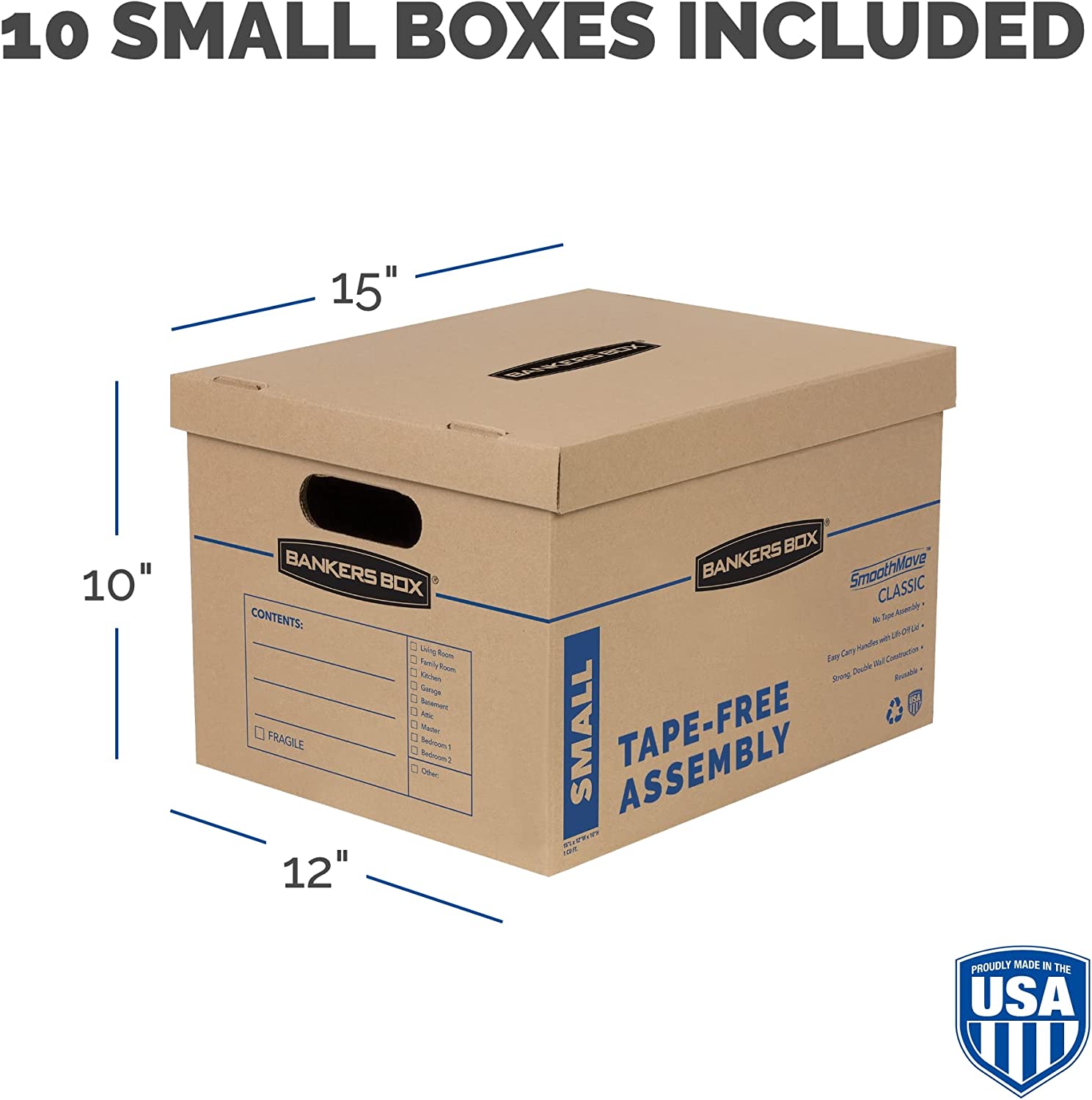 Bankers Box SmoothMove Classic Small Moving Boxes, 10 Pack, Tape-Free Assembly, Easy Carry Handles, 10" x 12" x 15"