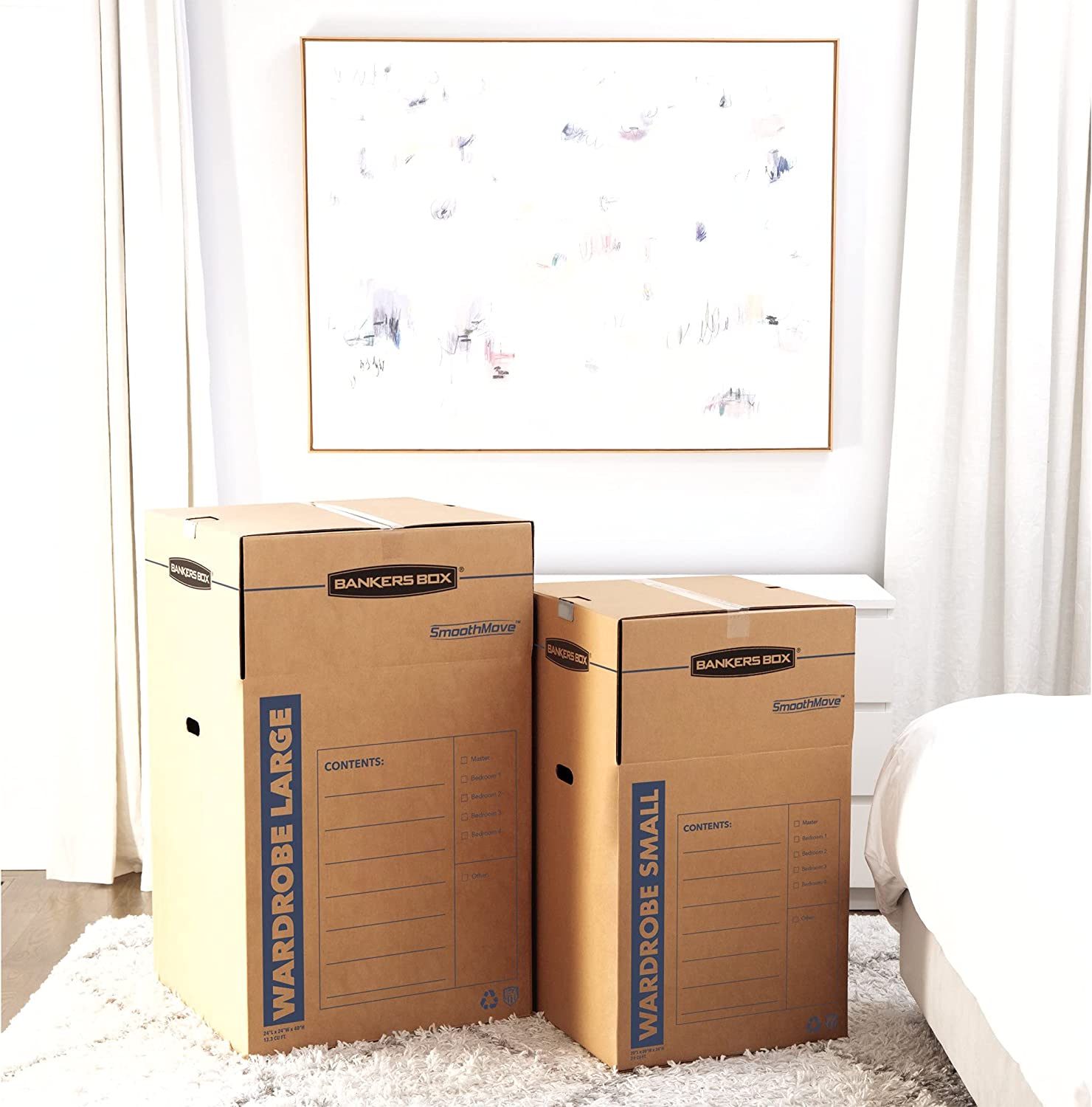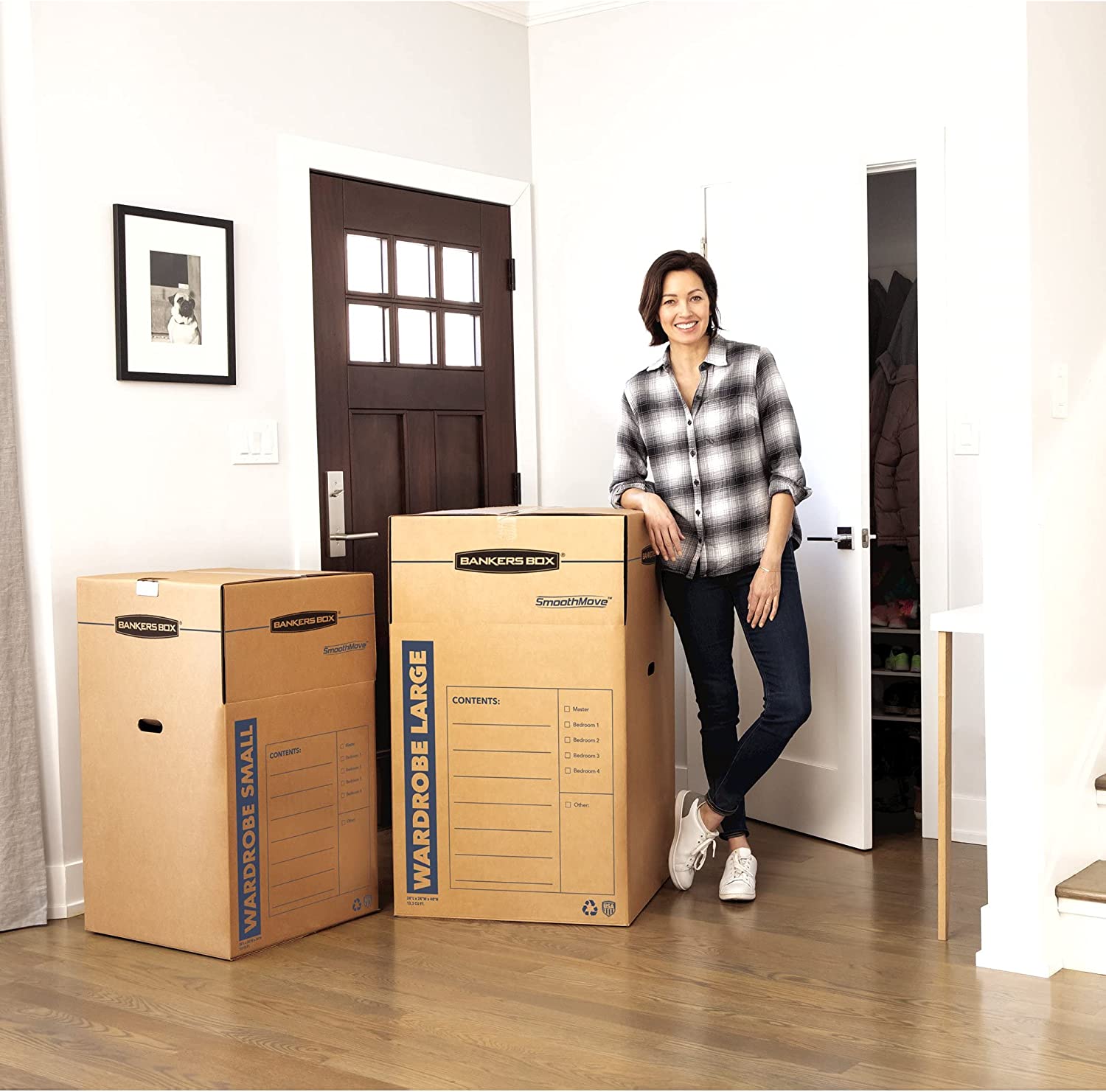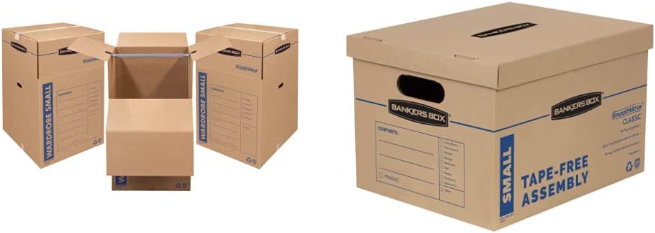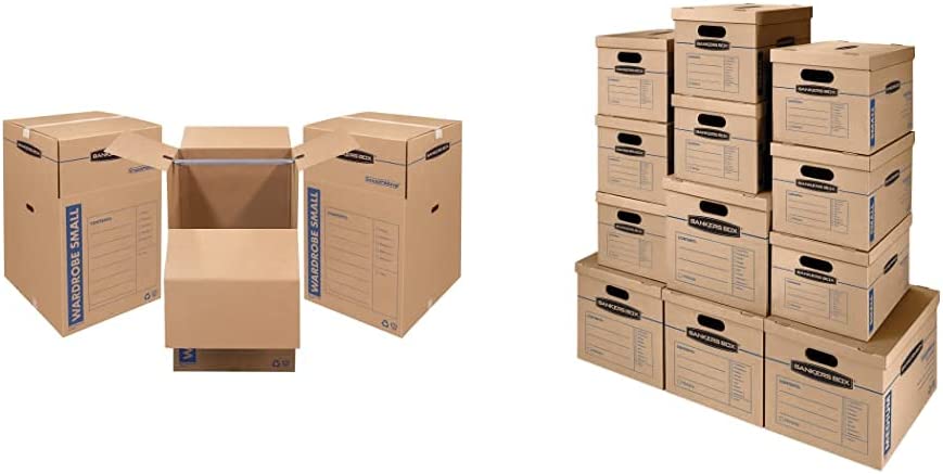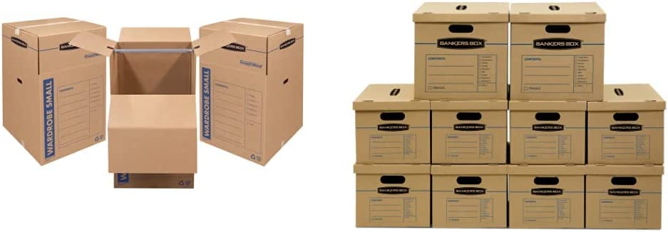 Bankers Box SmoothMove Wardrobe Moving Boxes, Short, 20 x 20 x 34 Inches, 3 Pack (7710902) & SmoothMove Classic Moving Boxes, Tape-Free Assembly, Easy Carry Handles