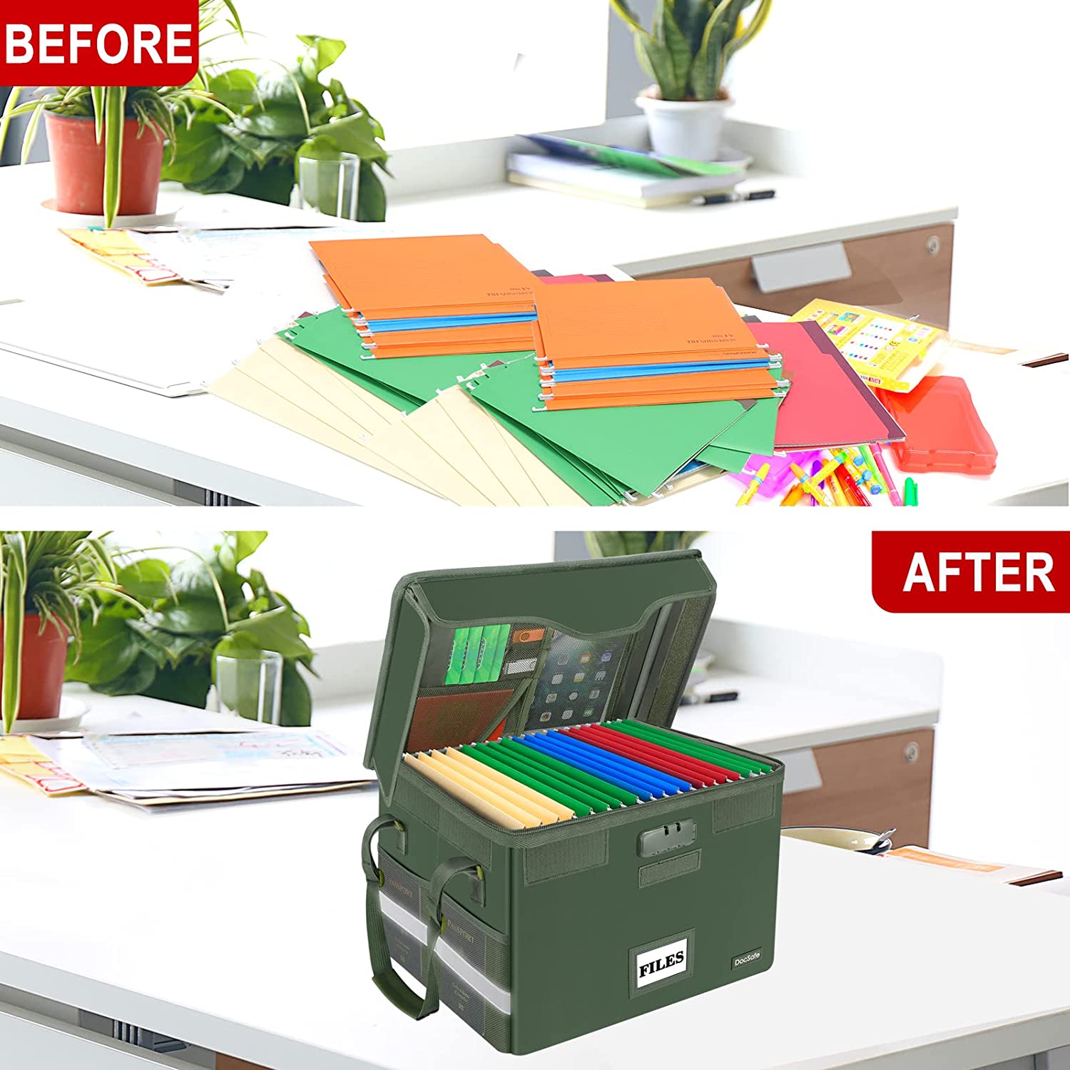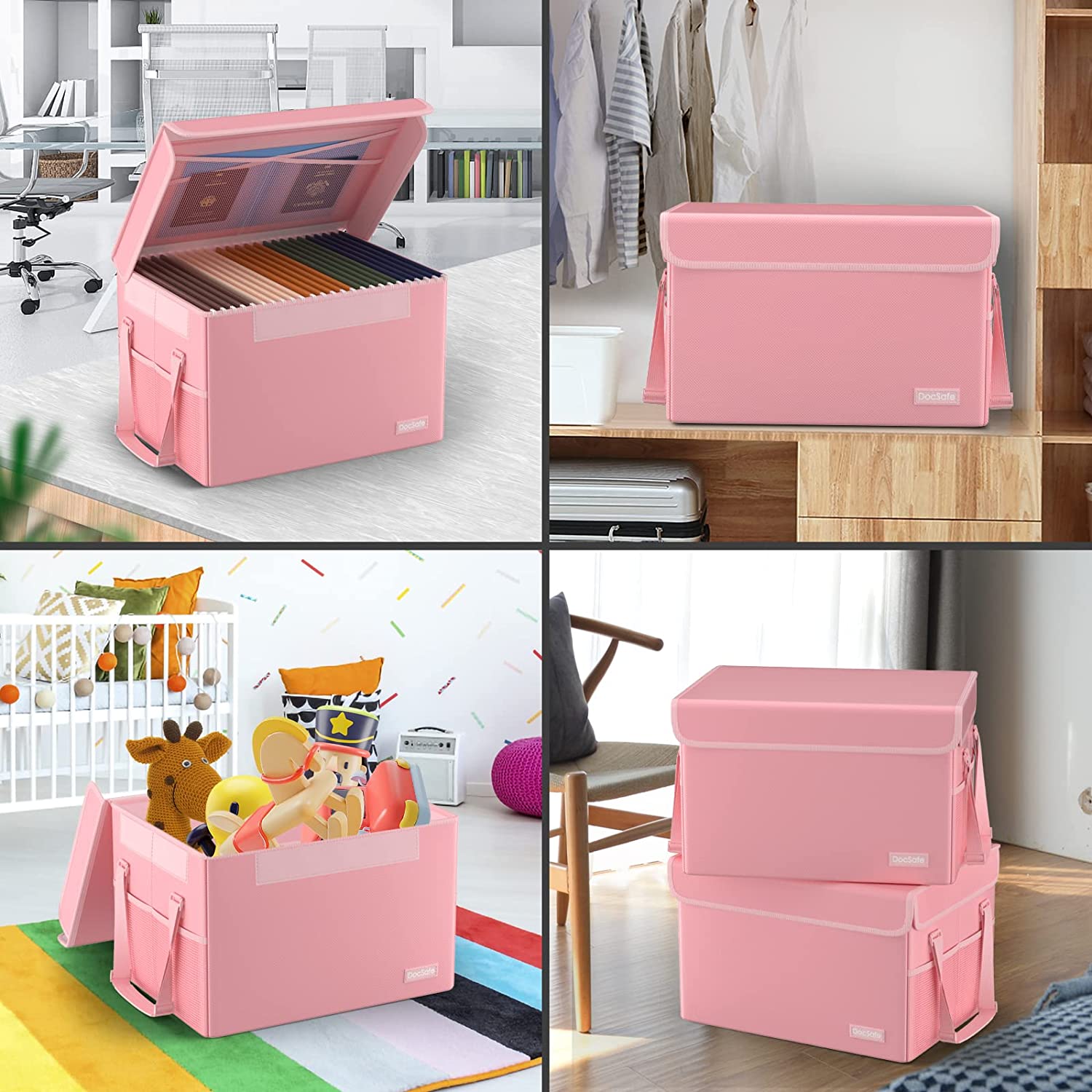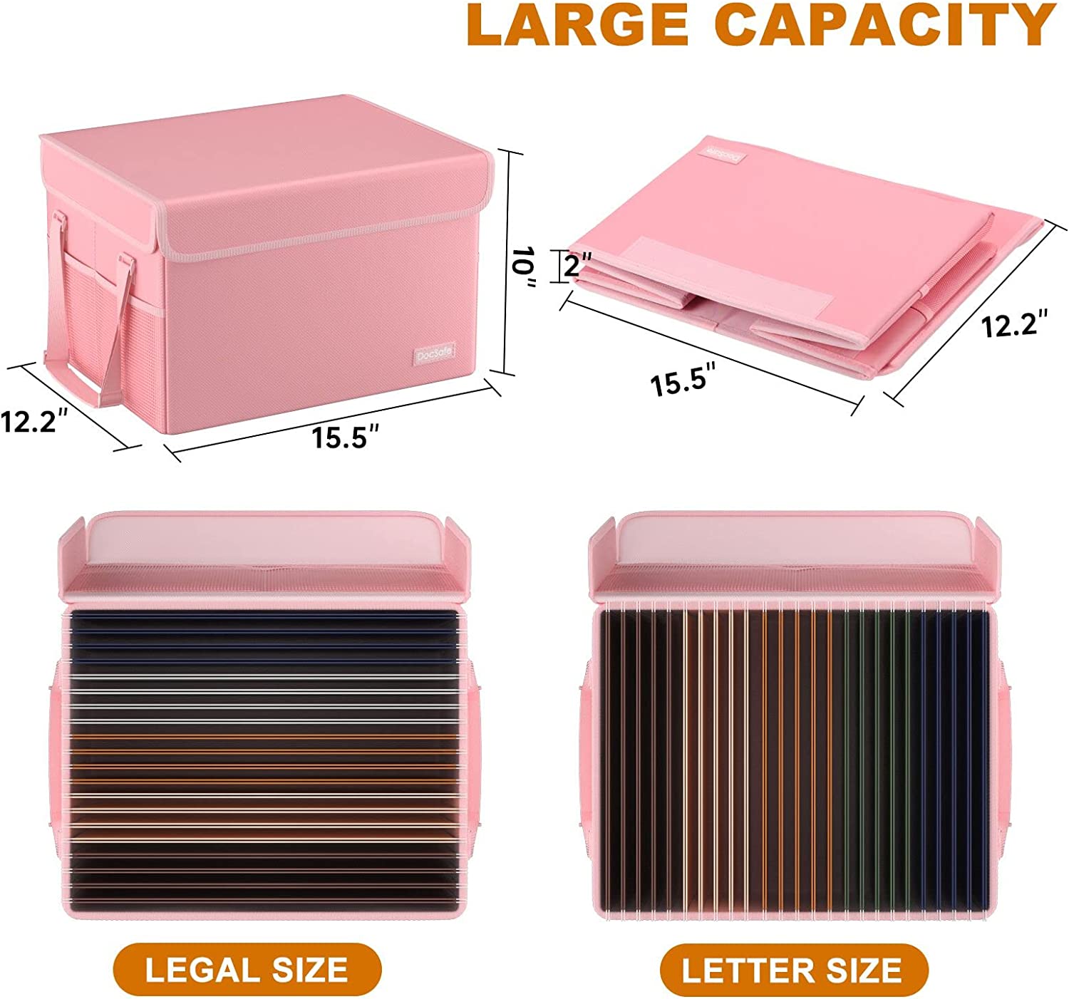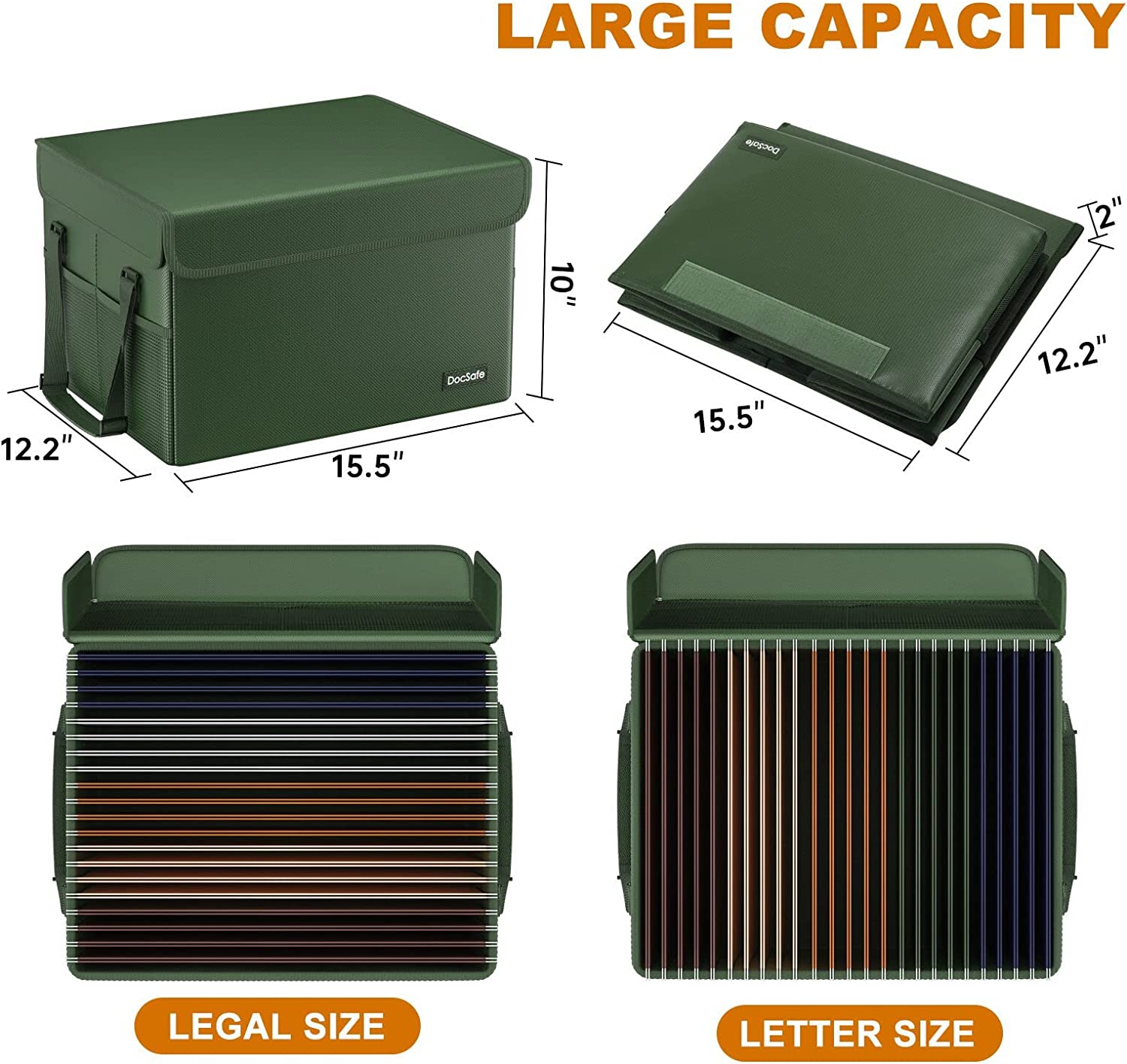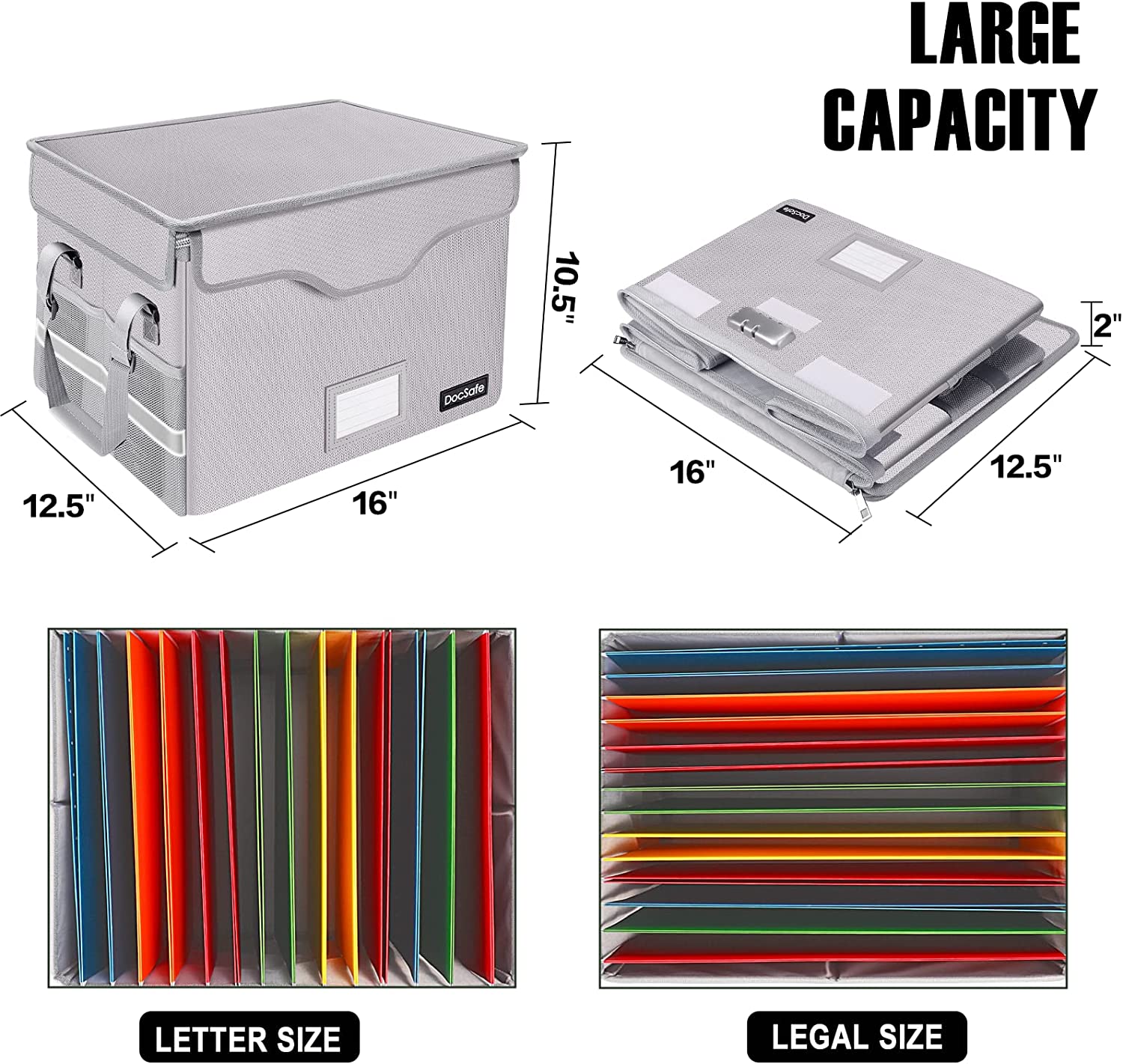 • Large Capacity: 16" x 12.5" x 10.5".Fireproof file cabinet not only can fits both letter and legal size files fitting your filing system, but also can protect your important documents,books,Cards,CDs, DVDs,USBs,albums,passports, social security cards,birth certificates and other valuables because we have designed mesh pockets and tab inserts on the lining of the lid and on the sides of the box.