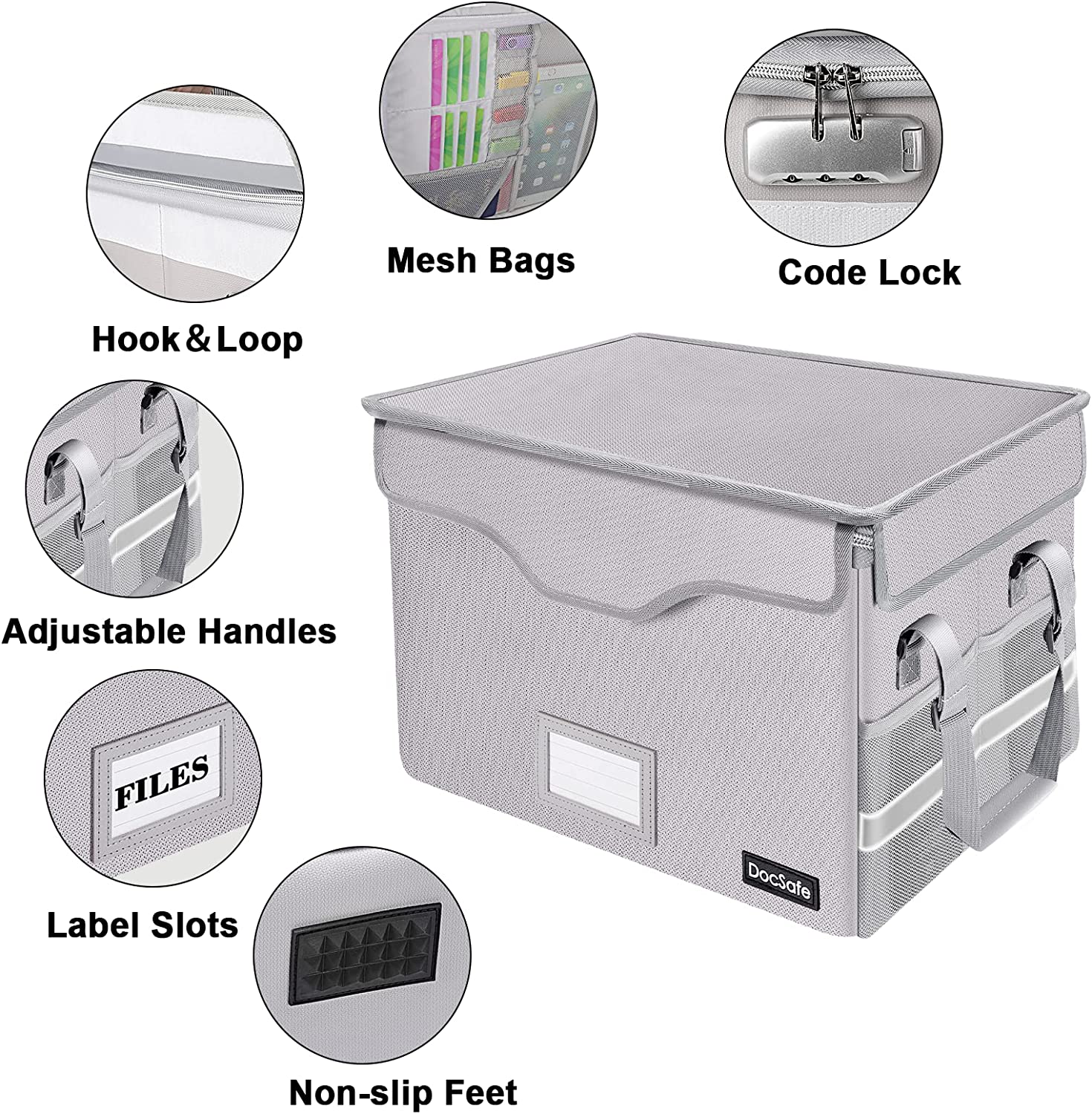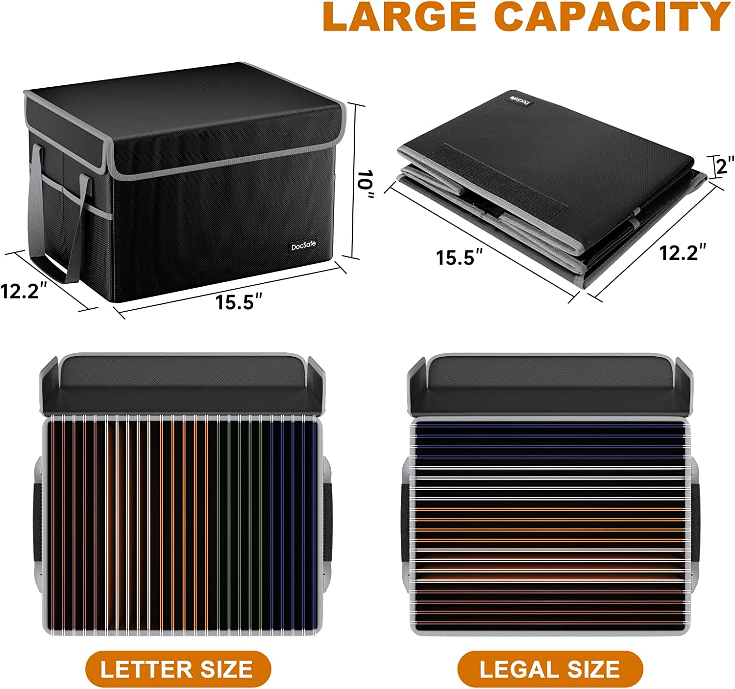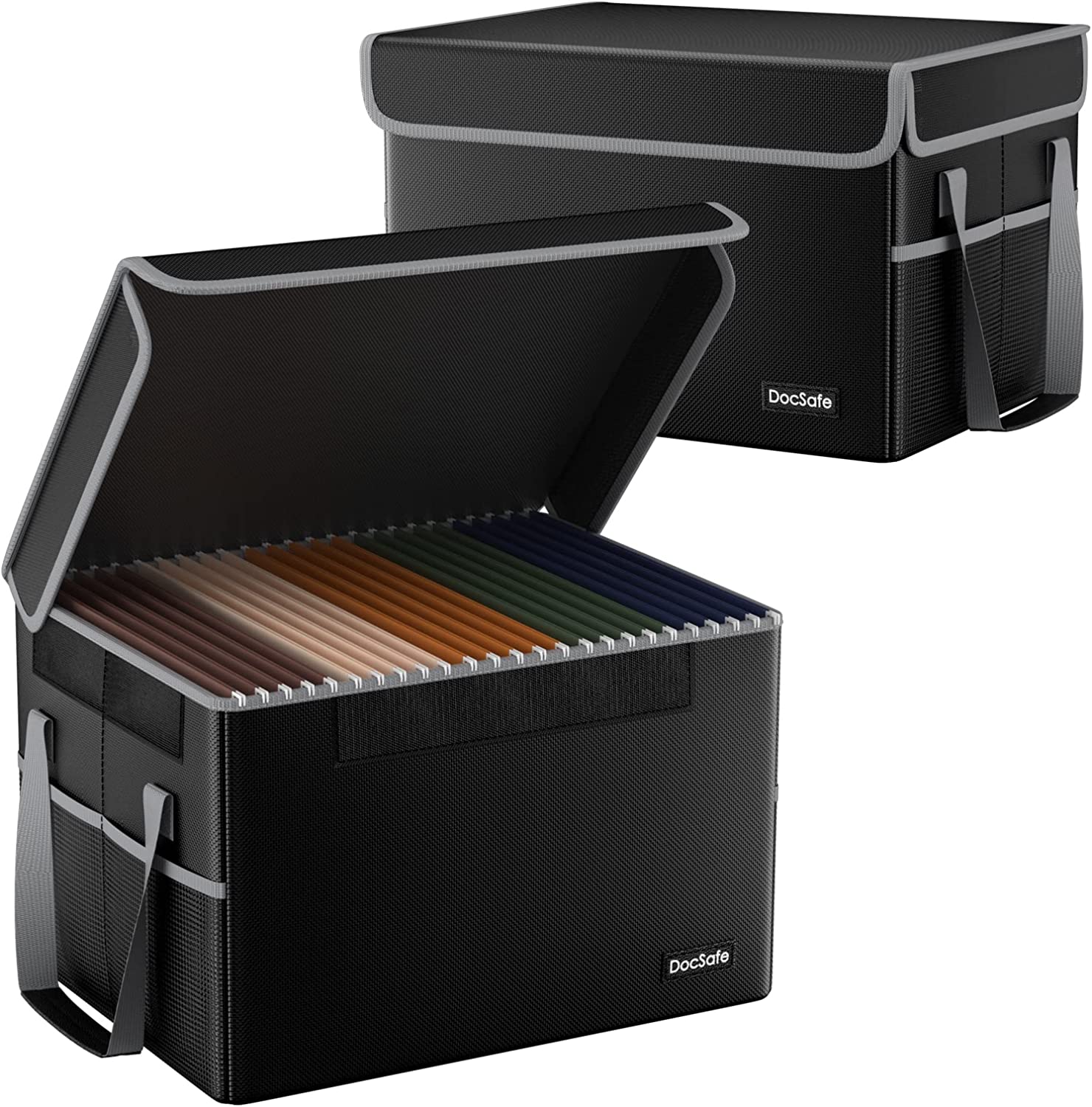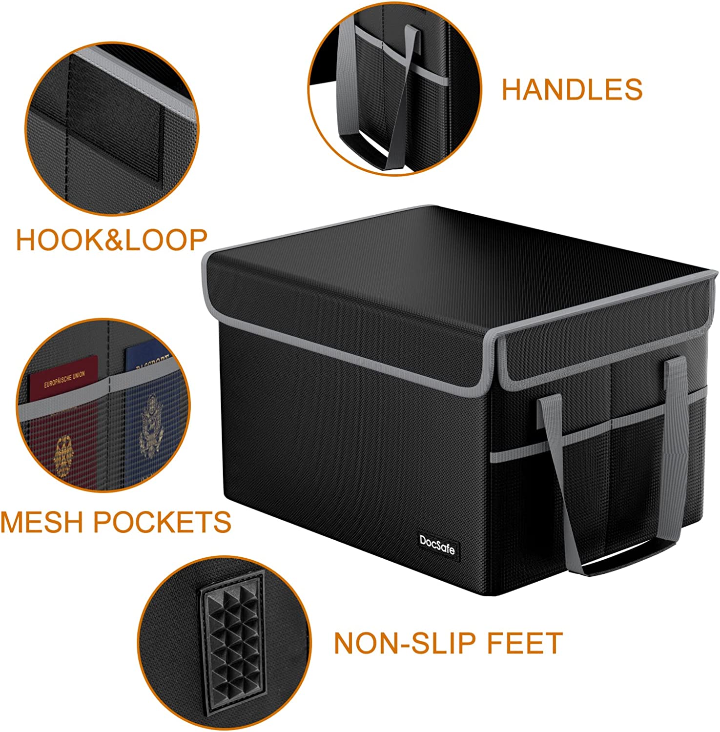 DocSafe File Box Fireproof Document Box with Lock,File Storage Organizer Box with Mesh Pockets,Collapsible Portable File Box Home Office File Cabinet with Handle for Hanging Letter/Legal Folder,Black