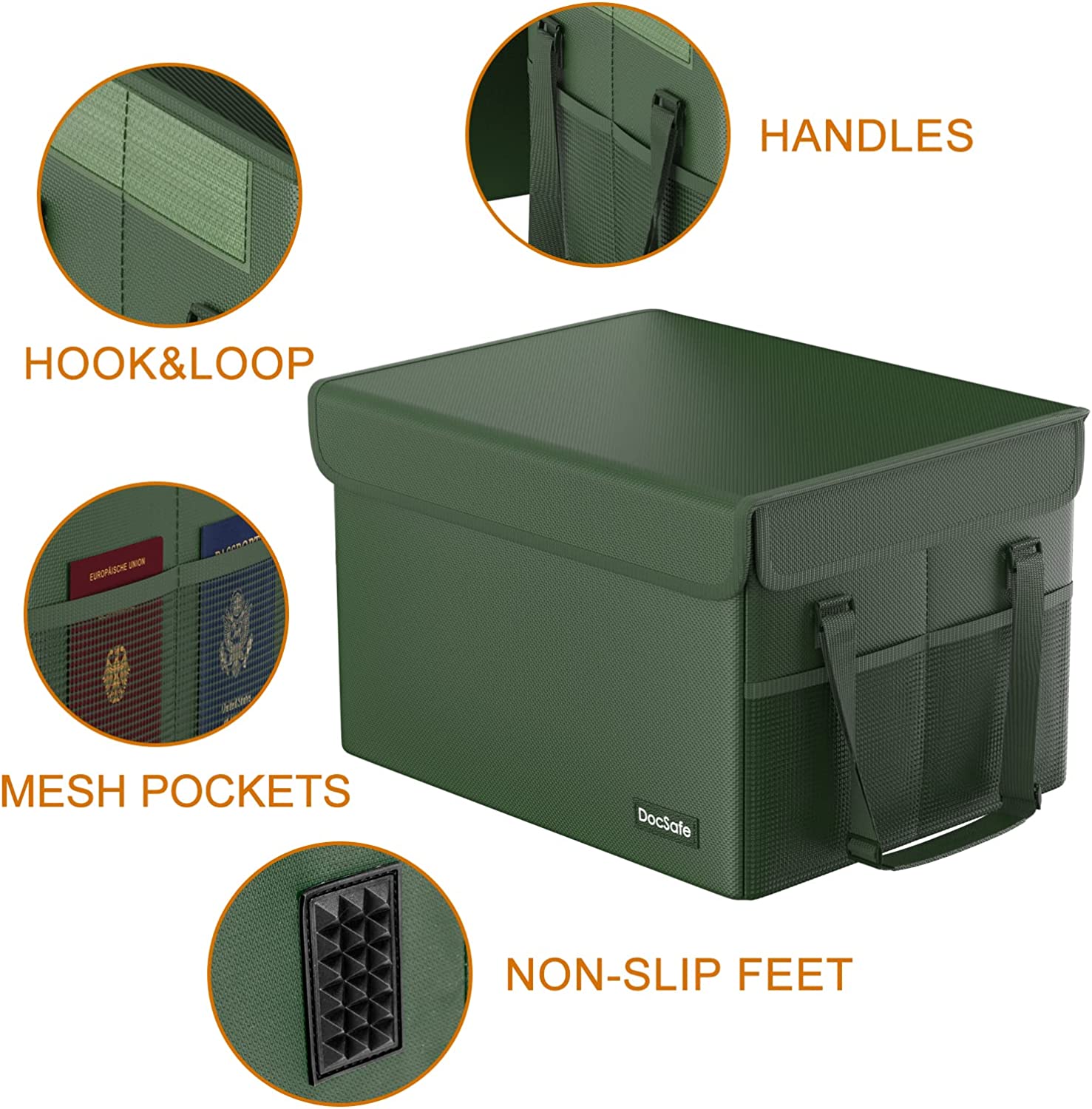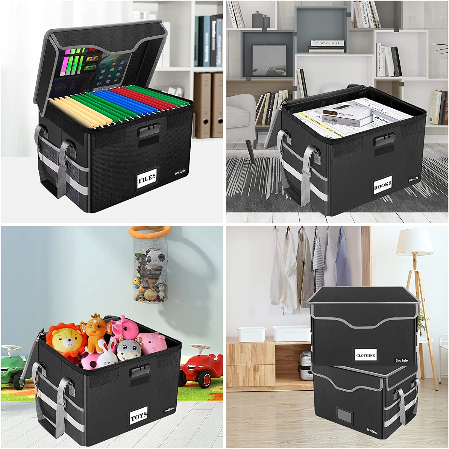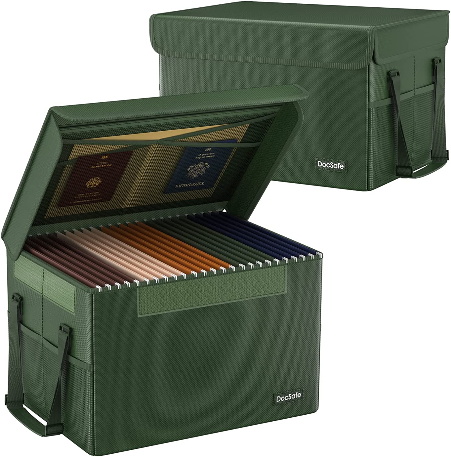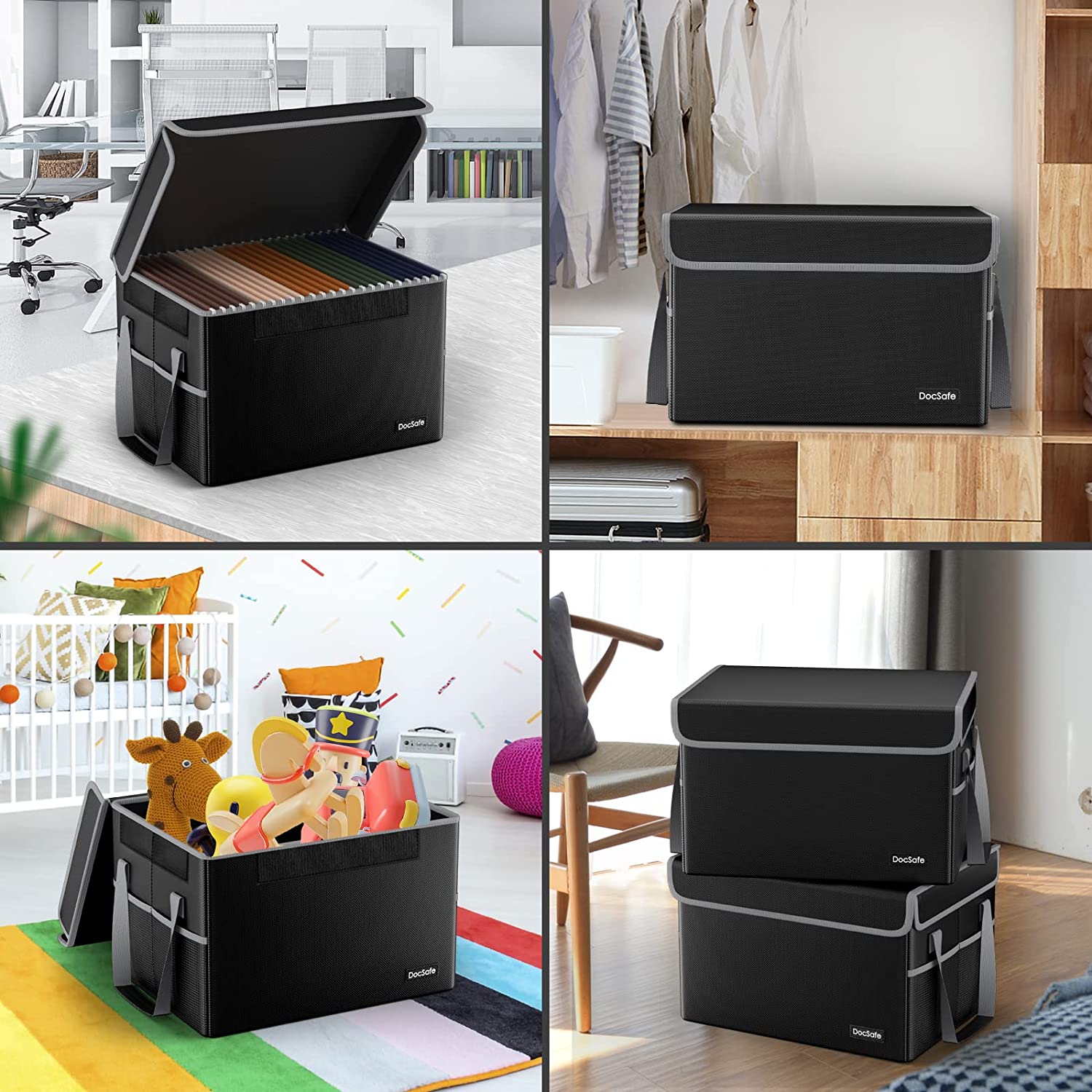 DocSafe File Box Fireproof Document Box with Lock,File Storage Organizer Box with Mesh Pockets,Collapsible Portable File Box Home Office File Cabinet with Handle for Hanging Letter/Legal Folder,Black