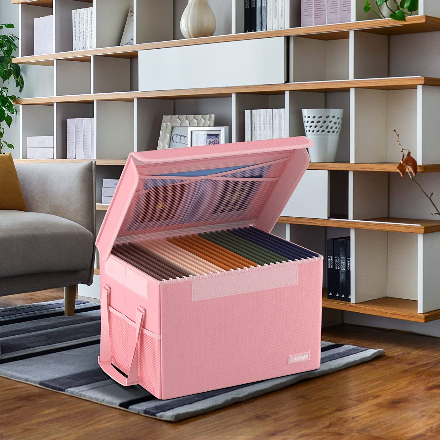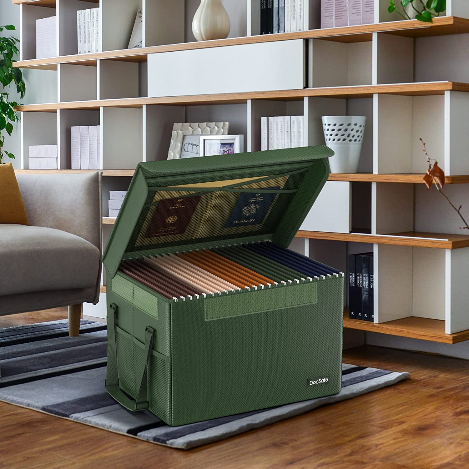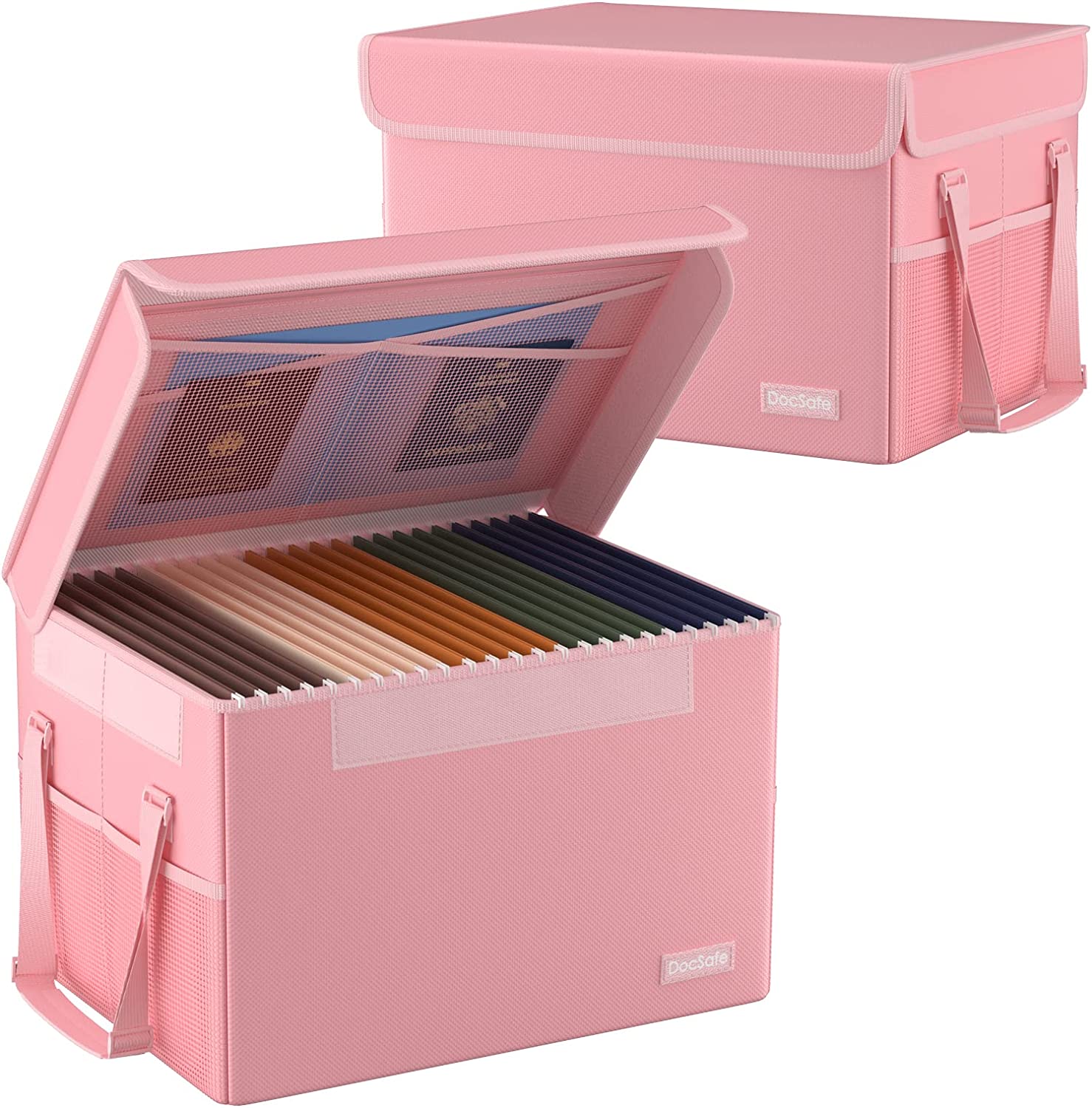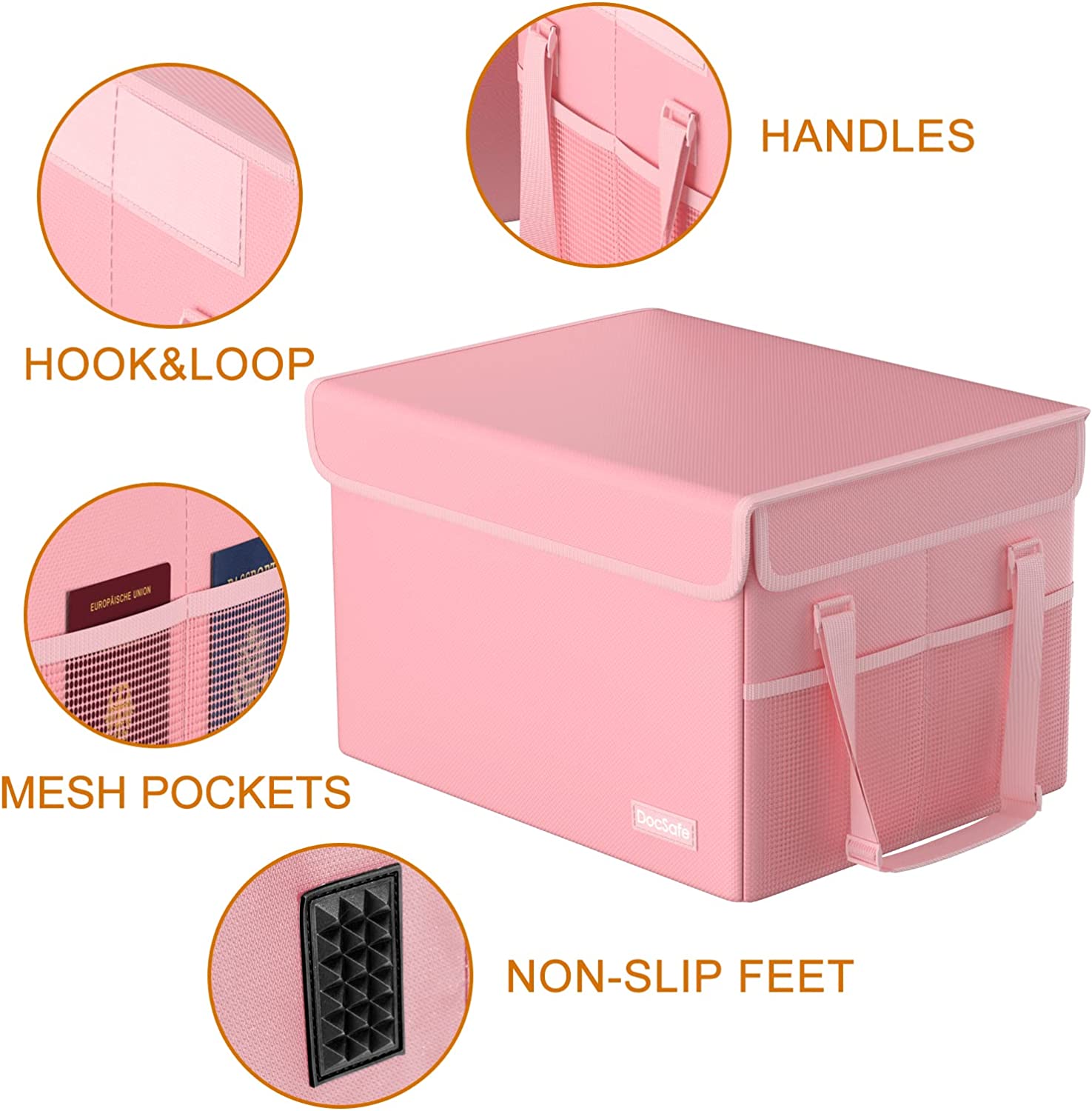 DocSafe File Box Fireproof Document Box with Lock,File Storage Organizer Box with Mesh Pockets,Collapsible Portable File Box Home Office File Cabinet with Handle for Hanging Letter/Legal Folder,Black
