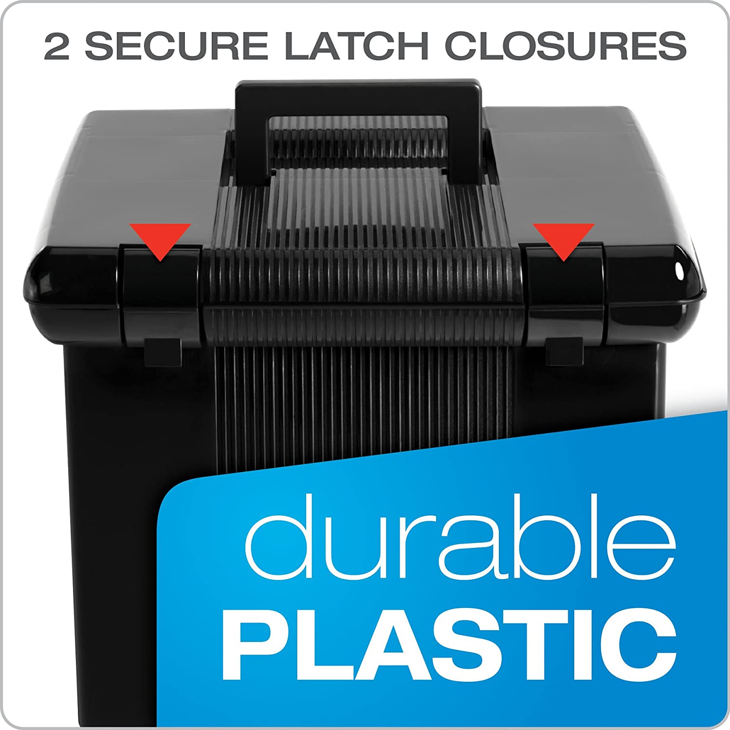 • Built-in handle and double latch closure keeps documents secure; portable file box travels neatly between rooms or to and from the classroom or workplace