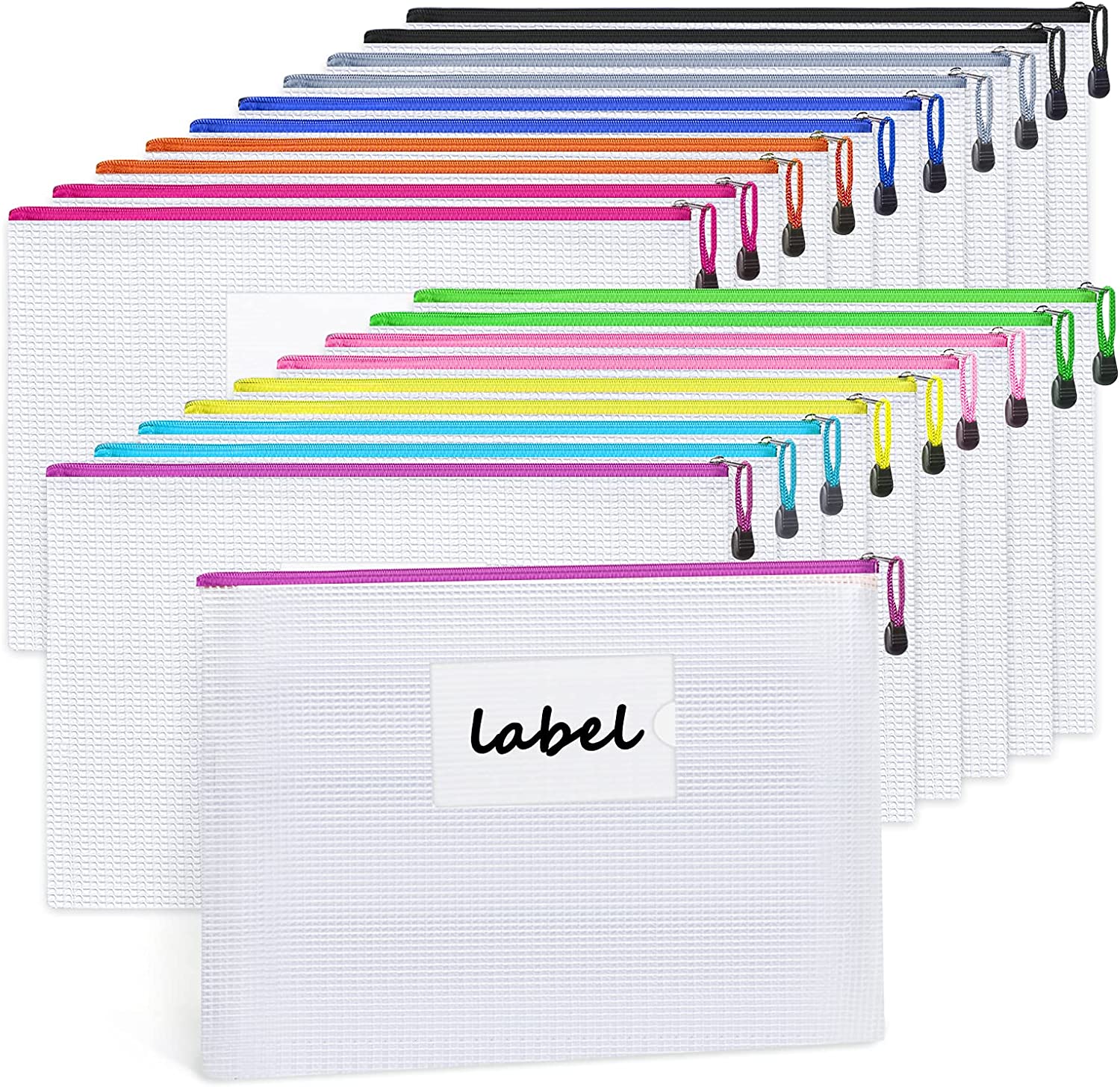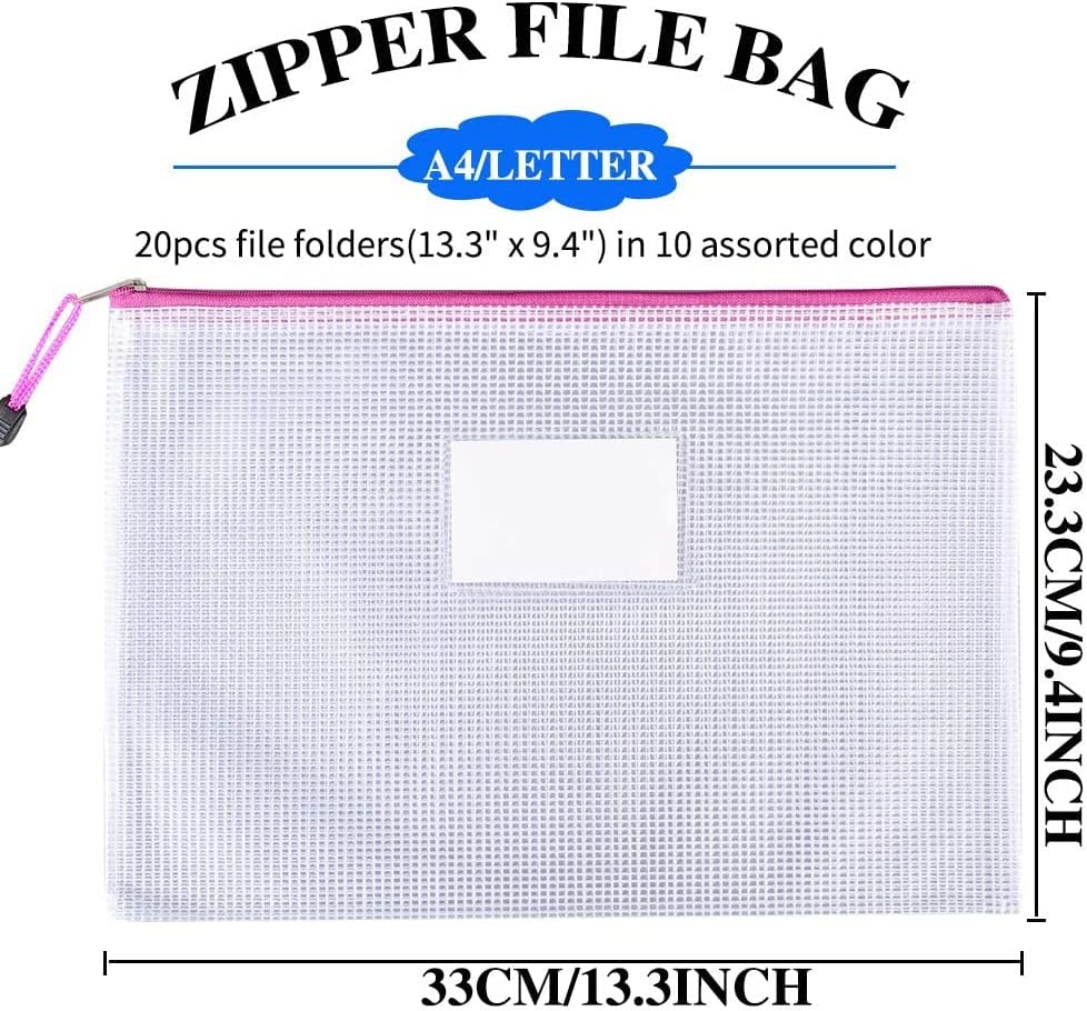 • Zipper Pouches with Label Pockets: 20 Packs, 13.3"x9.4" mesh zipper bags in 10 colors (2pcs for each color). An additional label pocket helps you more easily and quickly to find what you need, which makes our storage bags stand out better than other mesh bags.