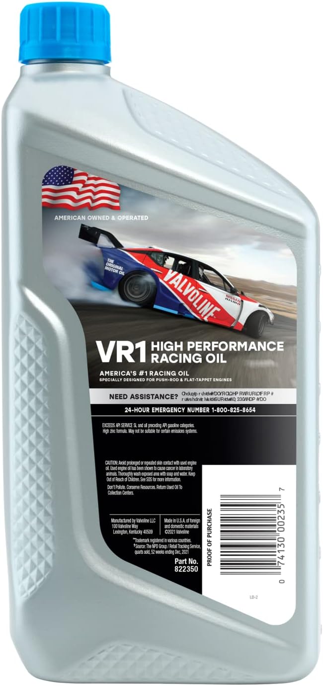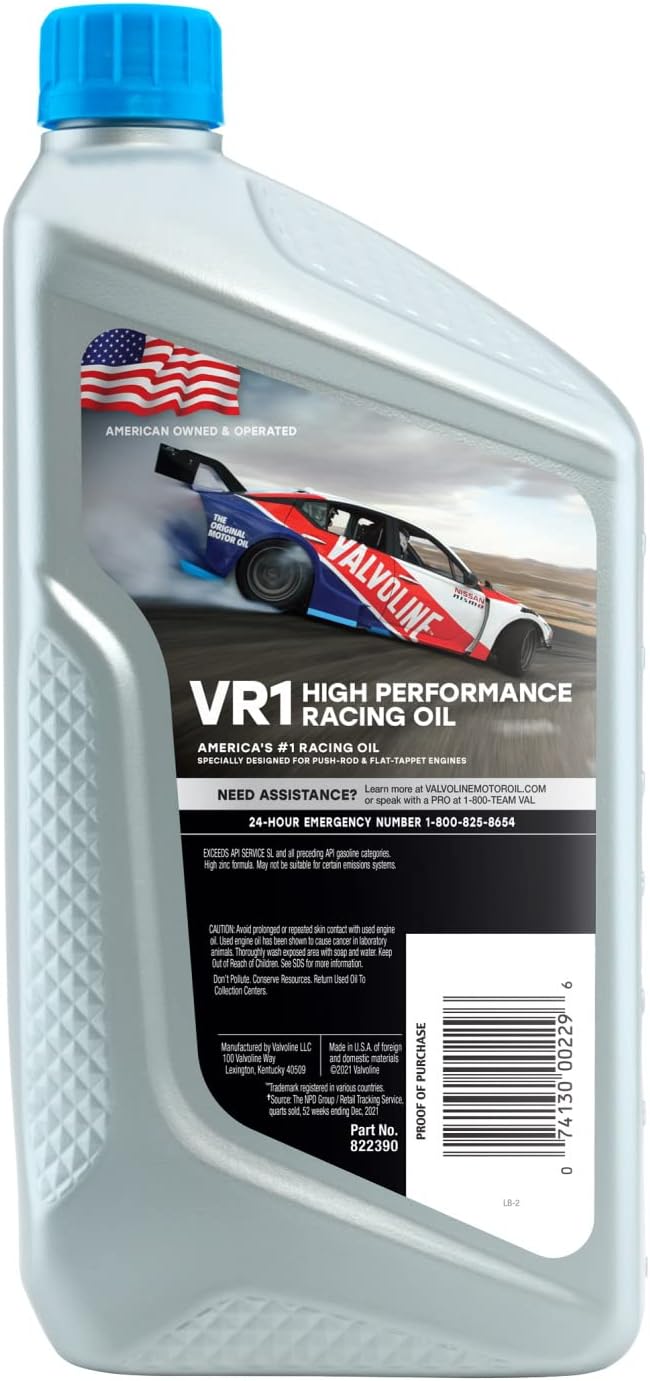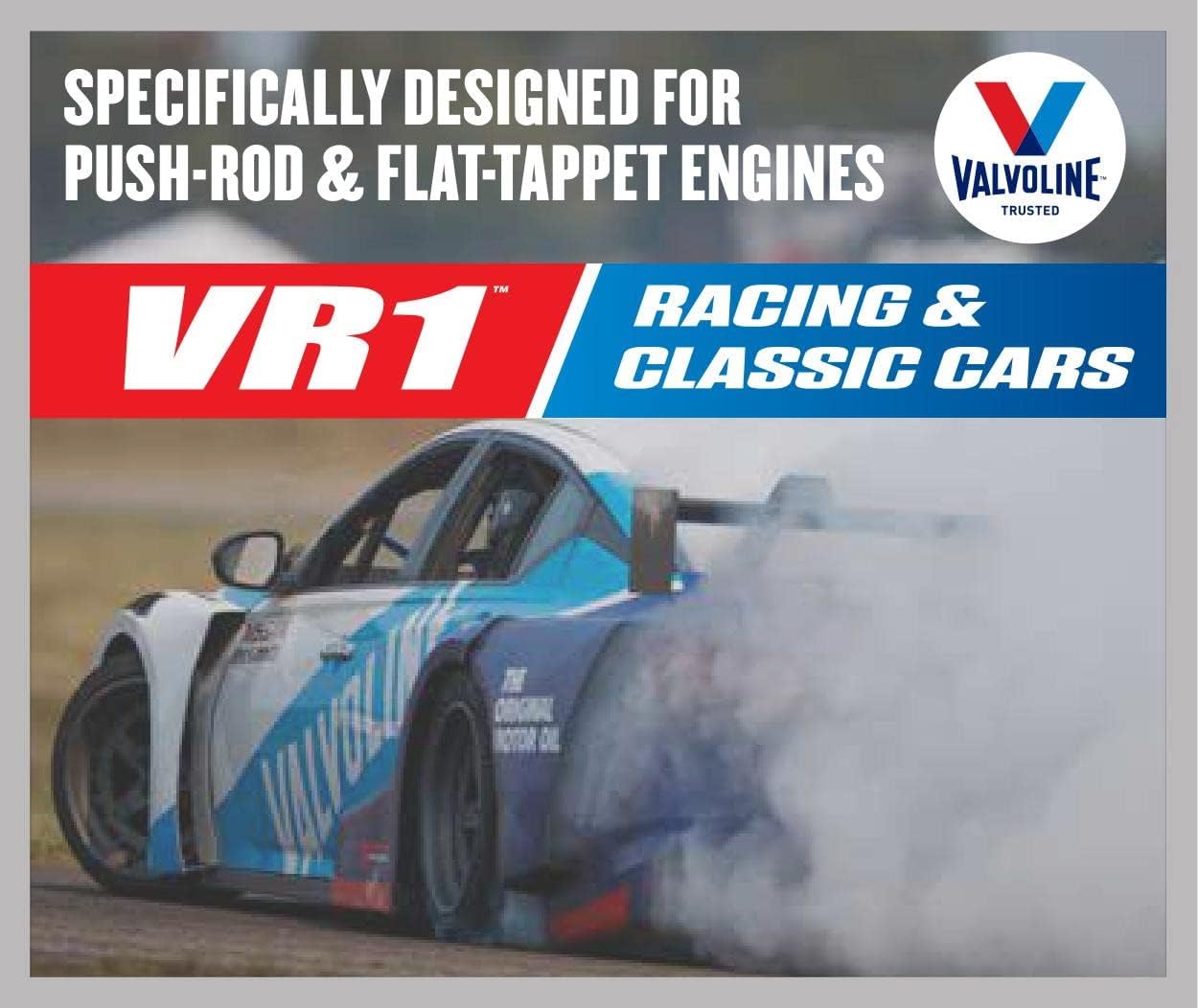 From drag strips to paved and dirt ovals, racing performance demands race-level protection. Which is why motorsport teams and enthusiasts depend on Valvoline VR1 10W-30 Racing Motor Oil, America’s #1 racing oil. Our exclusive high zinc and phosphorus formula is engineered specifically for modern and classic high-performance engines both on and off the track, which includes flat-tappet and performance cam motors. It’s chemically designed to reduce internal friction and enhance power output, while protecting critical engine parts from wear under the extreme conditions of racing. While its high load carrying characteristics, minimum foaming under stress and maximum resistance to thermal degradation ensure stability and lubrication. Valvoline VR1 10W-30 Racing Motor Oil is recommended for high-performance gasoline engines as well as those burning full or partial alcohol fuels. It is not recommended for vehicles with catalytic converters or in wet clutches. Go with the proven winner, Valvoline. The trusted motor oil brand for over 150 years.