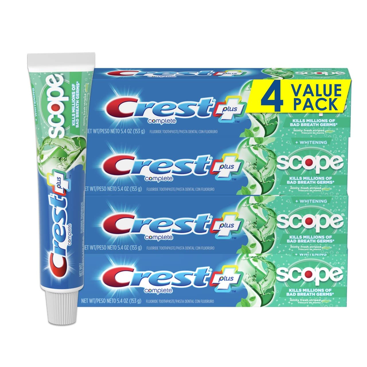 Get the freshness of Scope in a toothpaste. Crest + Scope Complete Whitening Toothpaste has the benefits of Crest toothpaste with the addition of Scope freshness. Kill millions of bad breath germs* and leave your breath feeling minty and refreshed. Regular brushing with fluoride toothpaste helps prevent tooth decay by slowing the breakdown of enamel and increases the rate of the remineralization process. This toothpaste fights cavities and tartar build-up. This teeth whitening toothpaste gently removes surface stains to help whiten your teeth.