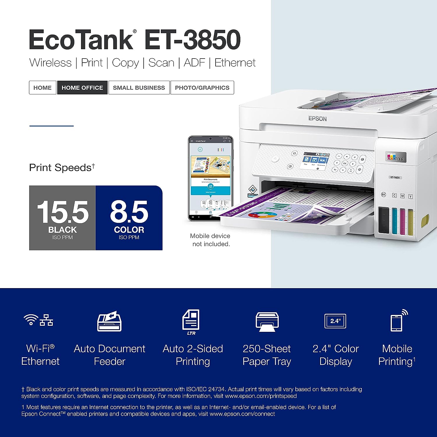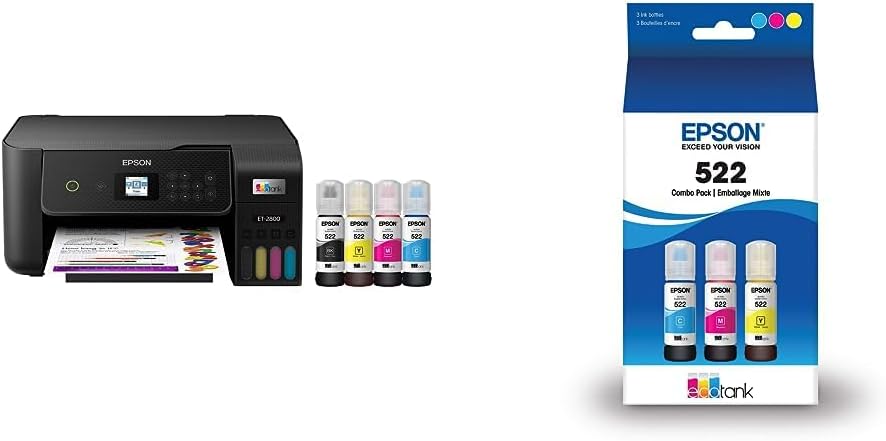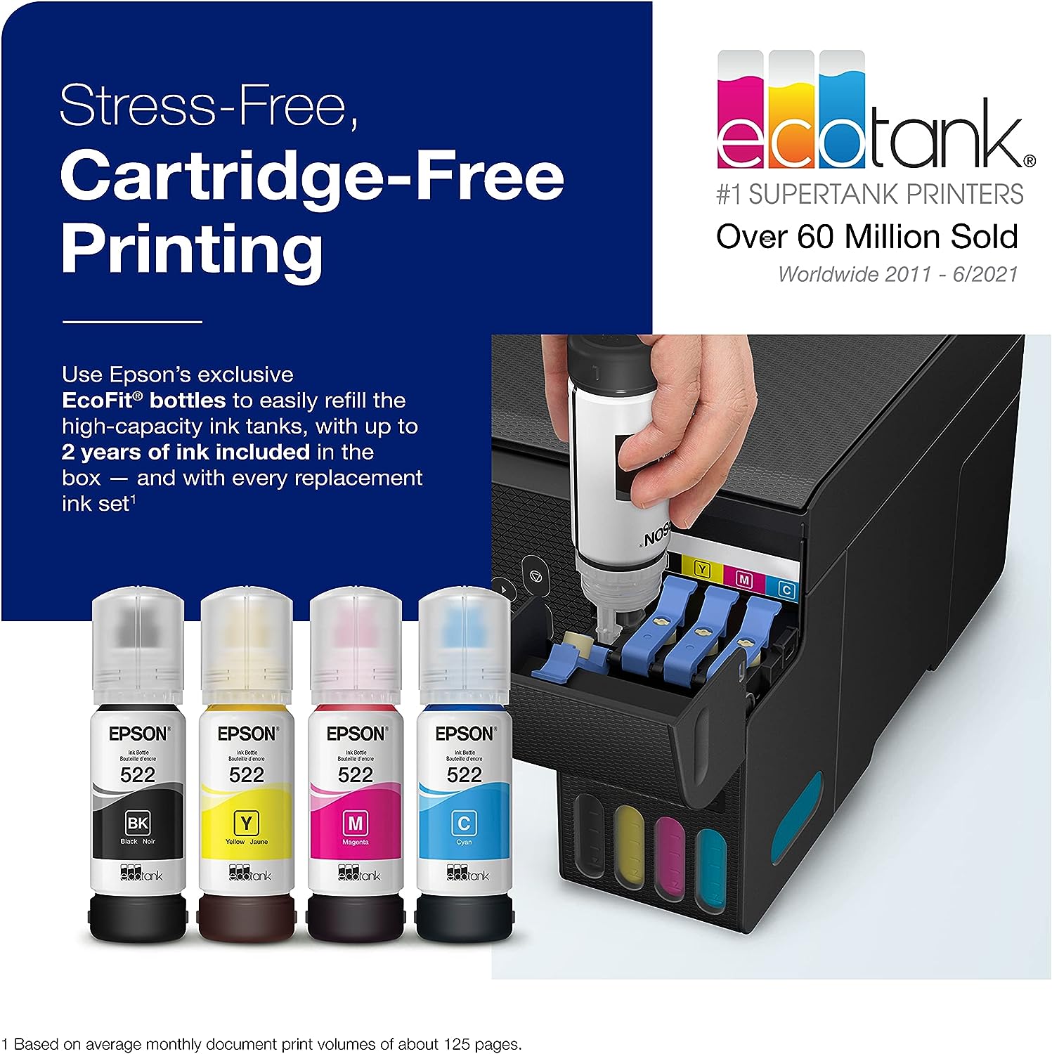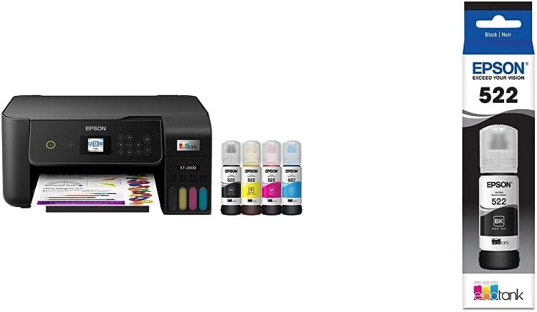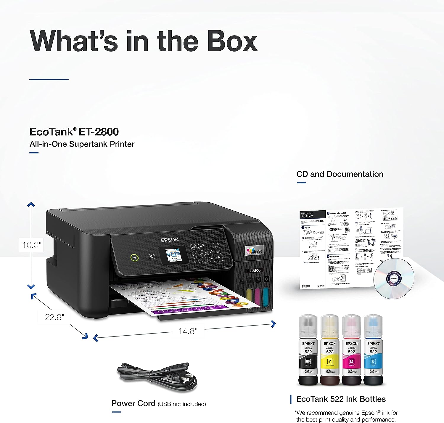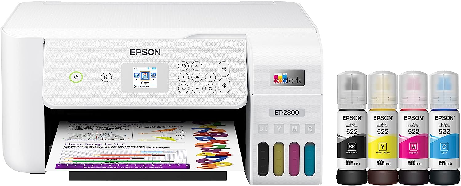 Your family needs a printer that’s fast, affordable, and easy to use. That’s why we developed the EcoTank ET-2800 – an innovative cartridge-free solution that uses high-capacity, easily refillable ink tanks. So you’ll worry less about running out of ink, and save a lot on replacement ink (1). The ET-2800 features genuine Epson print quality, a high-resolution flatbed scanner, and convenient color display – making it the ideal basic home printer. 1. Actual savings and costs will vary considerably based on print tasks, print volumes and usage conditions. Savings and cost per ISO page are based on the cost of replacement ink bottles and the cost of enough standard cartridges to achieve the total page yields of the bottles using the MSRP (USD) and yields for Epson standard-capacity ink cartridges for similarly featured Epson consumer inkjet printers as of May 2021. 2. Part of the ink from the included bottles is used for initial setup; yields are lower than those of replacement ink bottles. Replacement and included ink bottle yields based on the ISO/IEC 24712 pattern with Epson’s methodology. Actual ink yields will vary considerably for reasons including images printed, print settings, temperature and humidity. Yields may be lower when printing infrequently or predominantly with one ink color. All ink colors are used for printing and printer maintenance, and all colors must be available for printing. 3. Individual cartridges estimate based on print yields of a replacement set of black and color ink bottles as compared to Epson standard-capacity ink cartridges for similarly featured printers as of May 2021. 4. Based on average monthly document print volumes of about 125 pages. 5. Epson Connect account and voice-activated account registration required. 6. Most features require an Internet connection to the printer, as well as an Internet- and/or email-enabled device. 7. Requires Epson Smart Panel App download. Data usage fees may apply. 8. 12 months of standard limited warranty or 30,000 plain paper sheets (whichever happens first). For an additional 12-month extended service plan (total of 24 months or 30,000 plain paper sheets, whichever happens first), register your product and use Epson genuine ink bottles. See Limited Warranty for details. 9. SmartWay is an innovative partnership of the U.S. Environmental Protection Agency that reduces greenhouse gases and other air pollutants and improves fuel efficiency.
