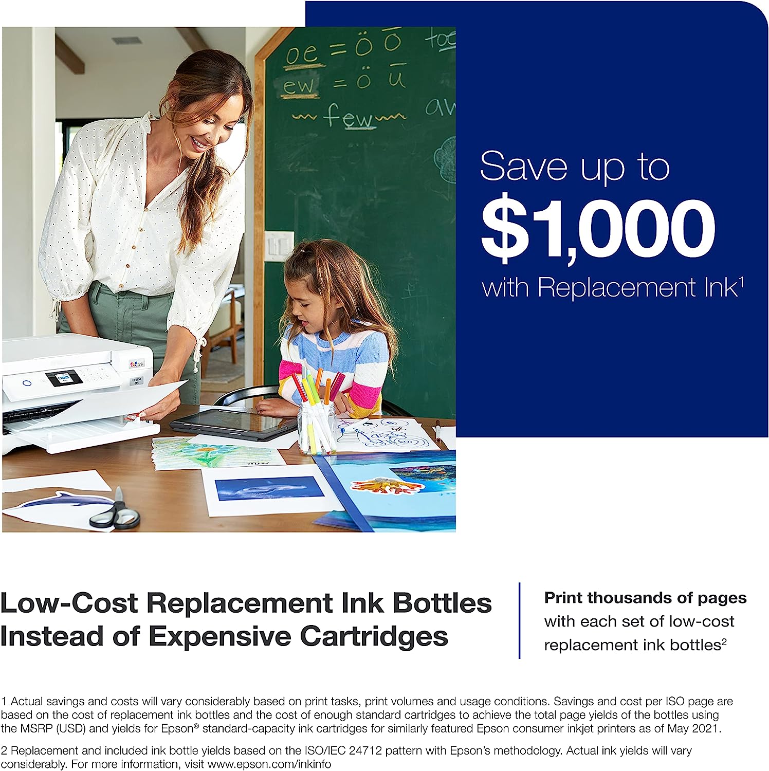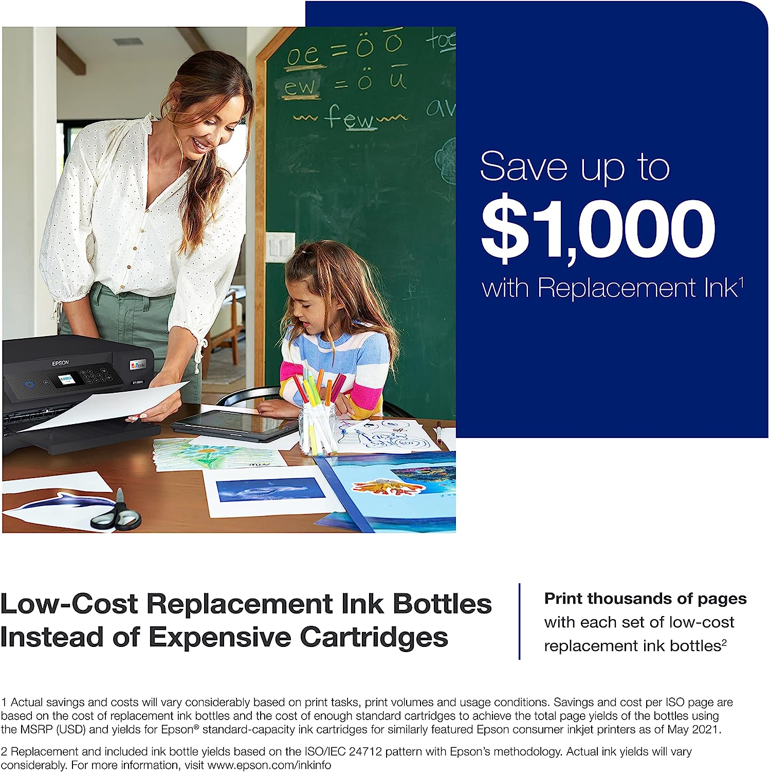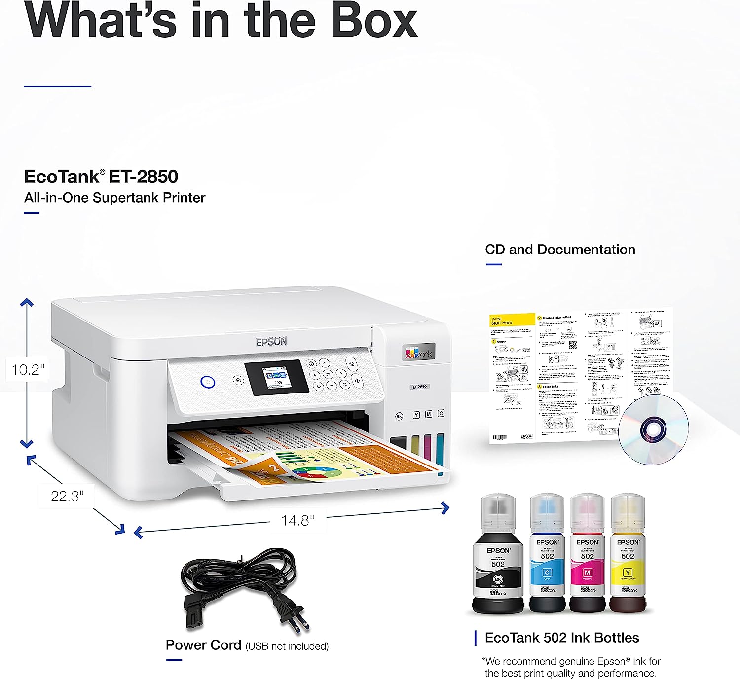 EcoTank ET-2850 All-in-One Supertank Printer - White Prints up to 10.5 pages per minute (ppm) in black and 5 ppm in color. Prints at a 4800 x 1200 resolution for beautiful text and images. Auto 2-sided printing helps save time and money. Offers mobile printing options, including the Epson Smart Panel App, Epson Remote Print, Apple AirPrint, Android Printing and Mopria Print Service. Copies at 7.7 copies per minute in black and 3.8 copies per minute in color. Lets you reduce a copy down to 25% or enlarge by 400%. Color flatbed scanner with a CIS photo sensor provides 1200 x 2400 dpi hardware resolution for crisp detail. Wireless-N (802.11b/g/n) technology and Wi-Fi Direct allow cable-free connection. Also features a Hi-Speed USB. 1.44" color LCD helps you manage its functions. 100-sheet input tray to handle big jobs. Features high-capacity ink tanks to help reduce waste. Eco-conscious choice - has one or more meaningful eco-attributes or eco-labels. Energy efficient - designed to use less energy than alternative products, potentially helping you save money and reduce your carbon footprint.