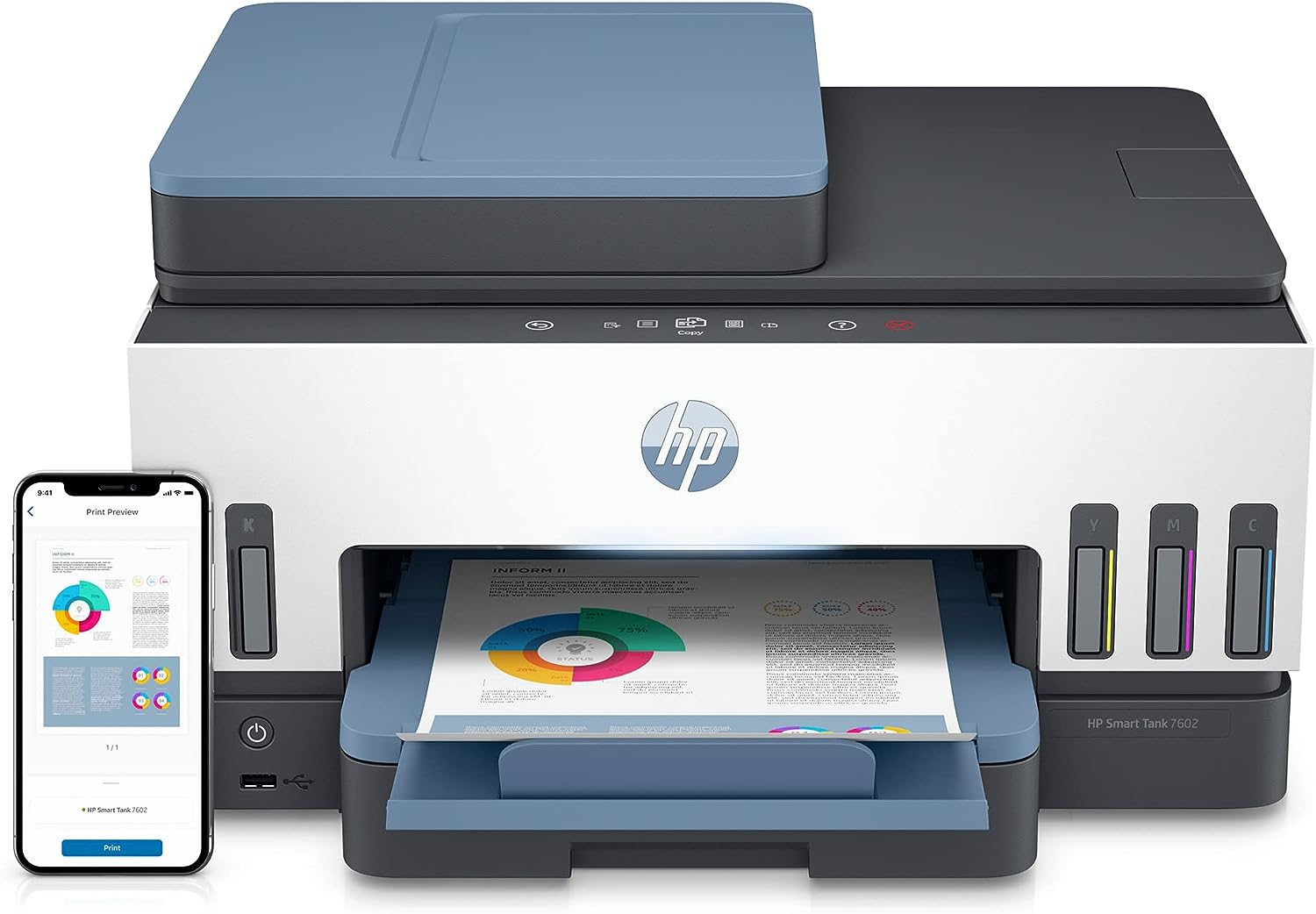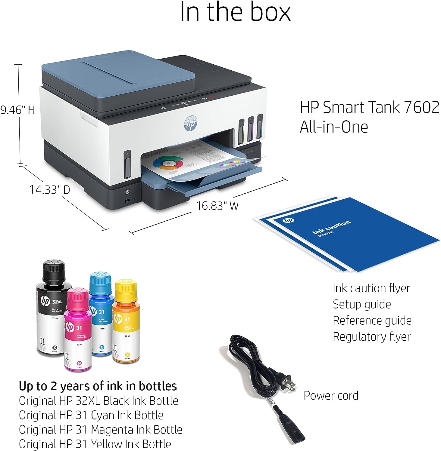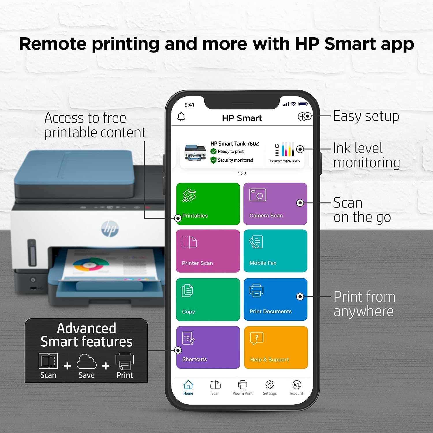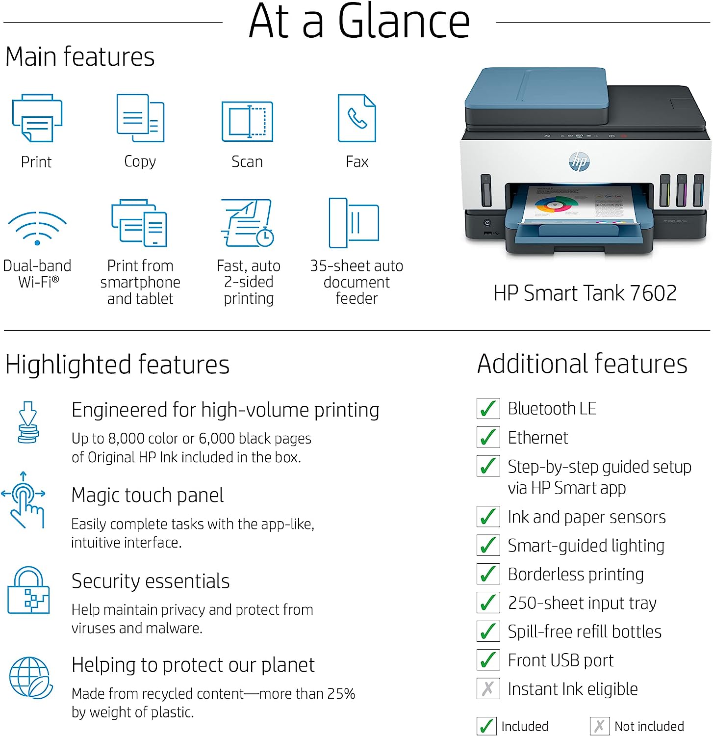 The HP Smart Tank 7602 makes printing seamless from start to finish for your small business with an integrated, app-like magic touch panel, high-capacity ink tank, automatic document feeder and wireless and Ethernet connectivity. Create outstanding-quality color documents at a low cost with up to two years of Original HP Ink included in the box.