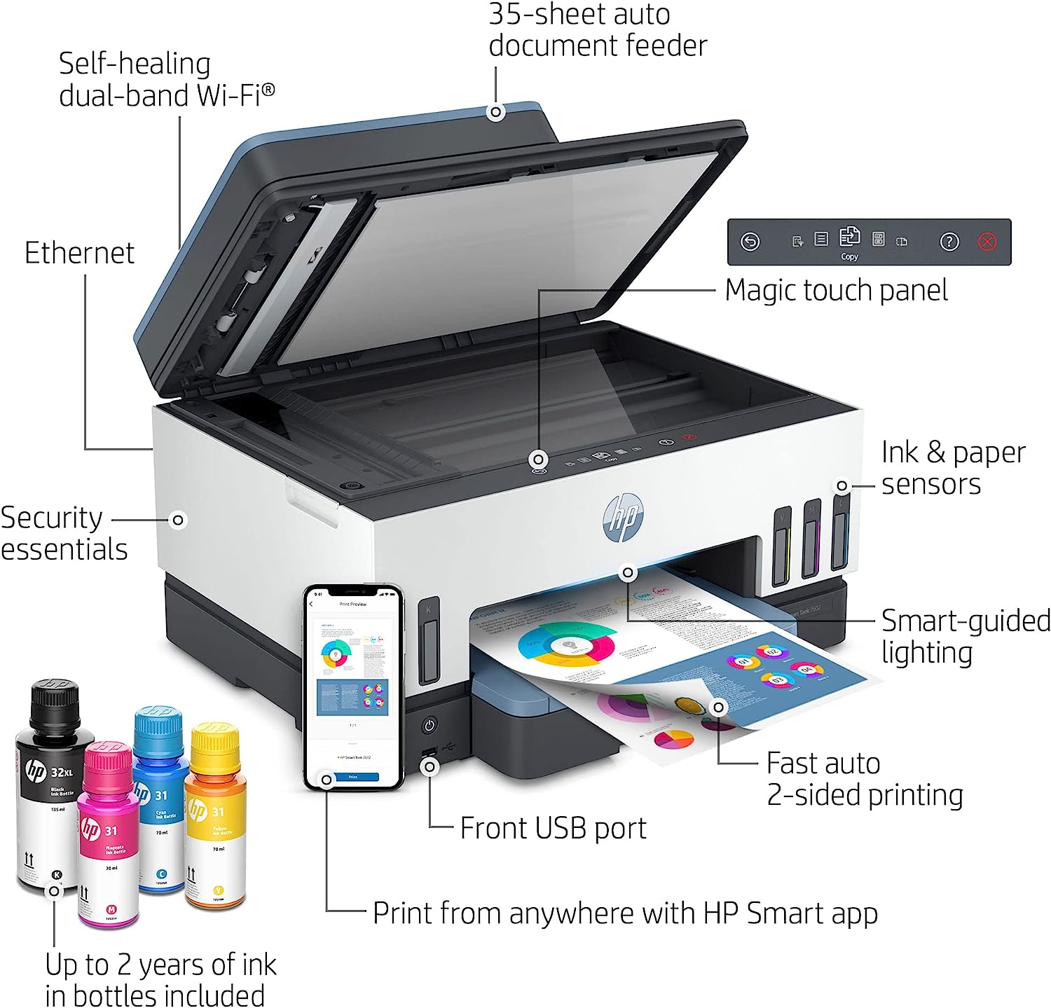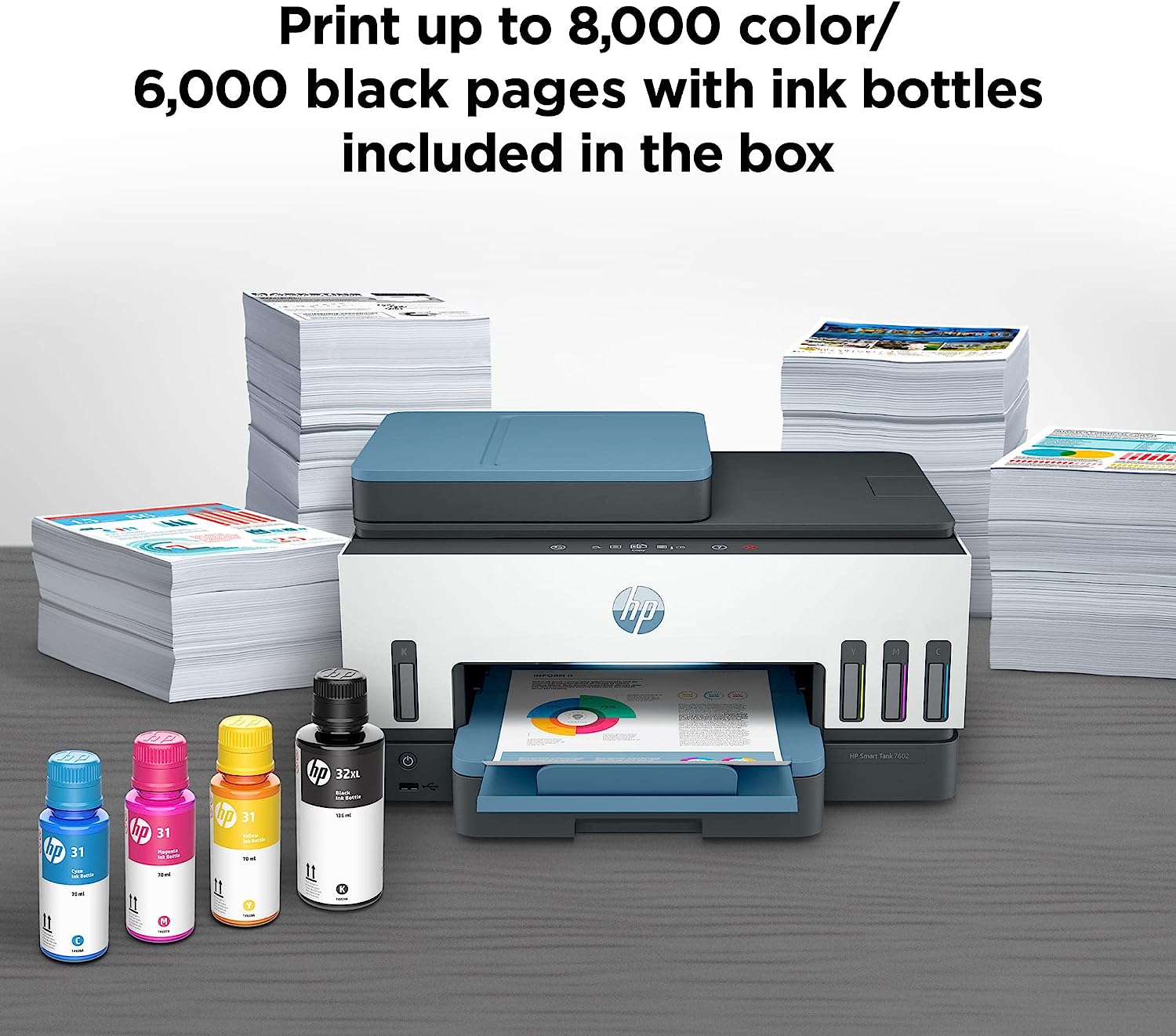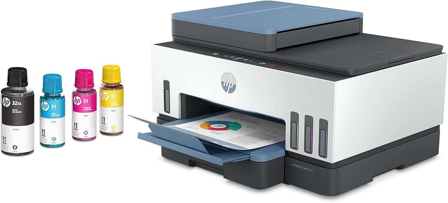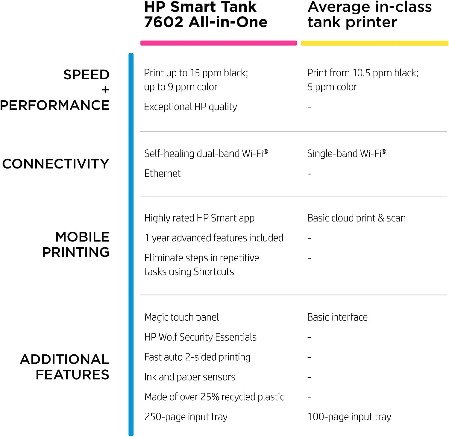 The HP Smart Tank 7602 makes printing seamless from start to finish for your small business with an integrated, app-like magic touch panel, high-capacity ink tank, automatic document feeder and wireless and Ethernet connectivity. Create outstanding-quality color documents at a low cost with up to two years of Original HP Ink included in the box.