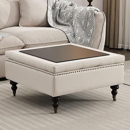 Large Square Storage Ottoman Uphlostered Tufted Button Coffee Table, Oversized Footrest Bench with Castered Rolling Wheels for Living Room, Beige Linen Waterproof