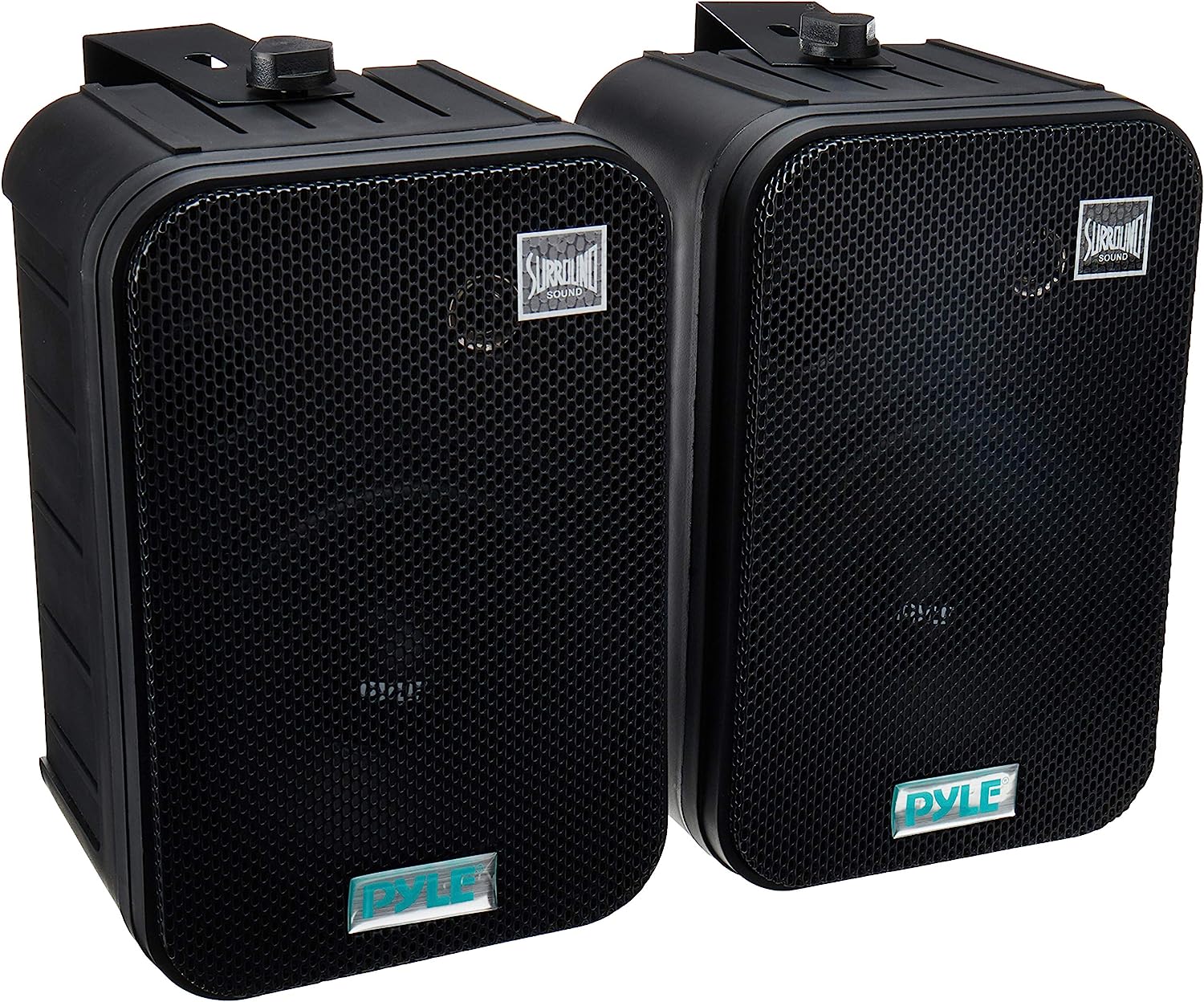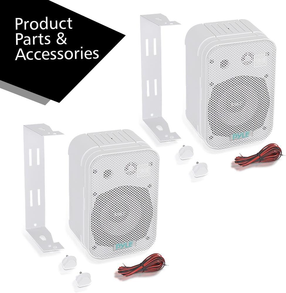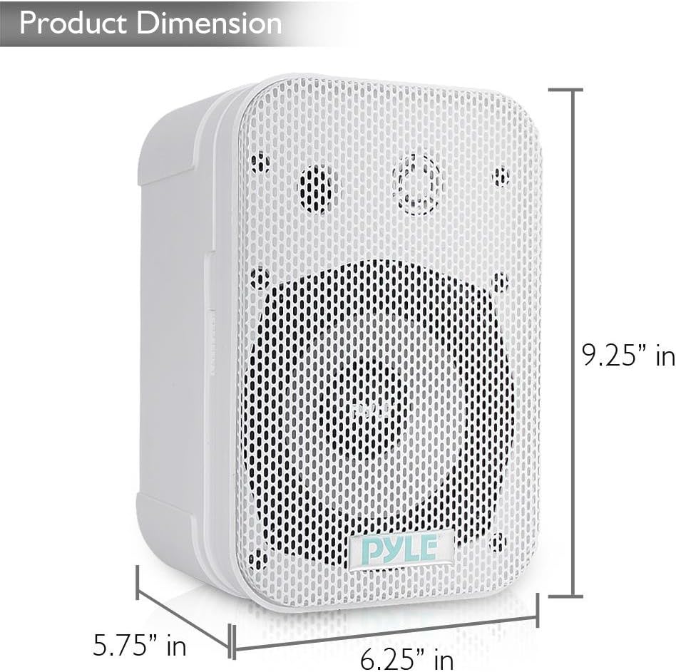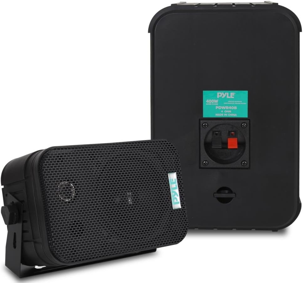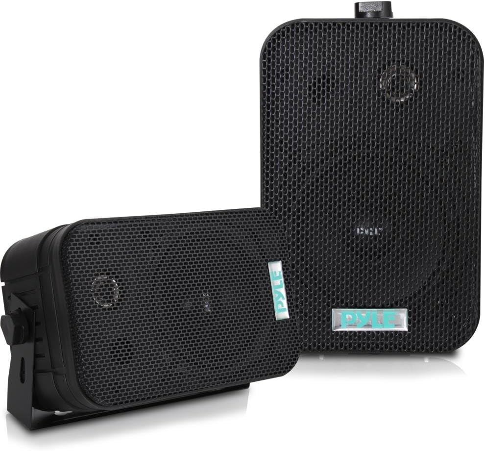 These black Pyle indoor/outdoor waterproof speakers are excellent for use on boats, decks, patios, or by the pool - anywhere outdoors. They're completely waterproof, thanks to the heavy duty ABS construction. And they're powerful - 500 watts max. A 6.5' aluminum injection cone woofer provides the midbass, while a 1' high compliance Mylar tweeter pushes sweet highs. A capacitor crossover network separates these two channels discretely for a brilliant sound. Connect wires easily and effortlessly using the quick connect speaker terminals. The bass reflex vent boosts the bass response for a deeper, more powerful sound, ultimately delivering a frequency response of 30 Hz to 22 kHz. Mount using the unique spring loaded mounting system. The mesh grills are rustproof and removable. Sold as a pair.