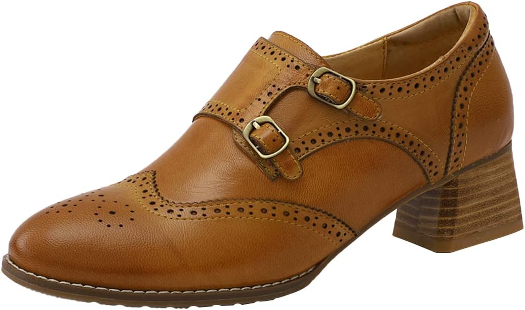 Mona flying Womens Leather Chunky Heel Monk Strap Oxfords Wingtip Ladies Mid Heel Dress Loafers Pumps Shoes with Buckle