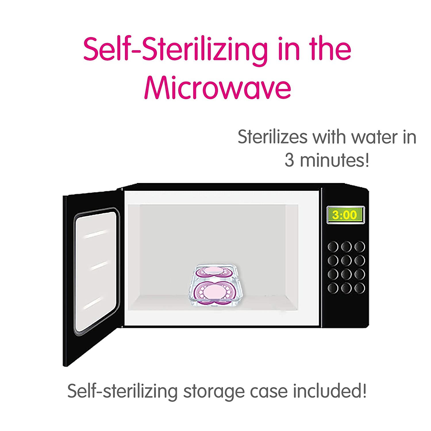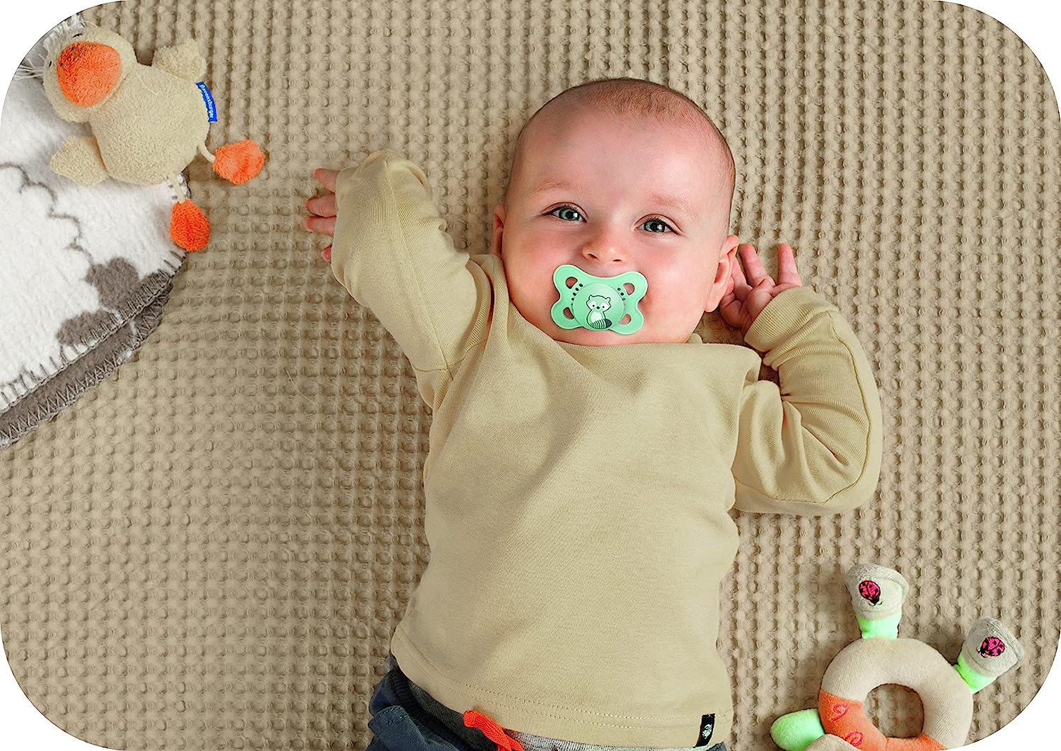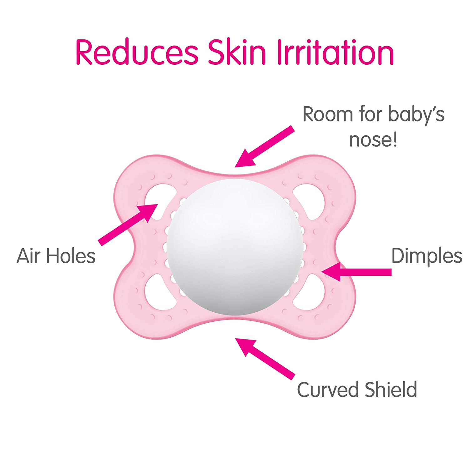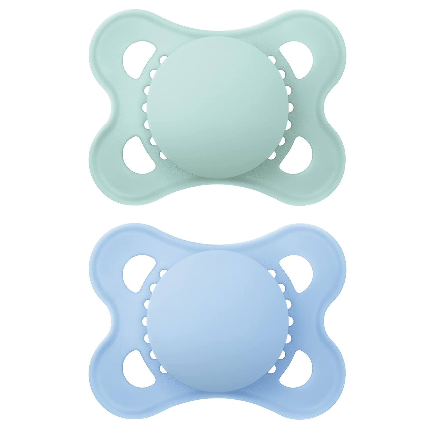 The MAM Original Matte Pacifier was developed by leading pediatric dentists and developmental psychologists to provide maximum comfort and style for babies 0-6 months of age.* MAM pacifiers for baby feature an innovative nipple designed to promote healthy oral development and with the help of a built-in air channel, the pacifier naturally flattens and extends when sucked, mimicking a human nipple during breastfeeding. All MAM pacifiers are orthodontic, featuring a symmetrical nipple that fits perfectly in baby's mouth at any angle and life-like, SkinSoft textured silicone that feels more natural, just like mom. With multiple pacifier shapes and shield sizes to pick from, MAM nipples are easily accepted by babies of all ages, with 94% nipple acceptance among babies tested.** Our Original plain pacifier comes in a variety of neutral matte colors to coordinate with your babies' everyday outfits! Pacifiers kept in the closed box will remain clean for up to 48 hours: Fill pacifier case with water. Place pacifier in the self-sterilizing case with the nipple facing down. Follow package instructions for microwave setting. Cool completely before use. *Developed with the International Children's Medical Research Society. ***Market research 2010-2020, tested with 1,572 babies
