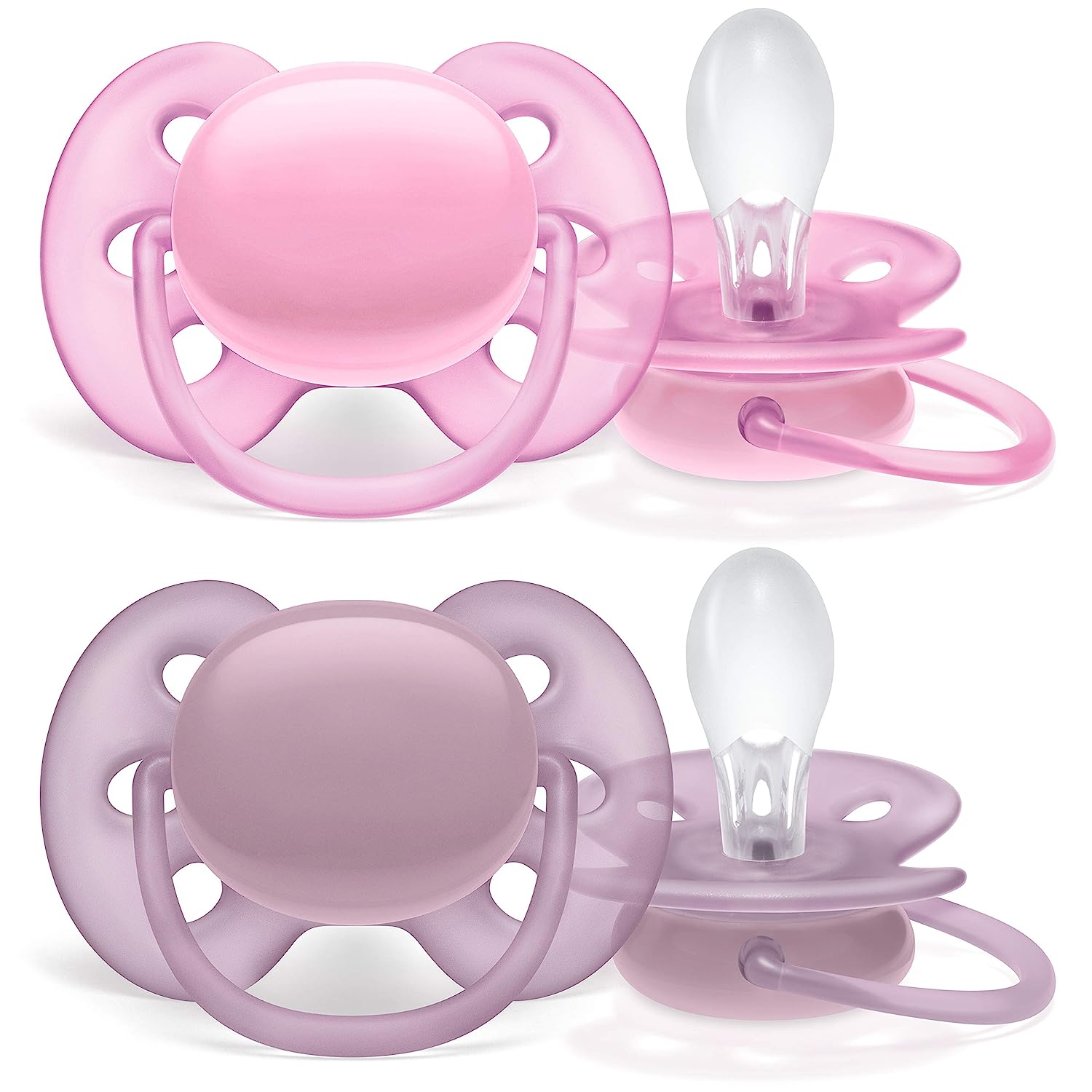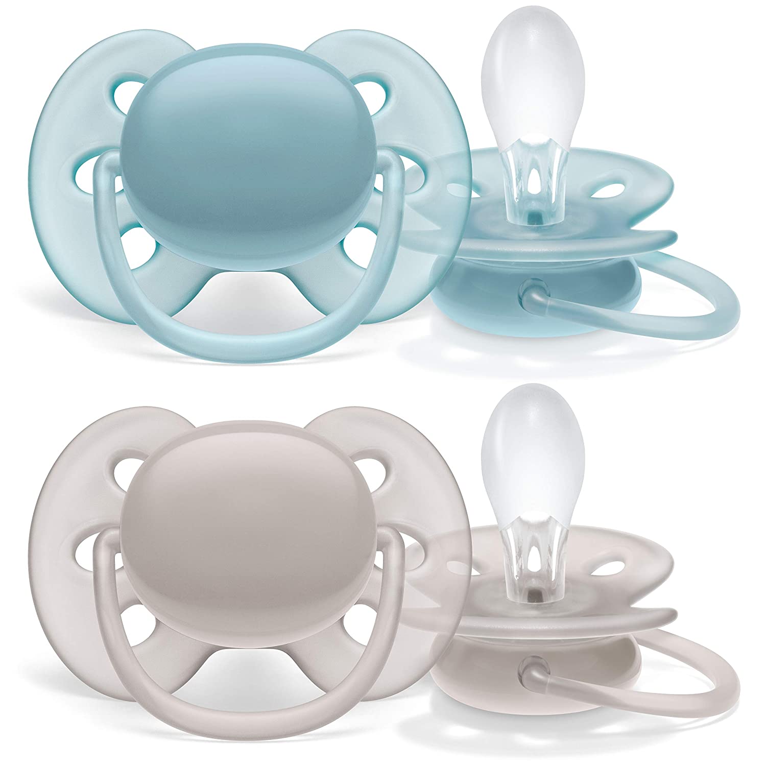 The Philips Avent SCF223/41 ultra soft pacifier for babies 6-18 months is designed with a FlexiFit shield that is soft and flexible for fewer skin marks and less skin irritation. This makes it a more comfortable choice for your baby's delicate skin. 98% of babies accept the soft silicone pacifier nipple. It comes with 4 pacifiers packaged in 2 sterilizer / carrying cases that can be used to sterilize them with water in the microwave. The sterilizer / carrying cases can be used to sterilize the pacifiers with water in the microwave and transport or store them hygienically. Made of BPA free material.