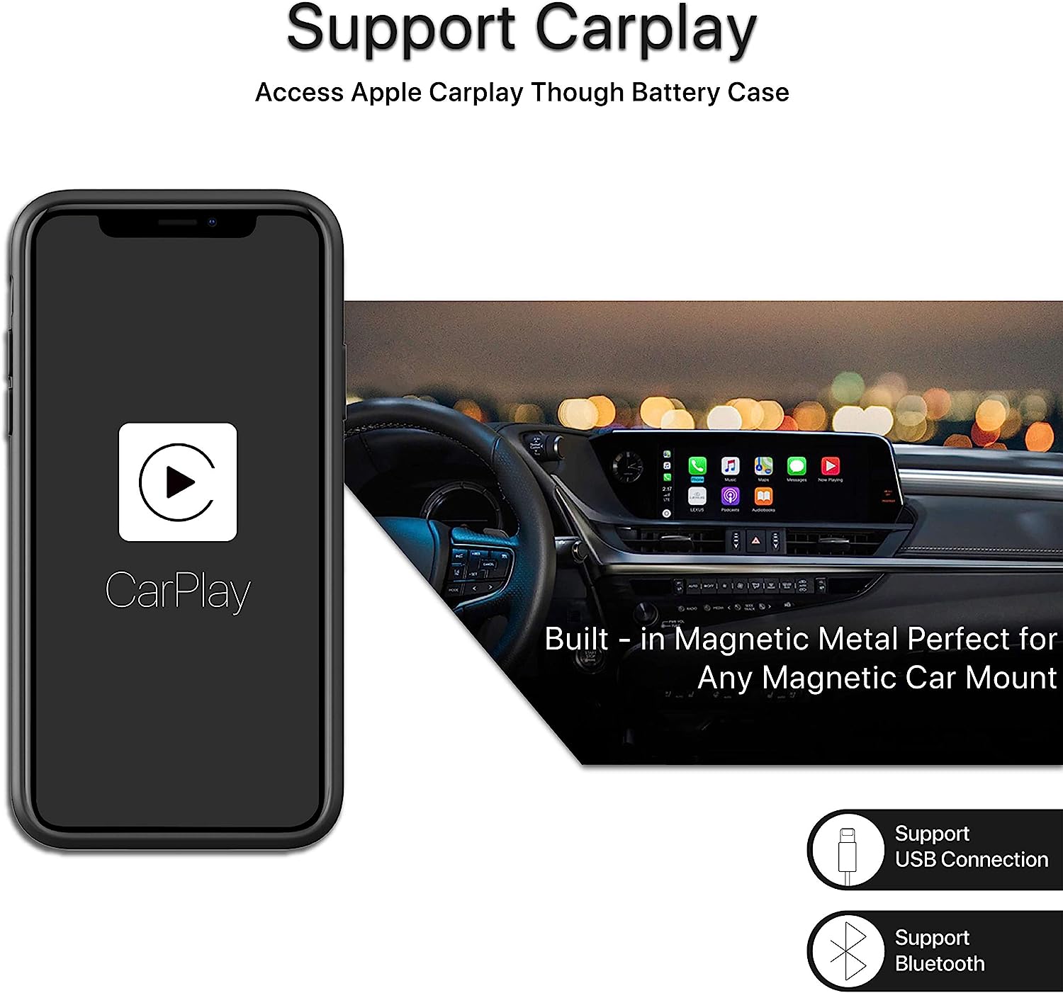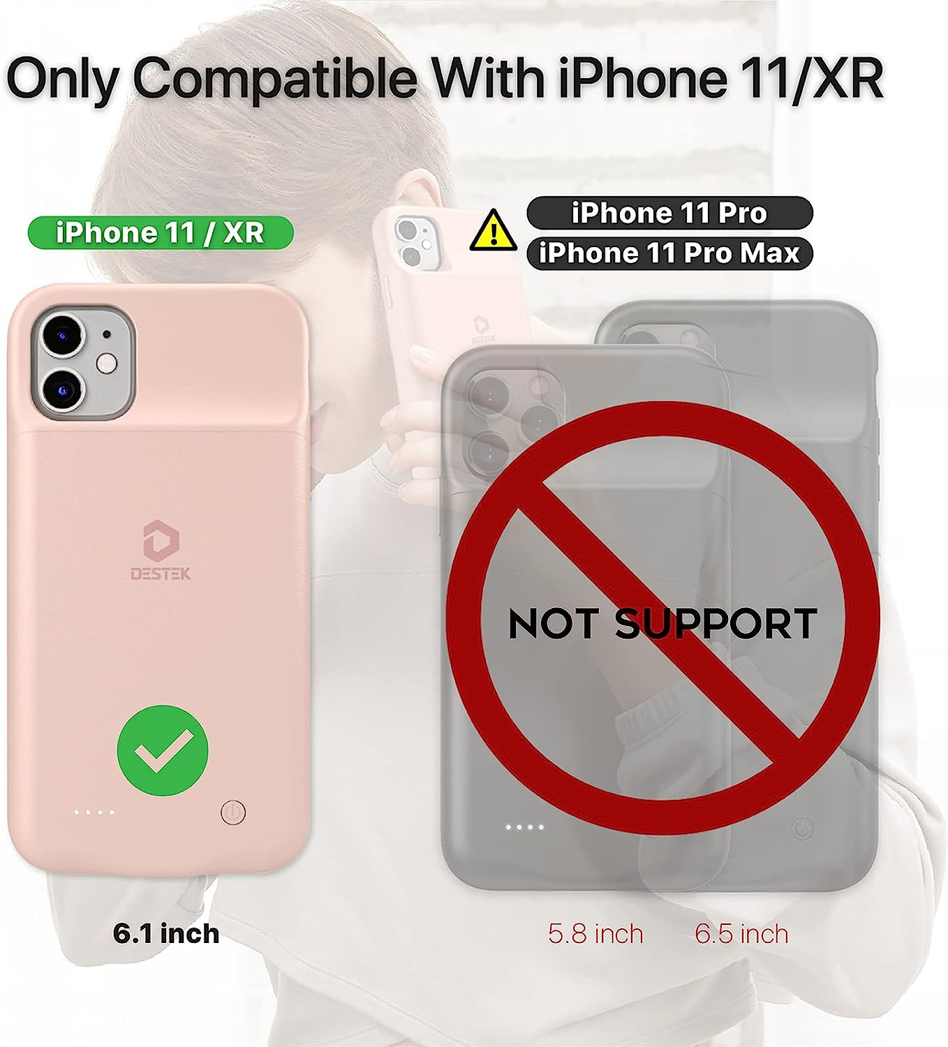 • ⚡【Supported Functions】 ★DESTEK iPhone 11 charger case has upgraded to support Apple carplay, Apple pay and line-in function.★The built-in magnetic metal can be easily attached on the magnetic car mount (car mount should be equipped with magnet). ***Tips:①Do not support wireless charging or fast charging(not waterproof). ②NOT compatible with iPhone 11 pro (5.8 inch) or iPhone 11 pro Max (6.5 inch)***
