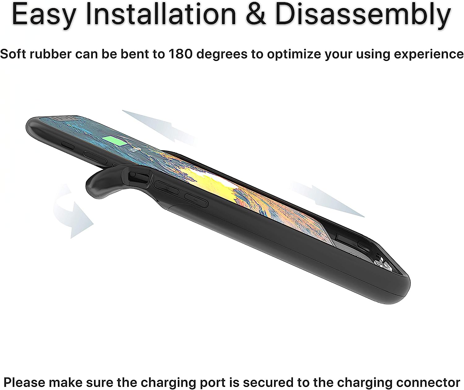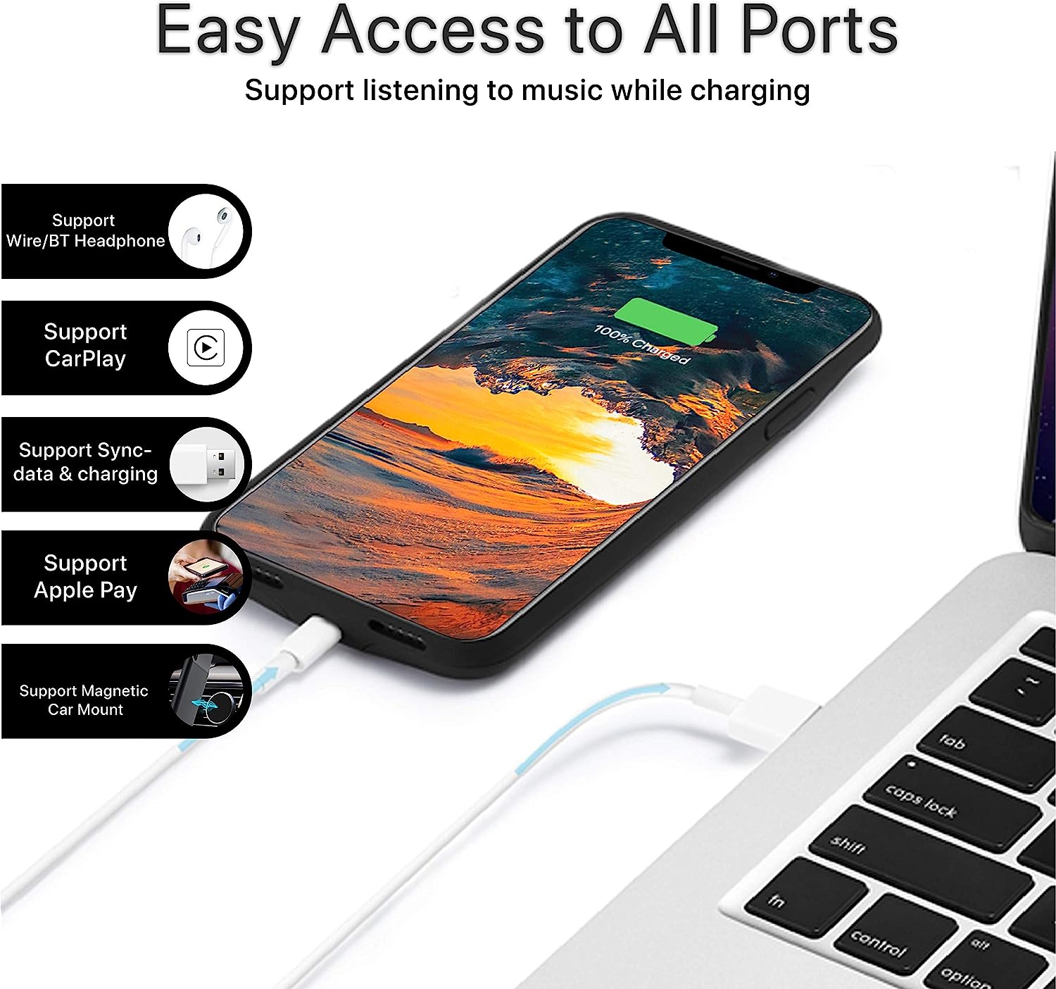 • ⚡【Advanced Sync】 ★ Conveniently sync your iPhone to your Macbook, PC or laptop without having to take the battery case off. You have access to music with original wire headphone or Bluetooth headphone while charging your iPhone.