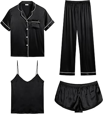 SWOMOG Womens Silk Satin Pajamas Sets 4pcs Sleepwear Sexy Cami Shorts Set and Button Down Short Sleeve Pjs Loungewear