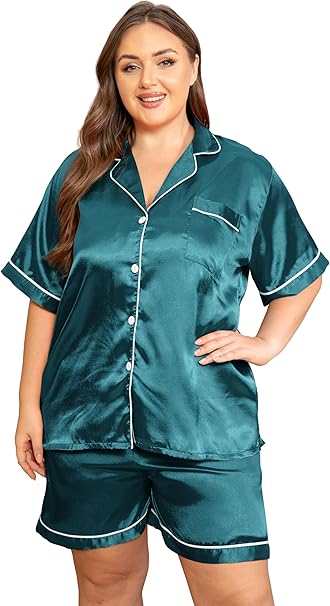 Vozanet Women's Short Sleeve Satin Pajama Sets Silky Ladies Button Down Loungewear Plus Size Nighty Shorts Sets XL to 5XL