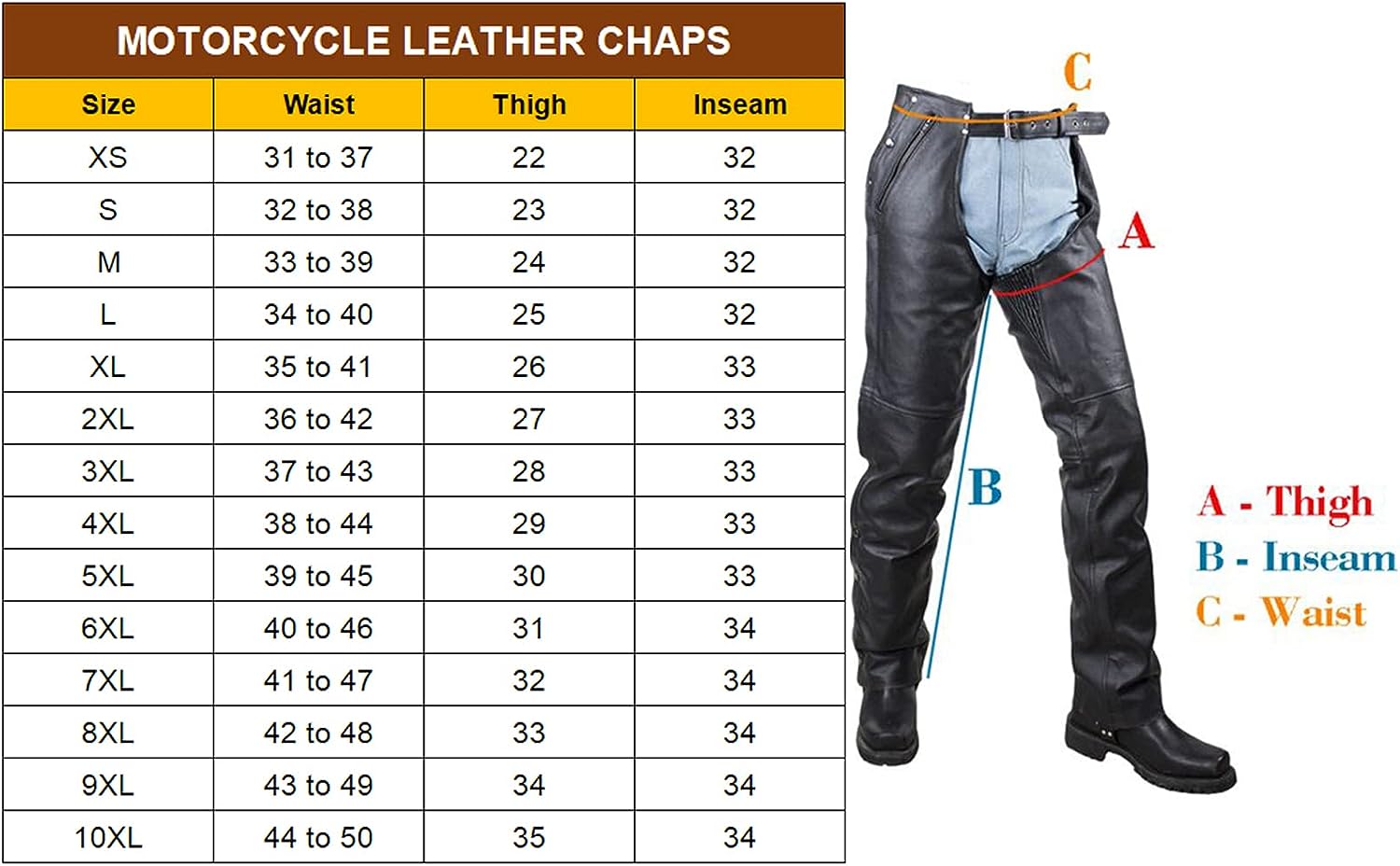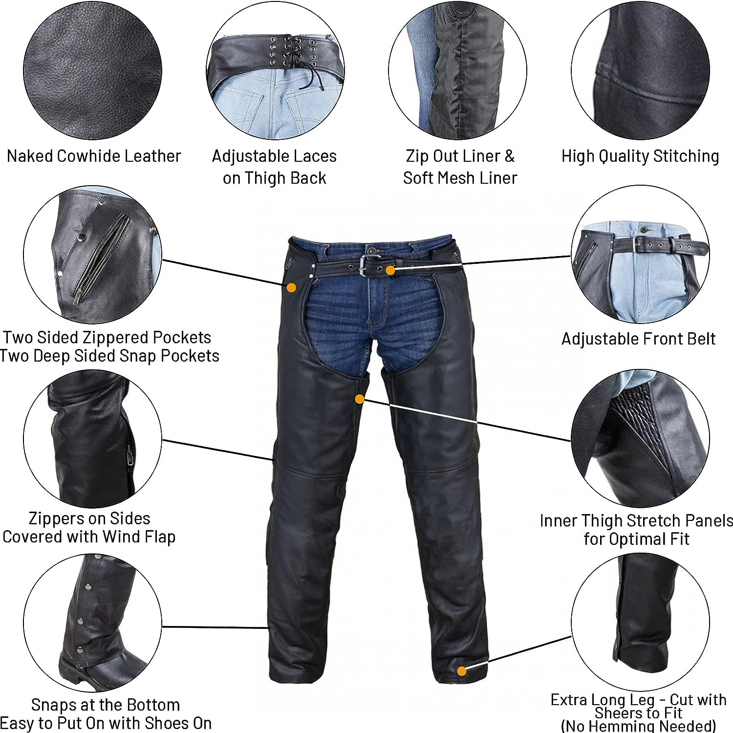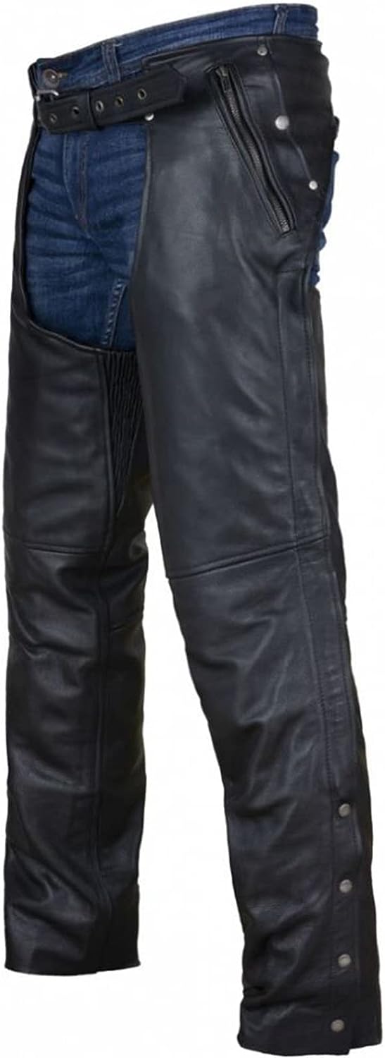 Mens Black Motorcycle Leather Chaps for Riding with Zipout Lining, Cowboy Biker Chap Pants with Multi Pockets
