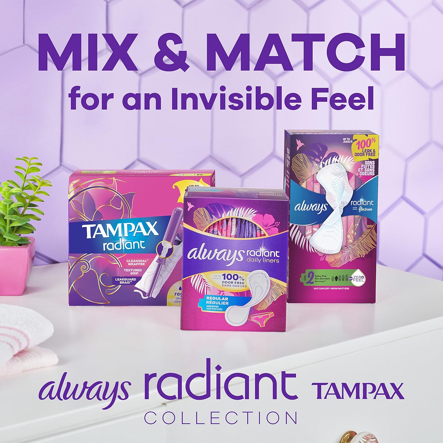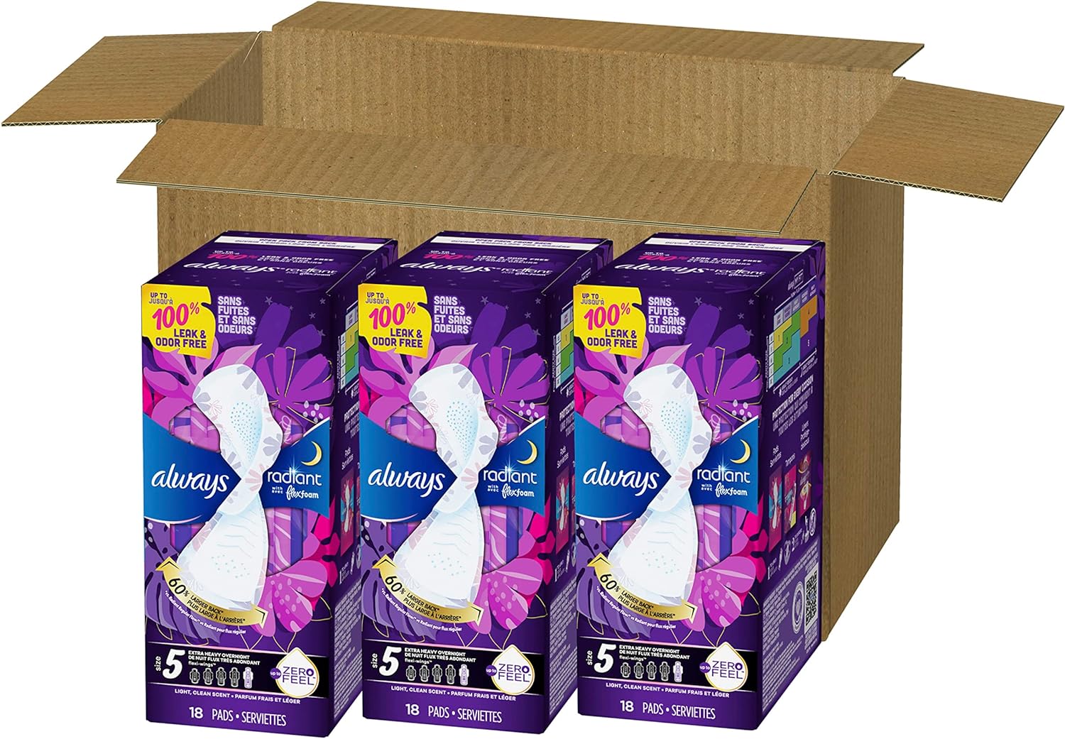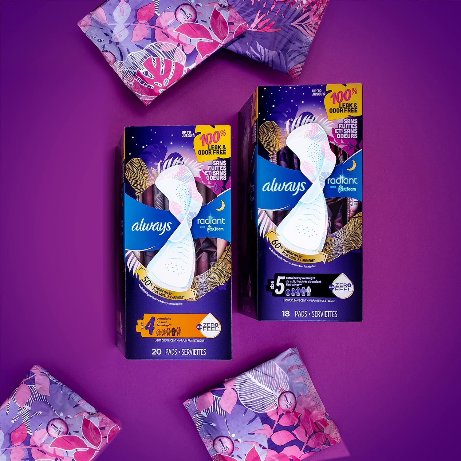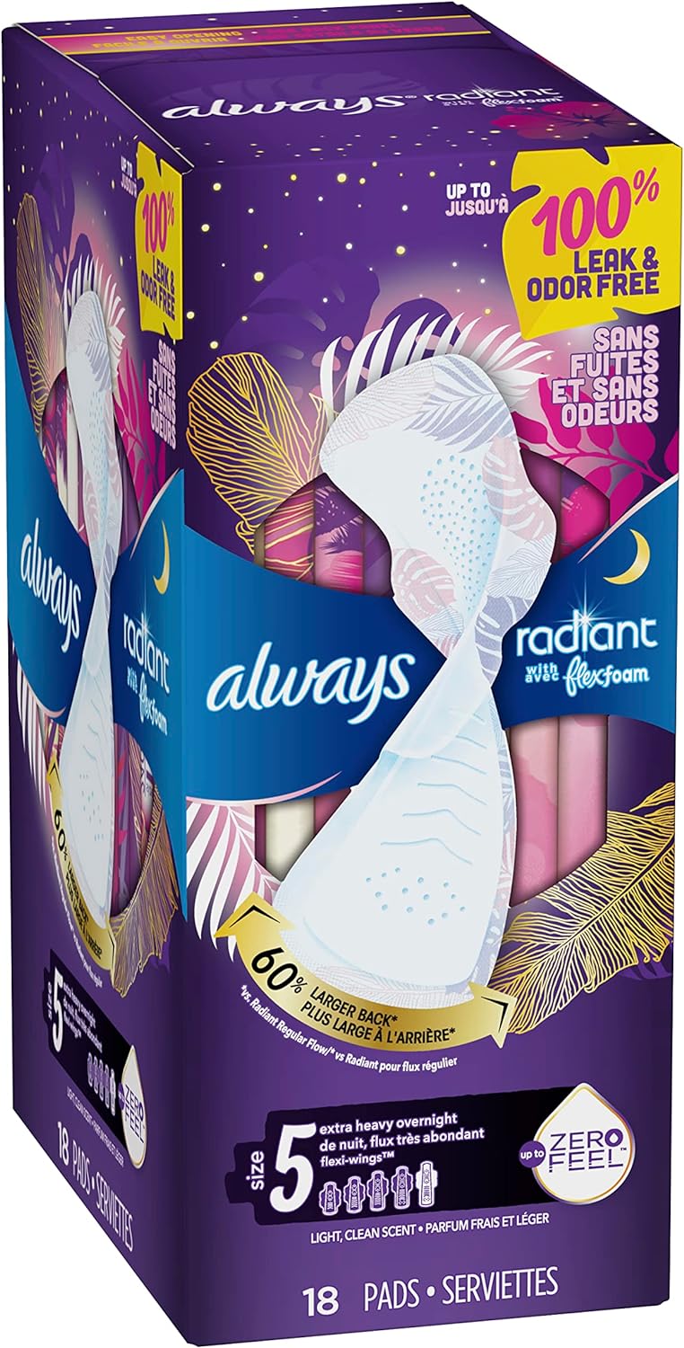 Your pad should not be something that keeps you up at night. When you want nighttime period protection that works, depend on Always Radiant FlexFoam Size 5 Extra Heavy Overnight pads. These up to 100% leak and odor free absorbent pads with wings deliver the style, protection, AND comfort women want using innovative FlexFoam material. Even on heavy days and nights, Always Radiant FlexFoam pads absorb 10x their weight for a Zero-Feel, thin and flexible comfort that moves with you as you sleep. Size 5 Overnight pads have a 60% wider back vs Always Radiant Size 1 for more coverage and up to 12 hours of worry-free protection. Always Radiant FlexFoam pads are dermatologically tested and approved as skin friendly by the Skin Health Alliance. And since we believe pads don't have to be boring, Always Radiant designs and patterns are inspired by the latest trends. To get the most out of your pads, make sure you're wearing the right size for both your panty size and your flow. If you're experiencing leaks, that means it's time to step up in size. Still not sure which size is right for you? Now you can find your fit with Always MY FIT, a tailored sizing system to help you find the best protection for day and night. And remember, Always products are FSA/HSA eligible, so contact your provider to learn if Always Radiant pads are covered under your plan.