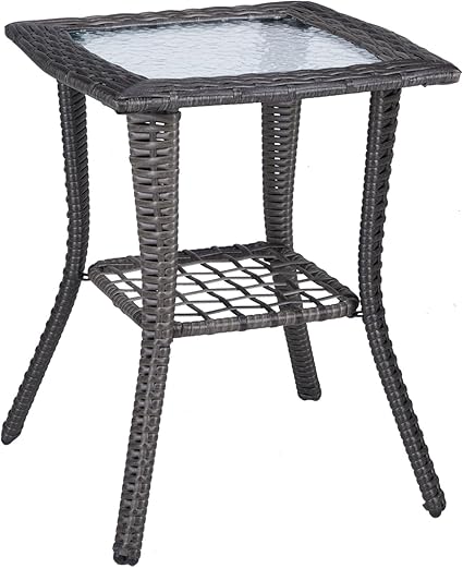 VINGLI Outdoor Side Table with Storage Wicker Patio Side Table, Tempered Glass Top End Table for Balcony Porch Deck (Grey)