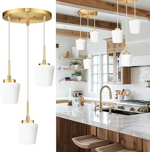 3-Light Pendant Light Fixtures, Brushed Gold Dining Room Light Fixture Over Table, Adjustable Kitchen Island Lighting with Milk White Glass, Farmhouse Hanging Light Fixture, AD-22004-3P-GD