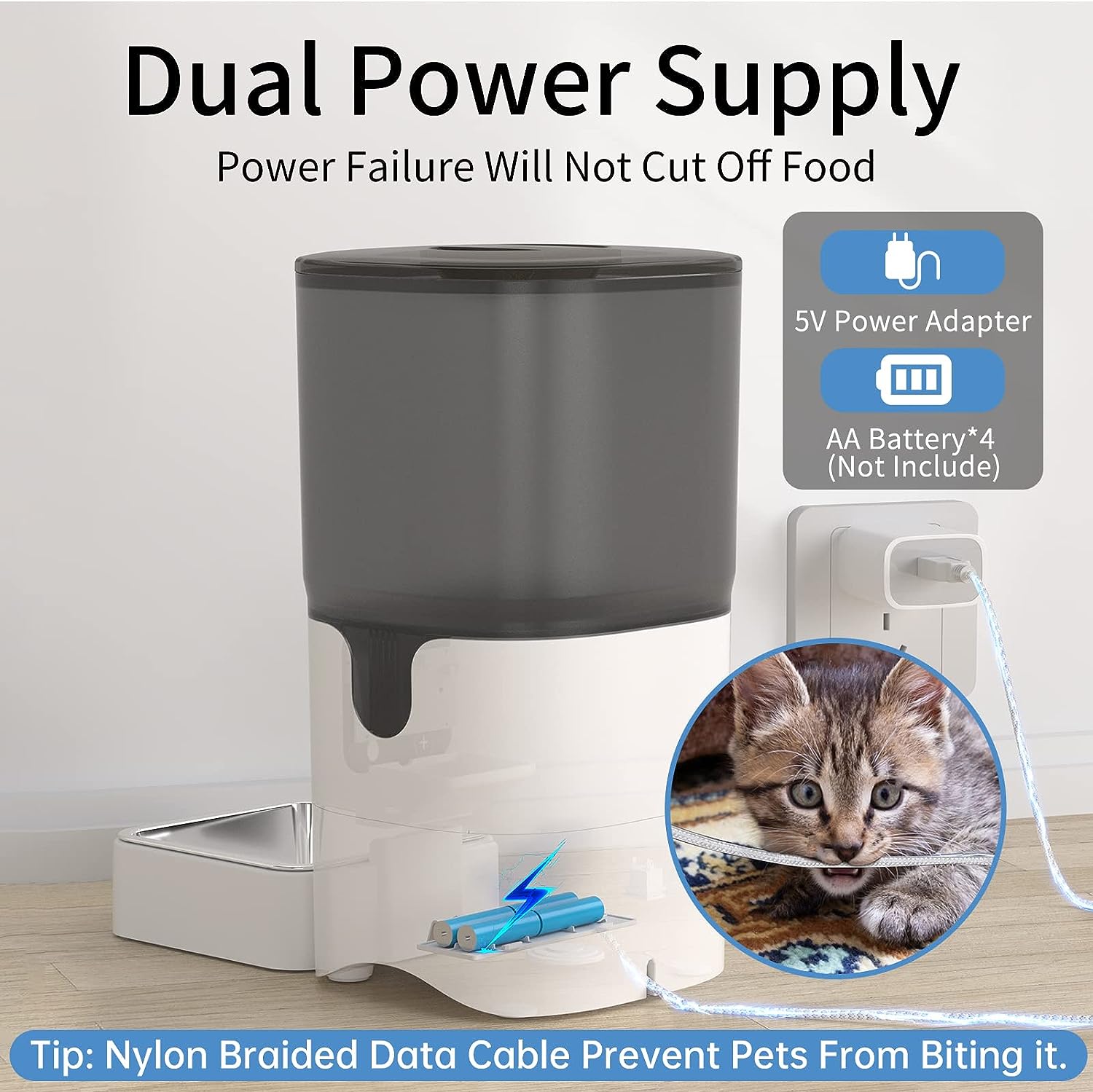 • Easy to Clean ( Detachable ) : The automatic cat food dispenser (BPA-Free) has a removable food tank and stainless steel bowl. This provides easy cleaning of the food tank and stainless steel bowl ( Dishwasher Safe ), as well as a healthy and hygienic feeding environment. Our cat feeders not only focus on how to reduce the feeding workload of pet owners, but also care about the hygiene of pets in feeding.