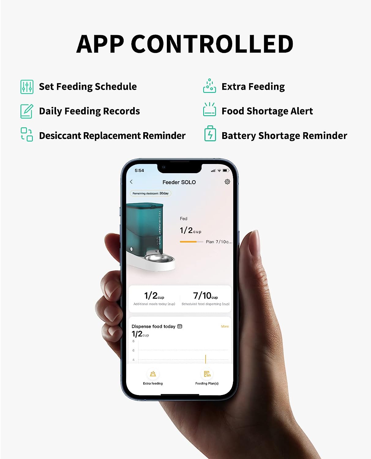 • Smart Notifications and Alerts: With App connection, the smart feeder will alert you when the food tank is empty, the battery is low or you need to replace desiccant bag.