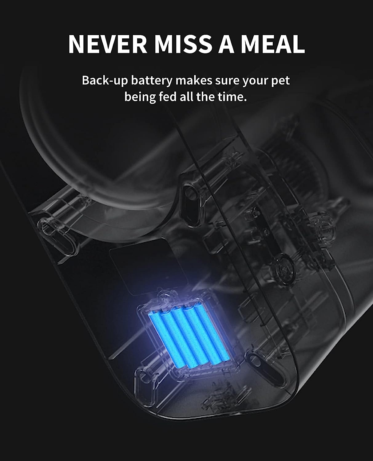 • Never Miss a Meal with Dual Power System: The automatic pet feeder comes with a power adapter and can also be powered with back-up 3A batteries to prevent power outage (battery not included), ensuring scheduled feeding is consistent.