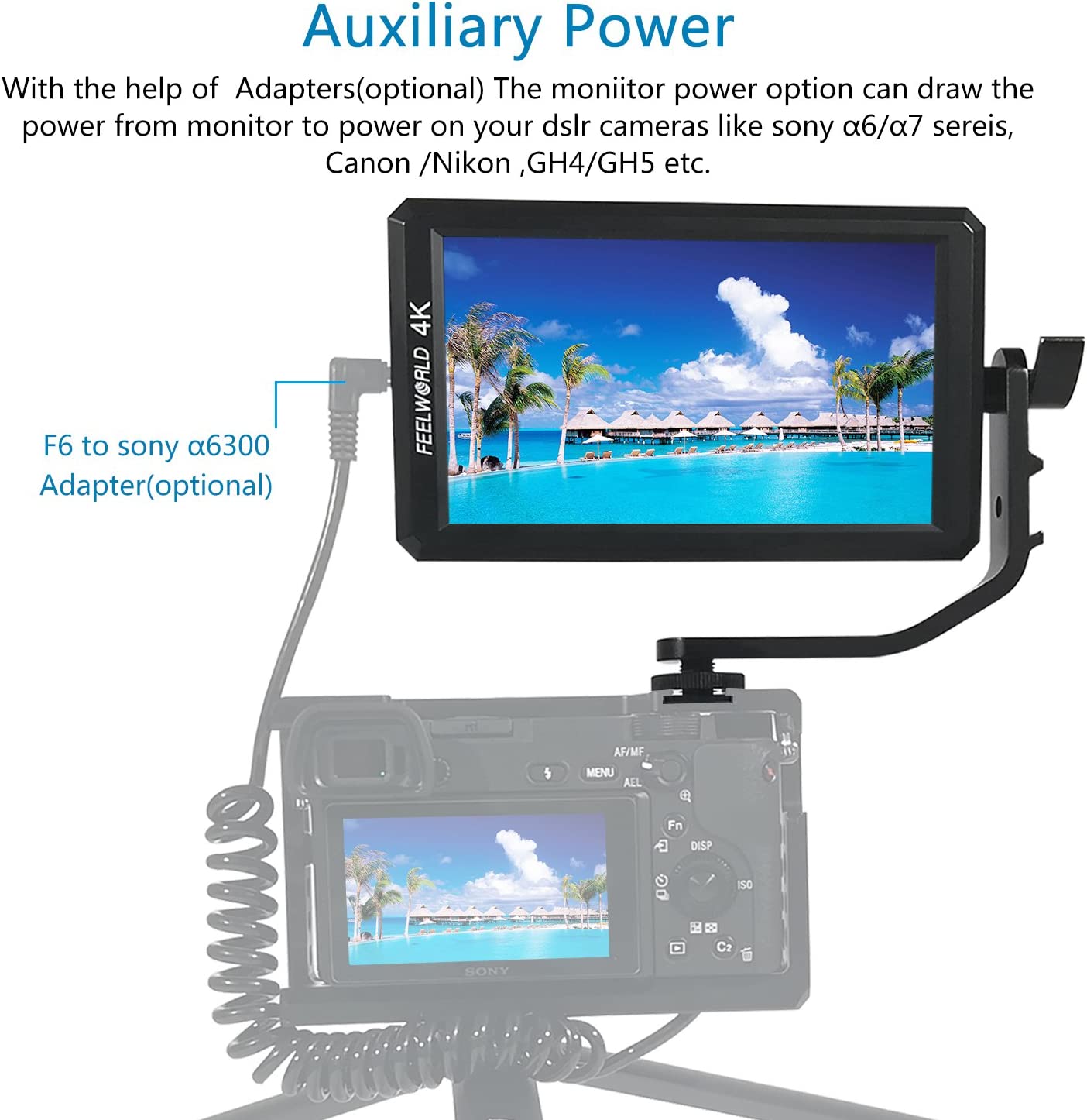 FEELWORLD F6+Battery+ Integrated Battery Charger + Micro&Mini HDMI Cords 5.7Inch FHD IPS On Camera 4K HDMI Monitor with Swivel Arm and 8V DC Power Output