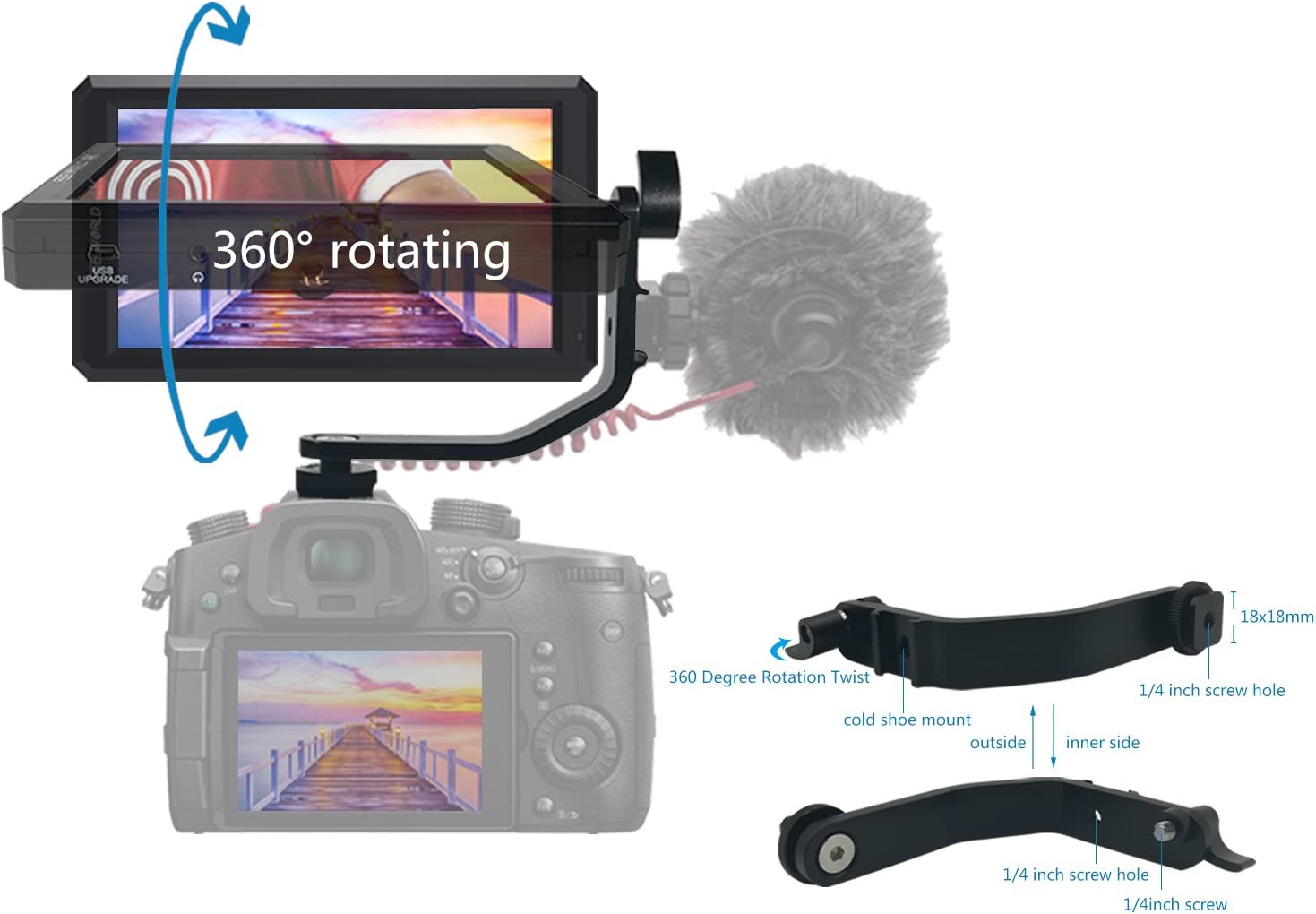 • [Swivel Arm] Tiny smart swivel arm which can mount on camera hot shoe and adjust the viewing angels of the monitor.There is a clod shoe on the side of the arm which can attach the microphone or other on camera staff.