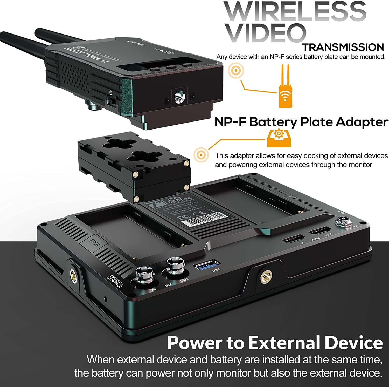• Power to External Device: When external device and battery are installed at the same time,the battery can power not only monitor but also the external device. Any device with an NP-F series battery plate can be mounted.(The device can be installed with two batteries at the same time).
