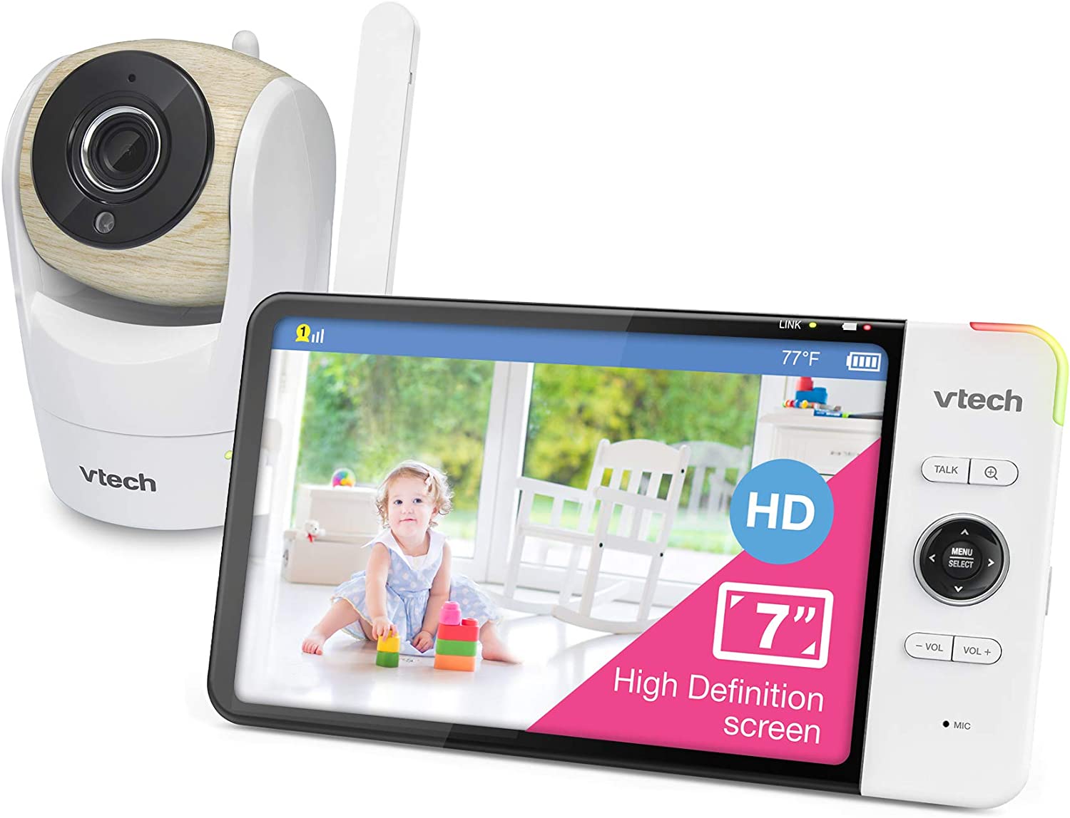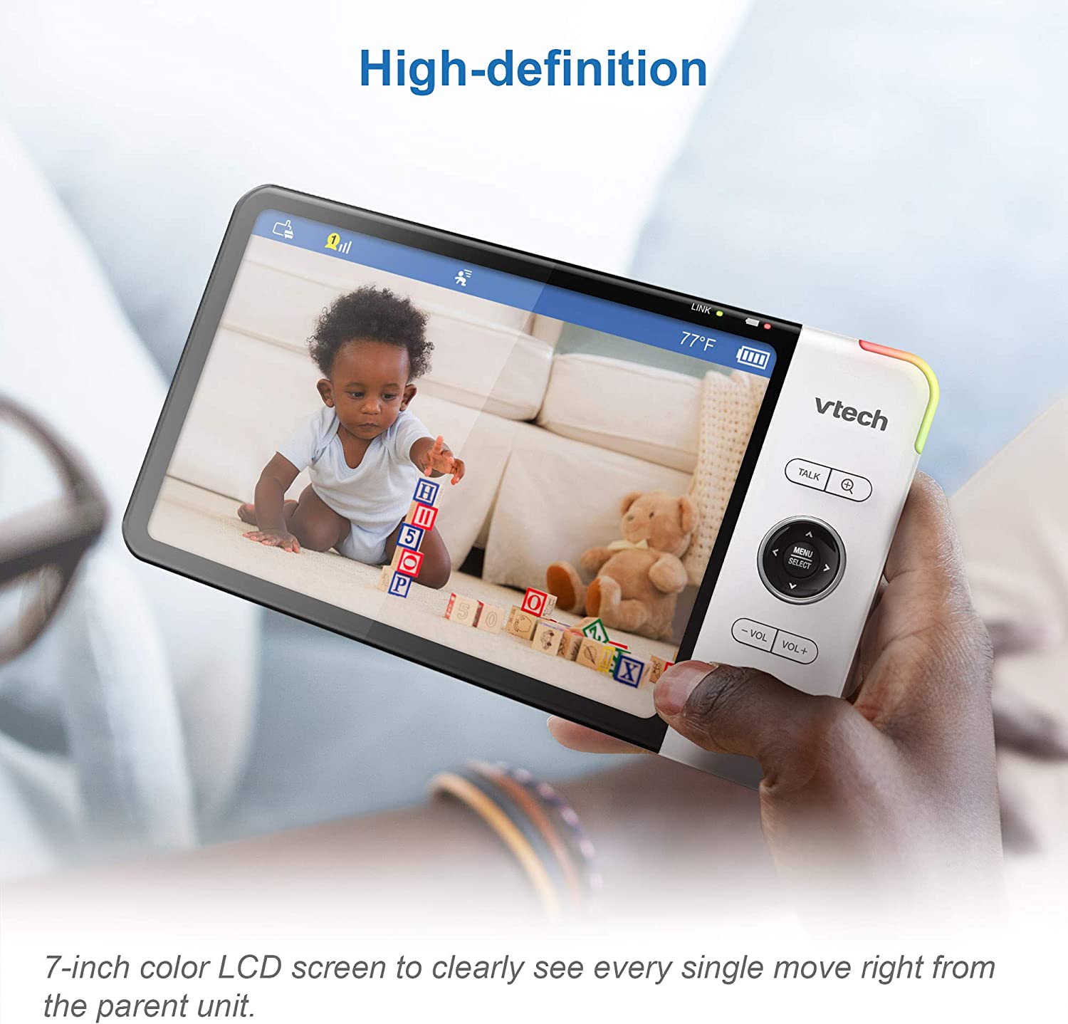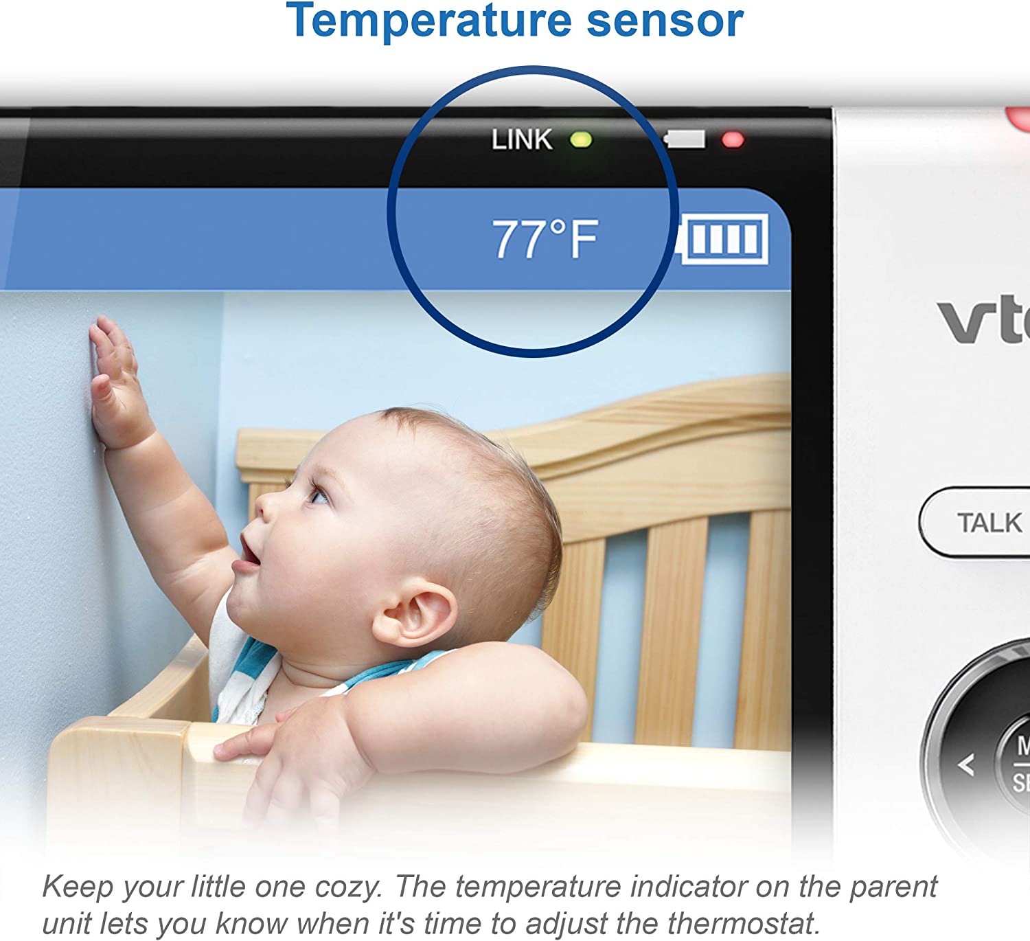 The VTech VM919HD Video Baby Monitor allows you to check in on your little one on the industry's largest 7" parent unit in 720p High Definition. Enjoy the crisp and True-Color videos in a large screen with 110 degrees wide angle, thanks for the monitor system's state of the art COMS image sensor. Plug & play, the monitor's parent unit and camera are configured for local monitoring out of box. Intuitive to use, the camera pans up to 270 degrees side-to-side achieving 360 degrees field of viewing, tilts up to 100 degrees up and down, and zooms up to 4 times from the parent unit. Featured great features such as 2 way audio talk, 4 soothing sounds including white noise and a trickling stream, 5 lullabies that play right from the camera unit to help baby sleep tight. Even after dark, you'll be able to see your baby clearly thanks to automatic infrared night vision in HD clarity. The parent unit's screen is sound activated which be turned off to save power until it senses baby's cry or reaching your preset VOX level. Plus the built-in temperature sensor will let you know with an alert if the nursery is getting too hot or cold so you can adjust the thermostat.