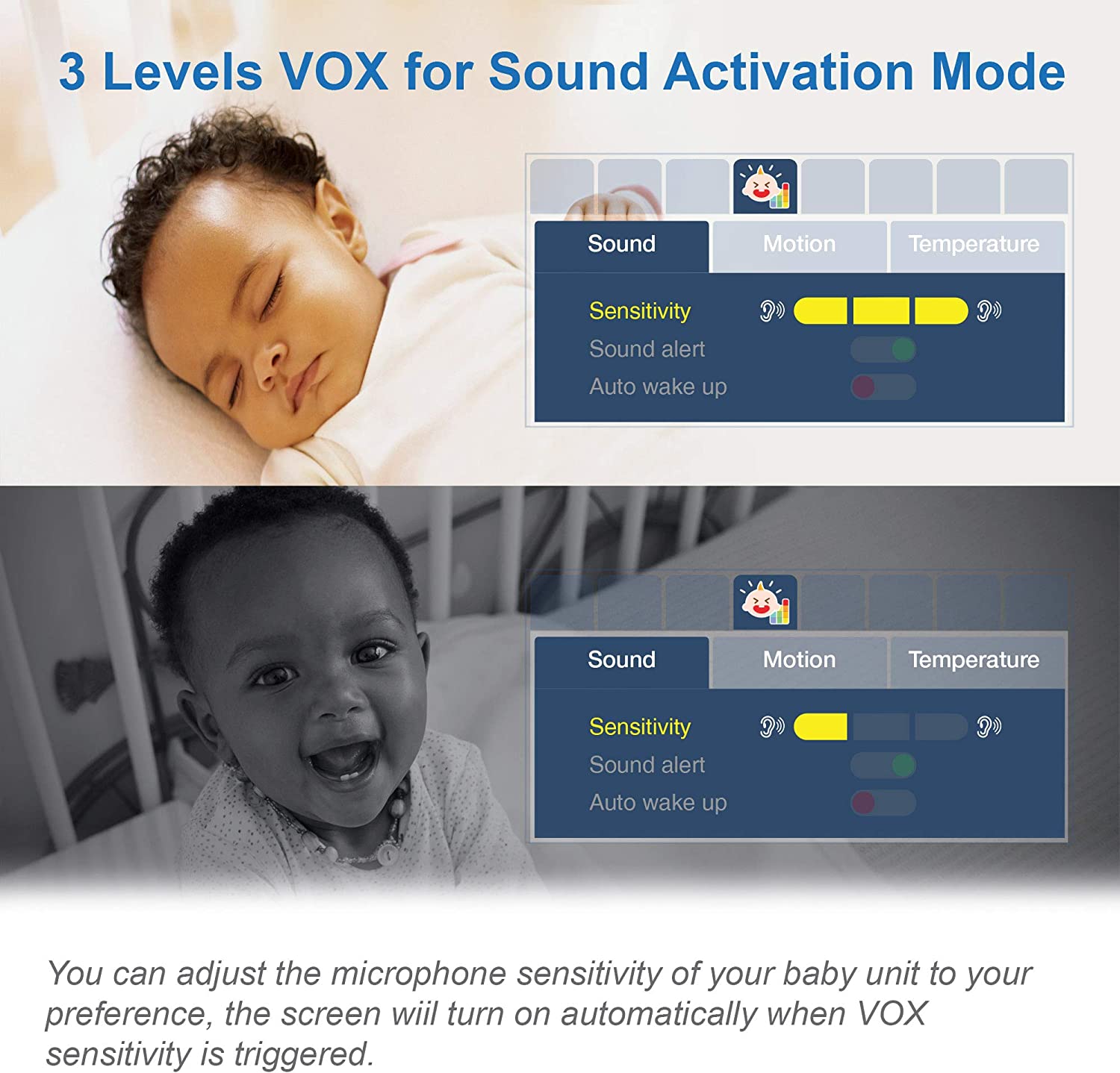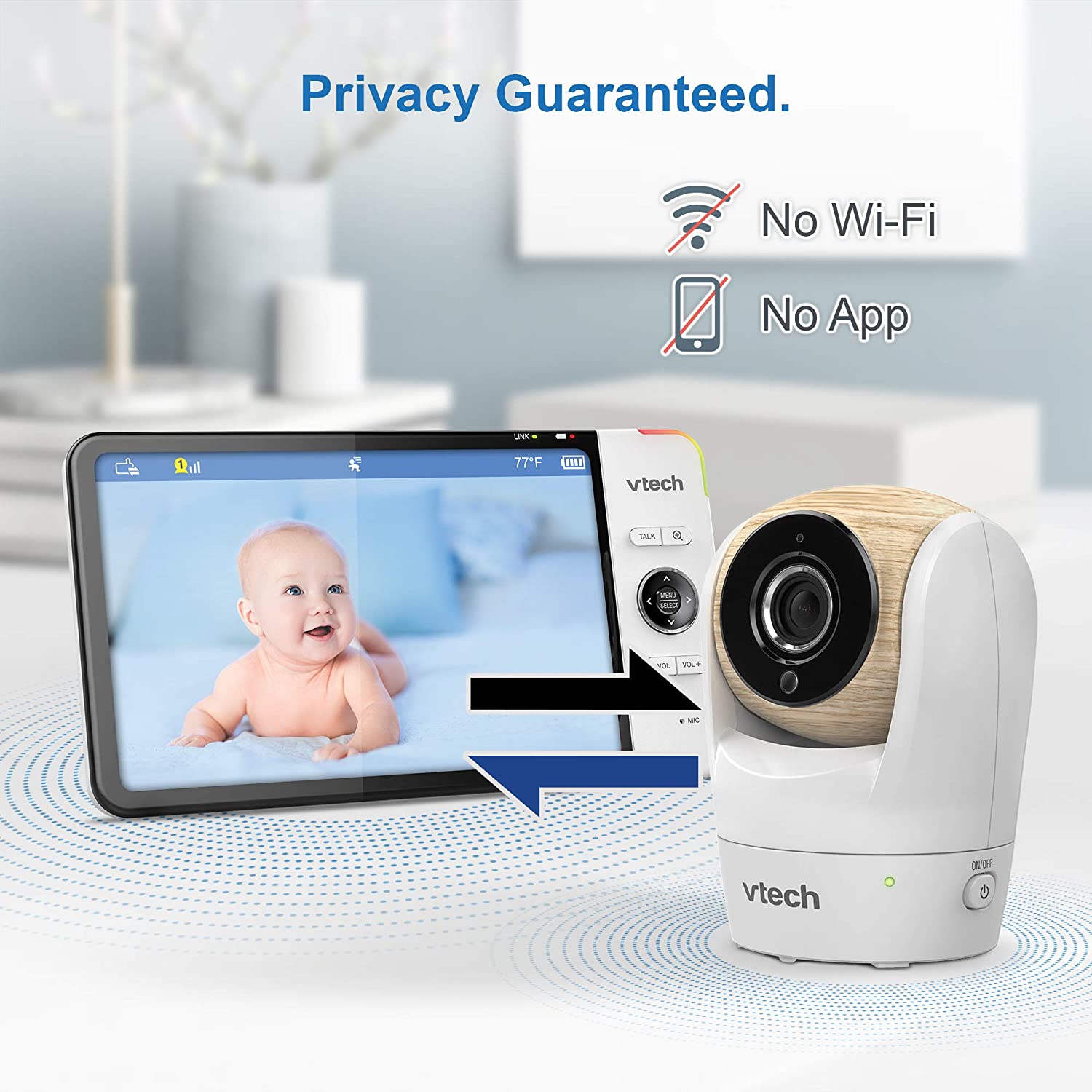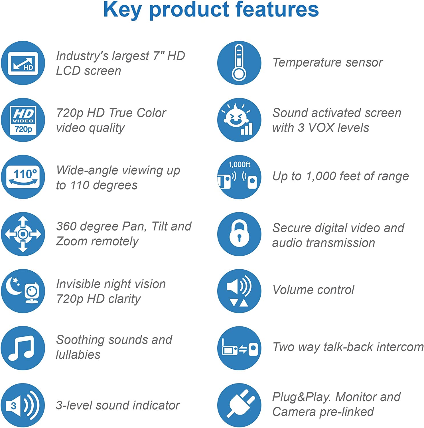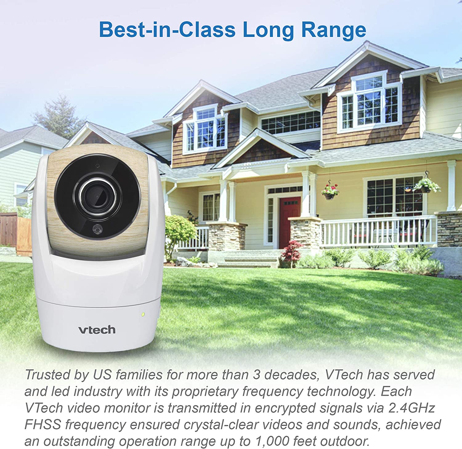The VTech VM919HD Video Baby Monitor allows you to check in on your little one on the industry's largest 7" parent unit in 720p High Definition. Enjoy the crisp and True-Color videos in a large screen with 110 degrees wide angle, thanks for the monitor system's state of the art COMS image sensor. Plug & play, the monitor's parent unit and camera are configured for local monitoring out of box. Intuitive to use, the camera pans up to 270 degrees side-to-side achieving 360 degrees field of viewing, tilts up to 100 degrees up and down, and zooms up to 4 times from the parent unit. Featured great features such as 2 way audio talk, 4 soothing sounds including white noise and a trickling stream, 5 lullabies that play right from the camera unit to help baby sleep tight. Even after dark, you'll be able to see your baby clearly thanks to automatic infrared night vision in HD clarity. The parent unit's screen is sound activated which be turned off to save power until it senses baby's cry or reaching your preset VOX level. Plus the built-in temperature sensor will let you know with an alert if the nursery is getting too hot or cold so you can adjust the thermostat.