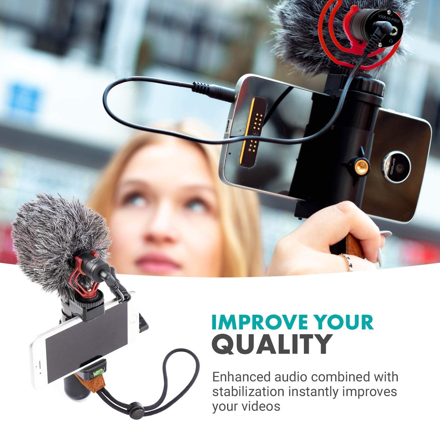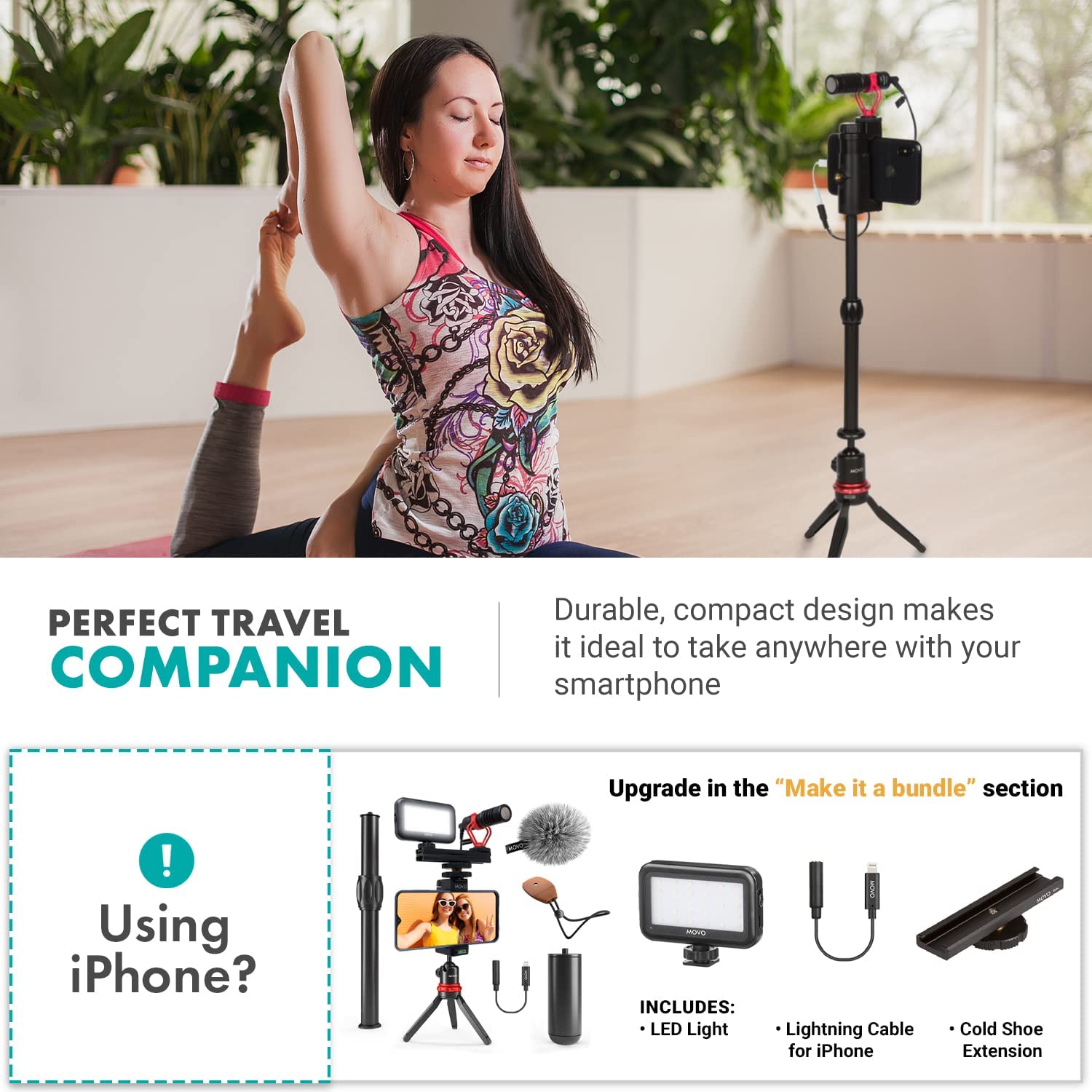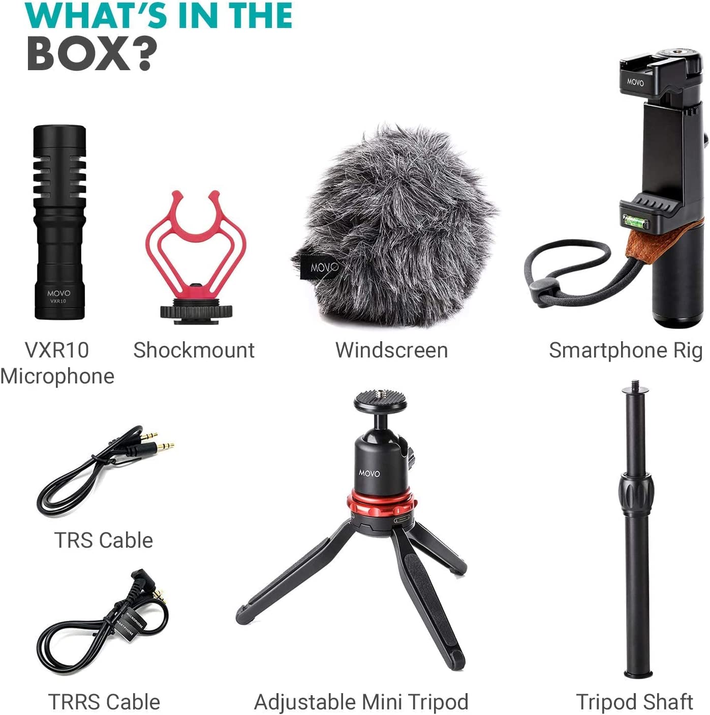 • VXR10+ SMART PHONE VIDEO KIT: Includes the Movo Phone Grip, Mini Tripod, and the VXR10 external microphone for iPhone, Samsung, and more. Perfect YouTuber kit (Lightning Dongle not included)